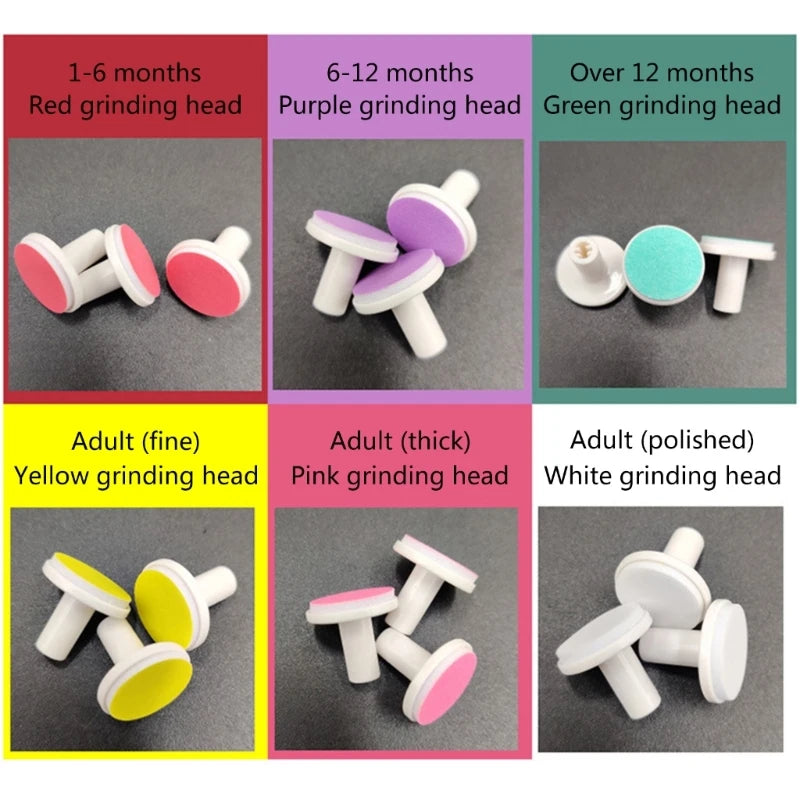 - The difference in color indicates variations in the thickness of the sand particles on the grinding heads, with thicker particles suitable for adults and finer particles ideal for infants and children.