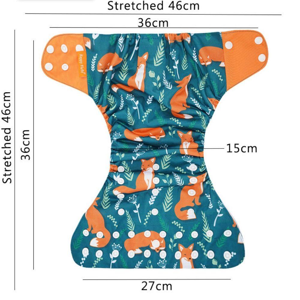 Length of Diaper: 15” in length X 13” in width. One size fits all– you can adjust the diaper to your desired size (S, M, or L) by snapping onto different rows of buttons on the nappy.