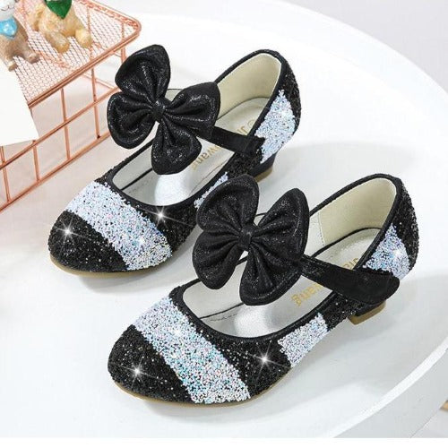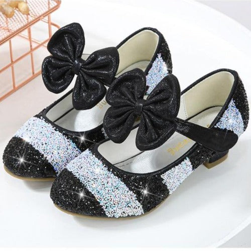 - Candy-colored sequin embellishments all over the shoes with a glittery PU leather bow on the shoe strap.