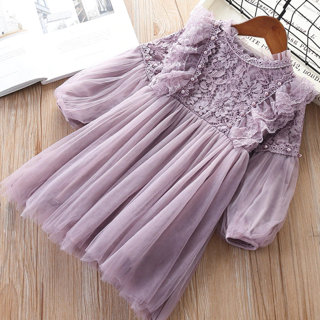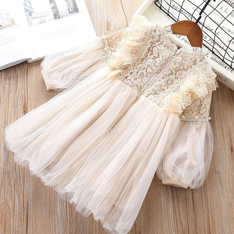 Floral Lace Top and Ruffles Long Sleeve Girl Mesh Dress