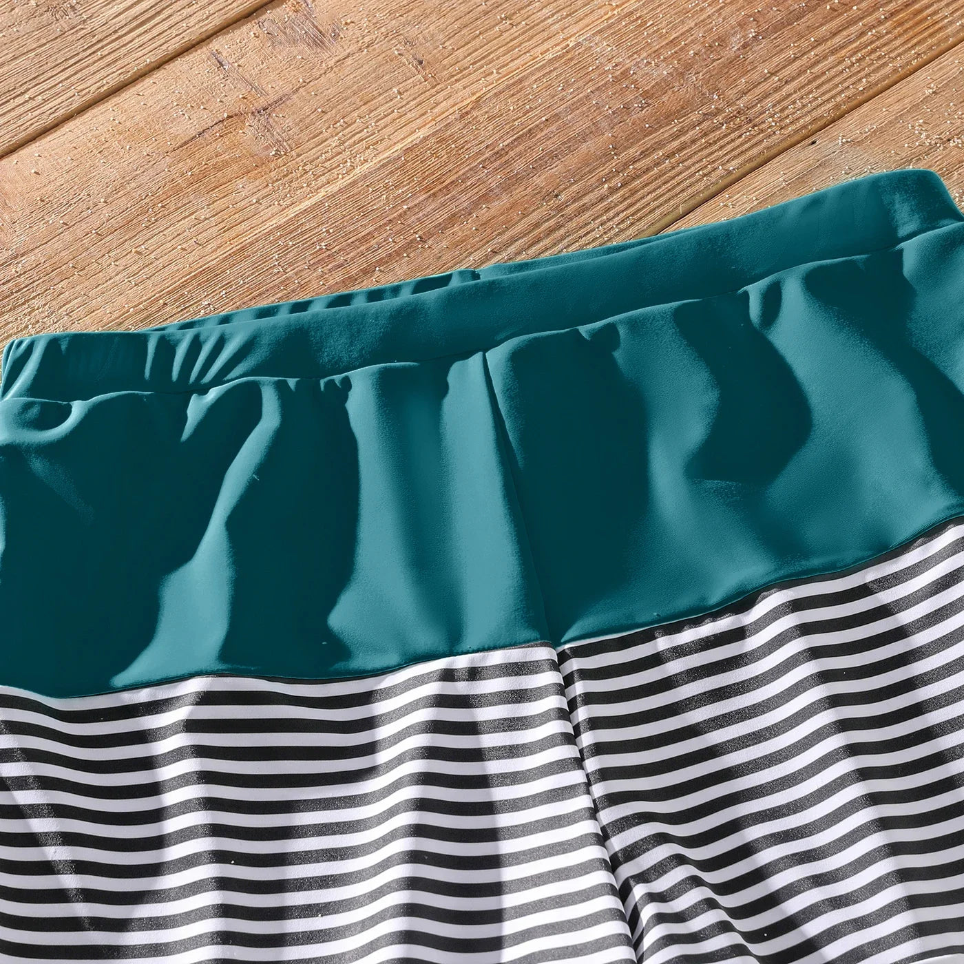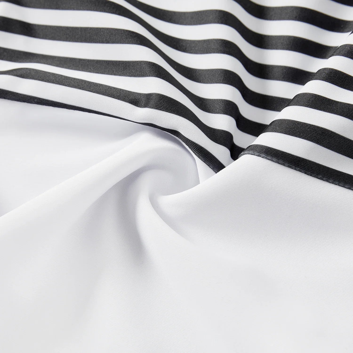- Chic Design: Our swimwear sets feature one-shoulder swimsuits for women and girls, paired with stylish striped trunks for men and boys.