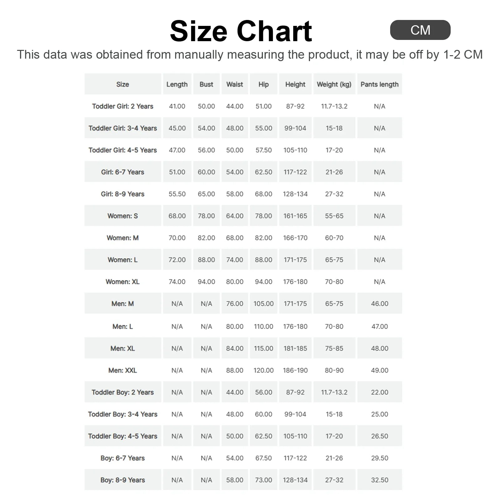 - Size chart: (1 cm = 0.3937 inches)
