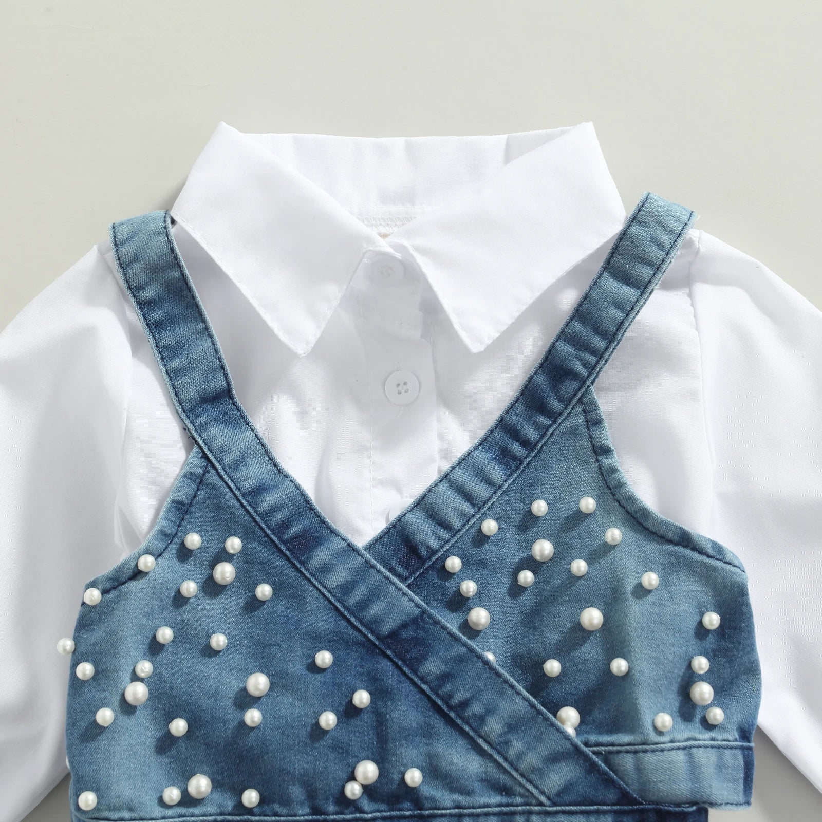 Introducing our Fashion Baby Girl Outfit Set: Long Sleeve Shirt Dress + Beaded Denim Vest