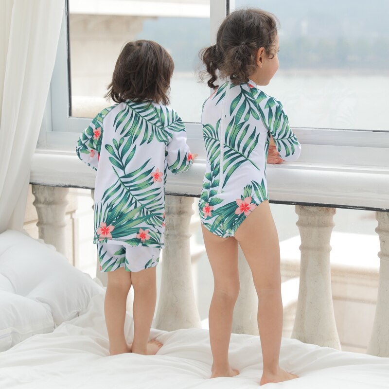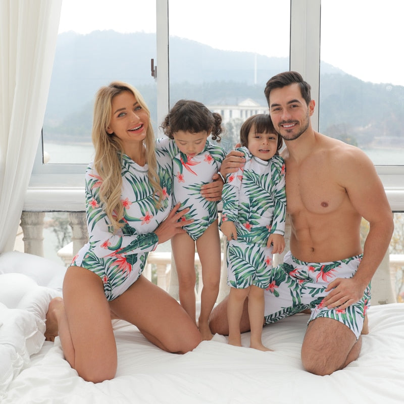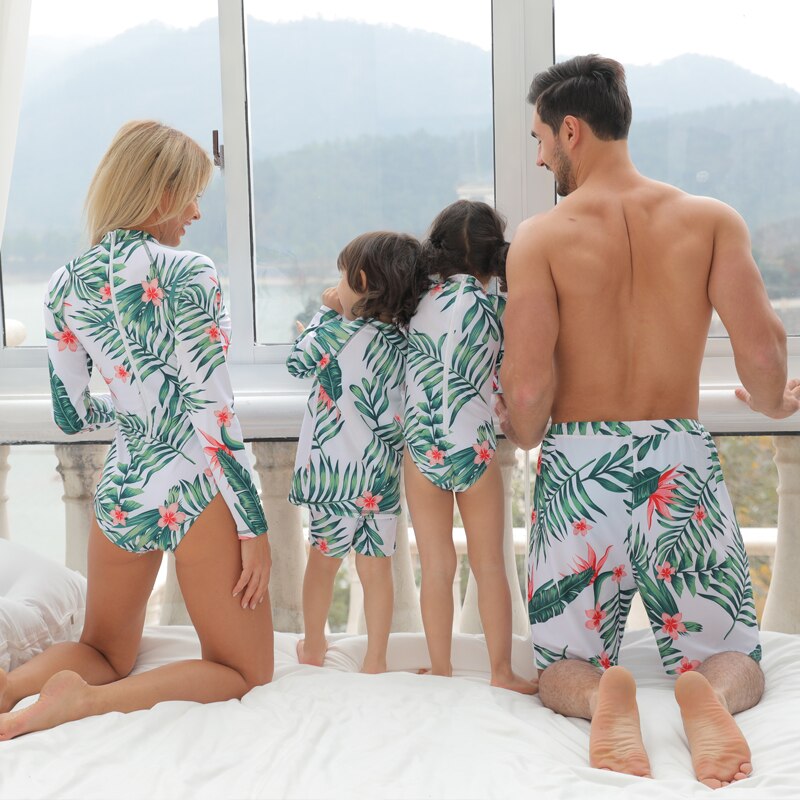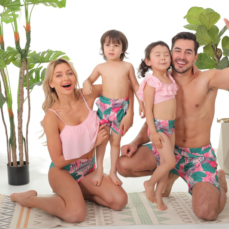 Family swimwear set with enough members: father, mother, son, daughter with gentle colors to create a special for the family when appearing at the pool or going to the beach.
