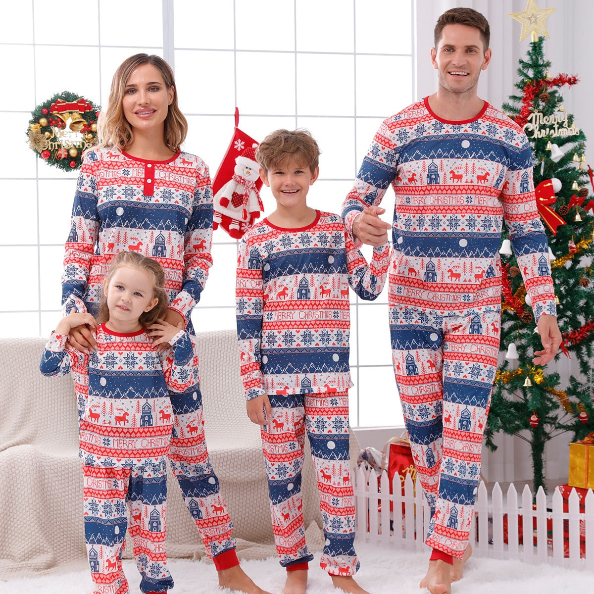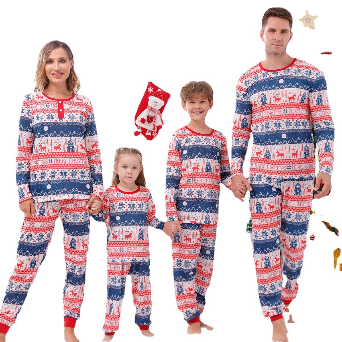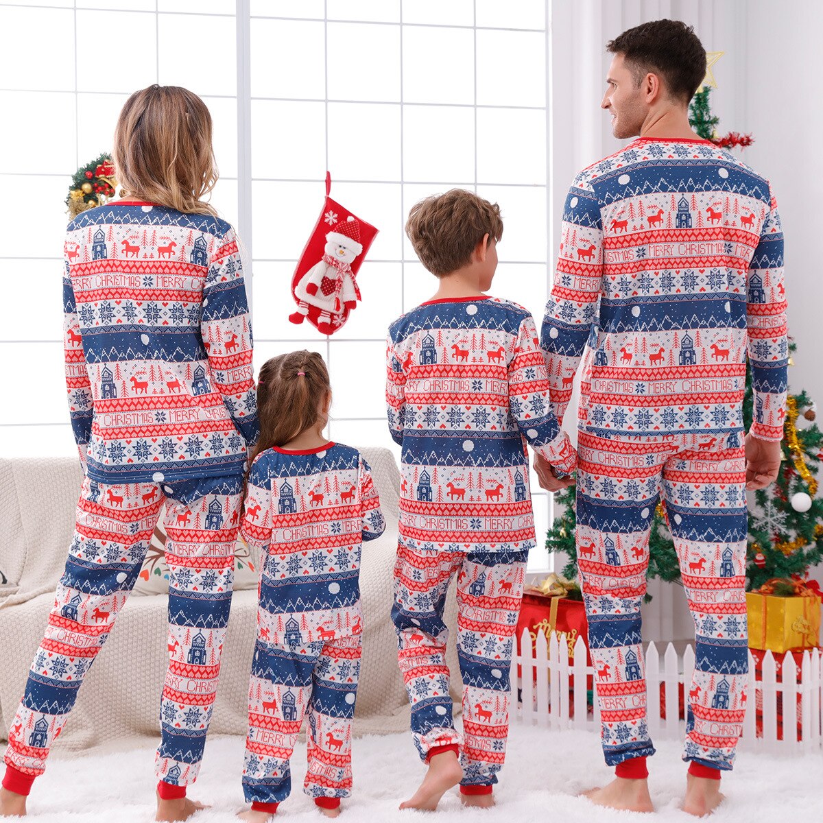 Christmas fashion with unique motifs --- Simple design with a unique Christmas print long-sleeved pullover shirt, combined with trousers to create a lovely new look. These pajamas make all family members charming; You can't miss these amazing clothes.