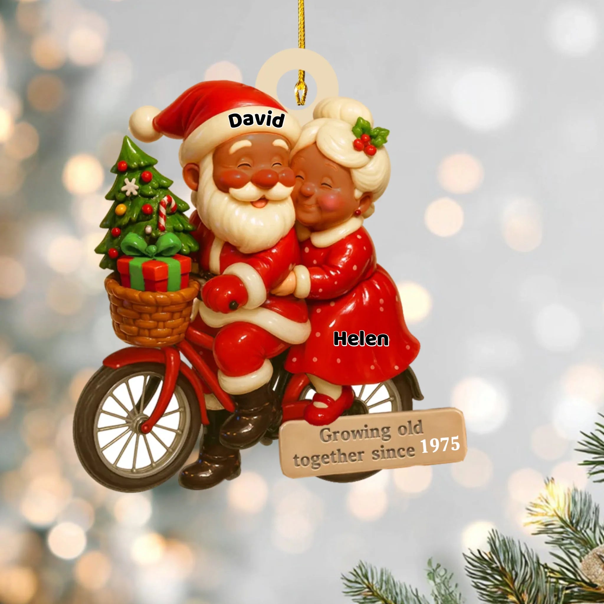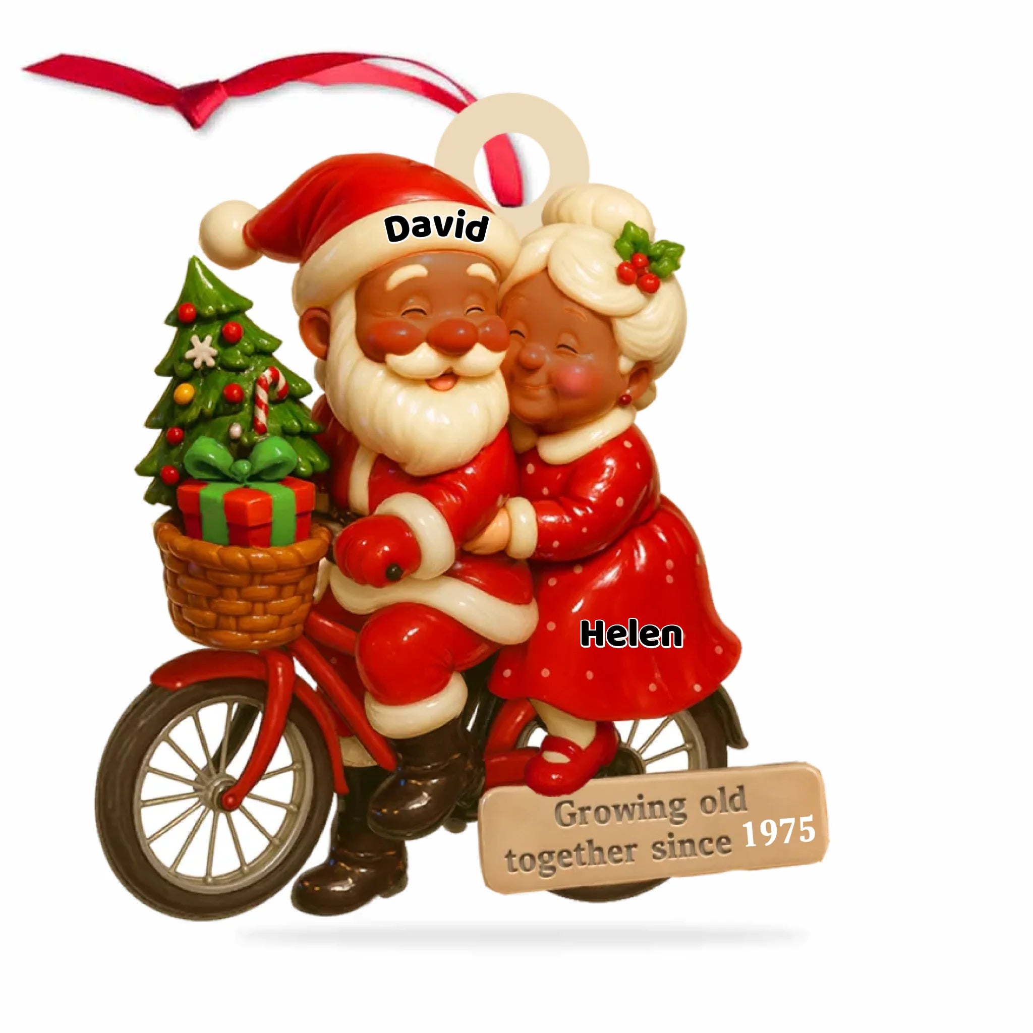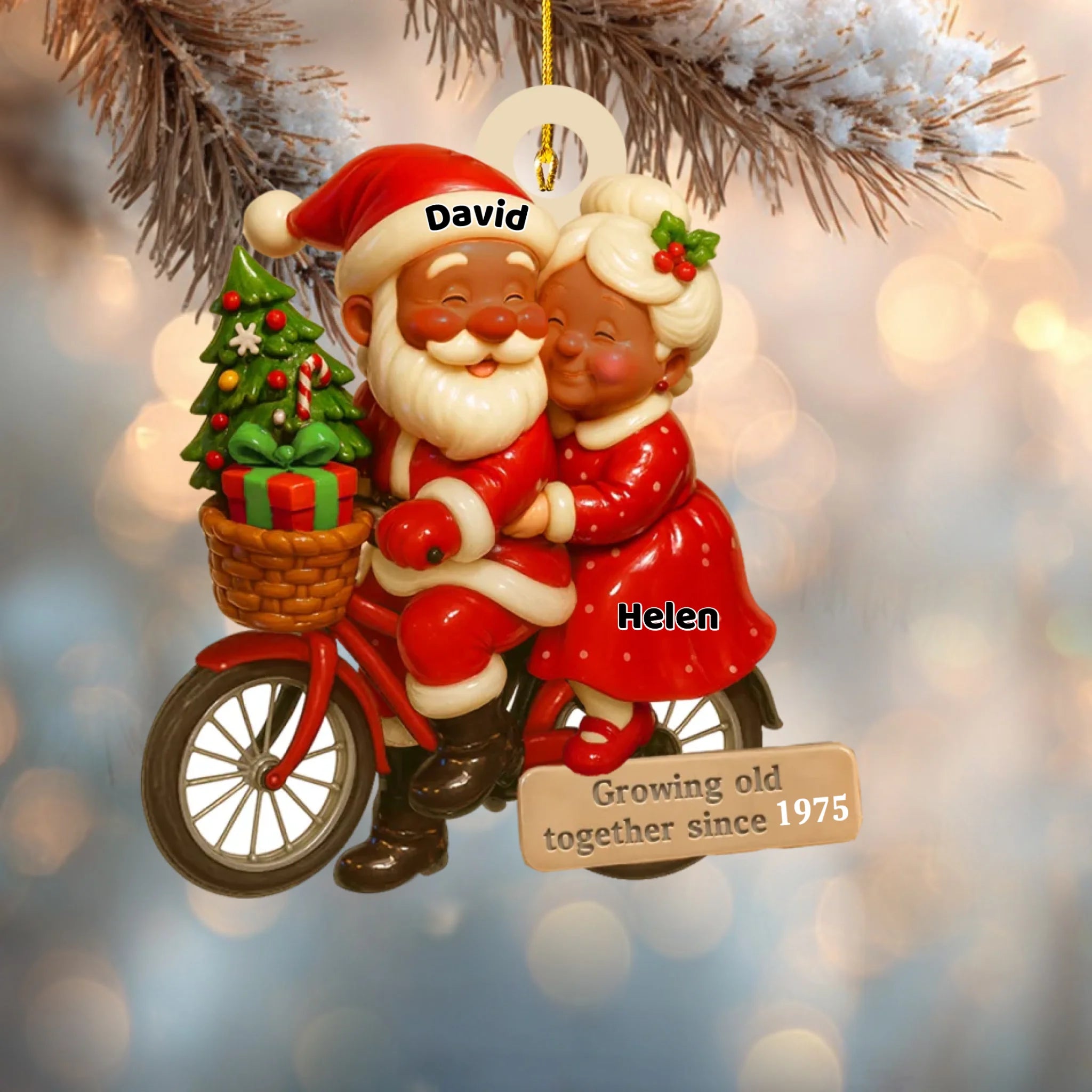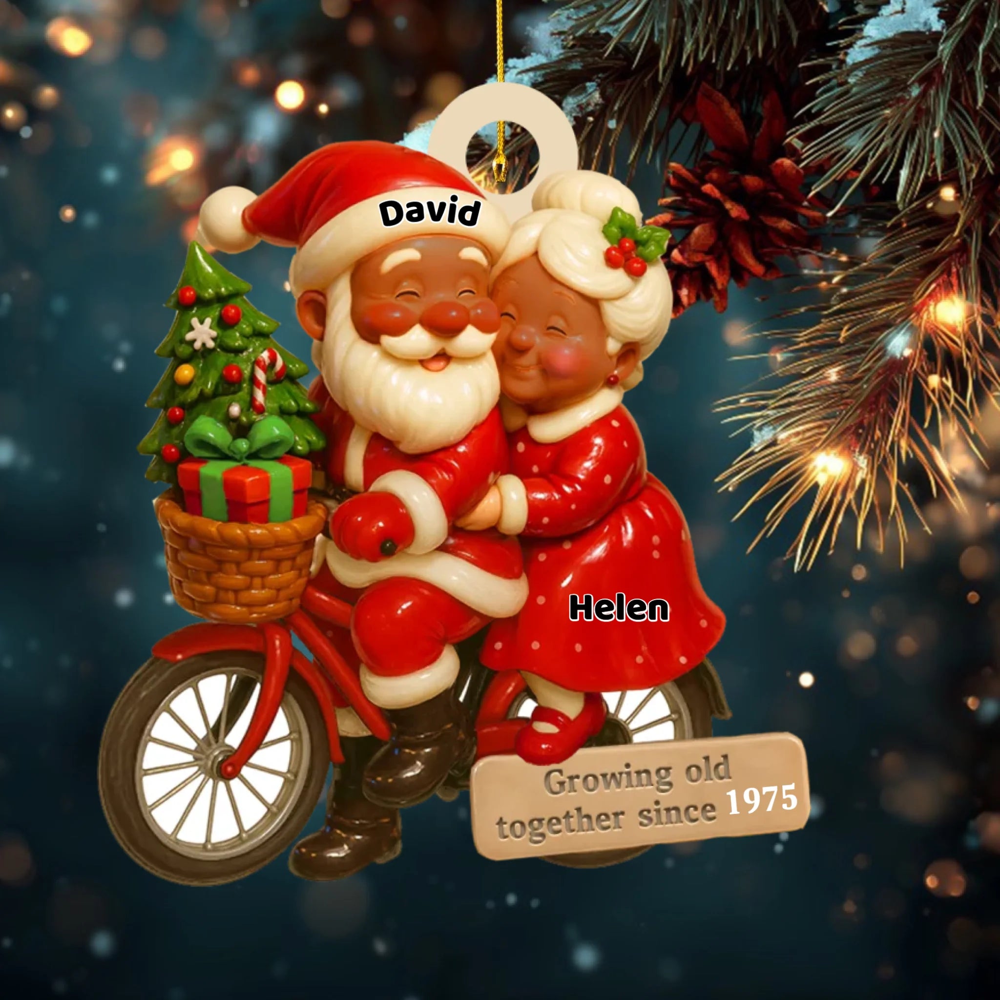 This charming ornament features an adorable Santa and Mrs. Claus couple riding a festive bicycle, carrying a Christmas tree and presents — a perfect symbol of togetherness, laughter, and shared memories through the years. Whether it’s your first Christmas together or your fiftieth, this personalized decoration is a timeless reminder of your love story.