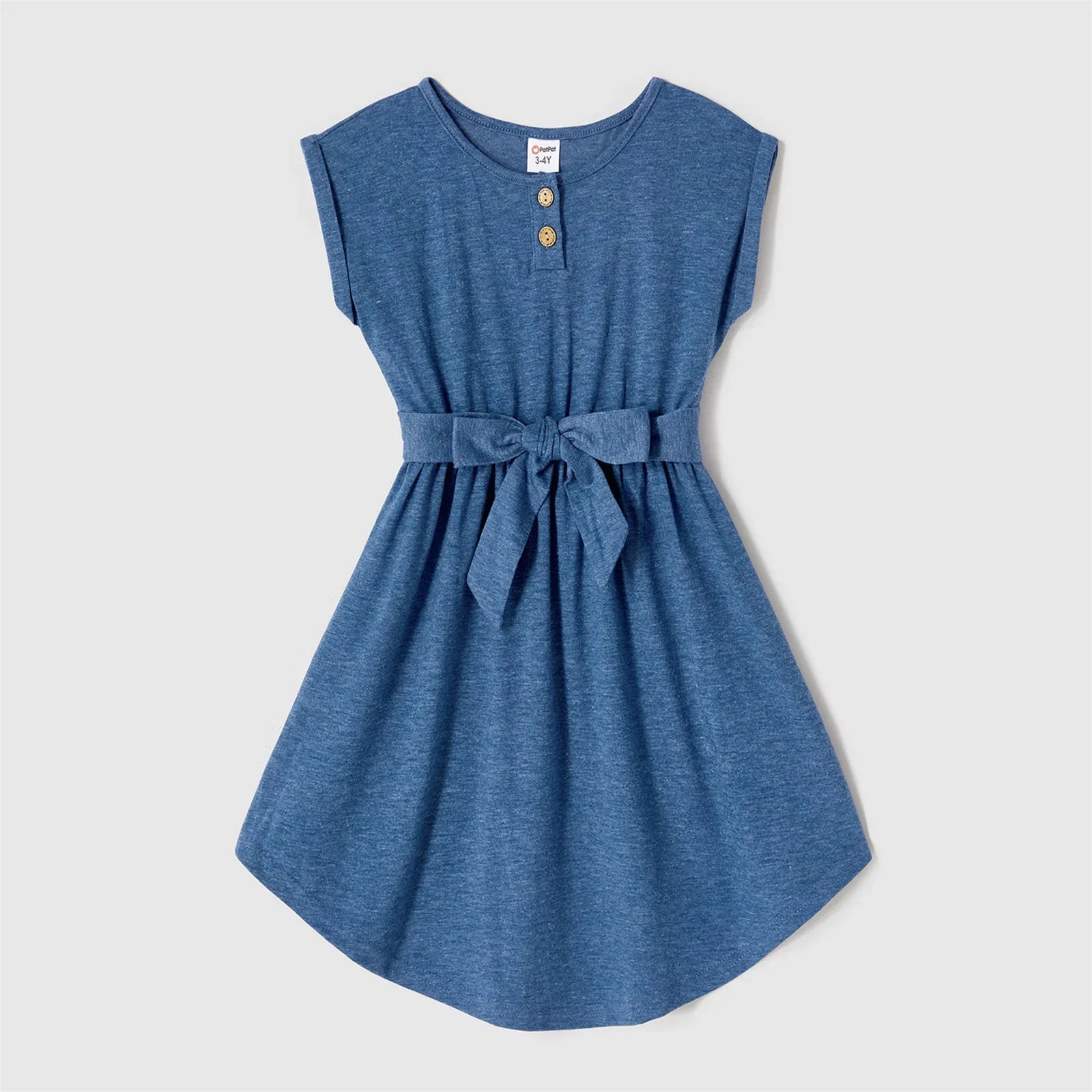 - To keep these matching outfits clean and fresh, simply machine wash and tumble dry. With their crew necklines, cap-sleeve dresses, and short-sleeve t-shirts, these sets offer a comfortable and relaxed fit for everyone. The dresses feature a belted design and front buttons, while the romper comes with convenient bottom snaps.
