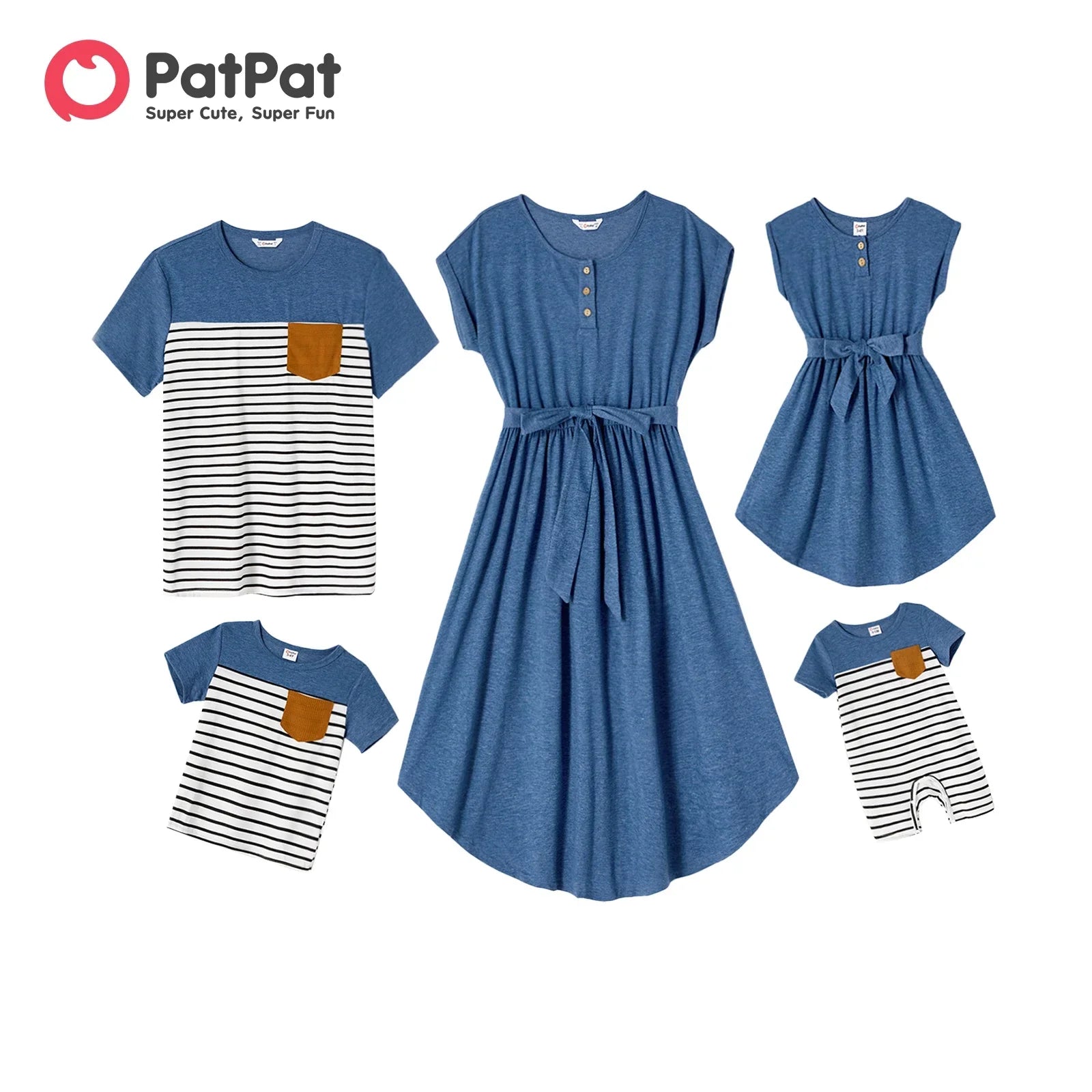 Blue Belted Dresses and Striped T-shirts Sets for Family