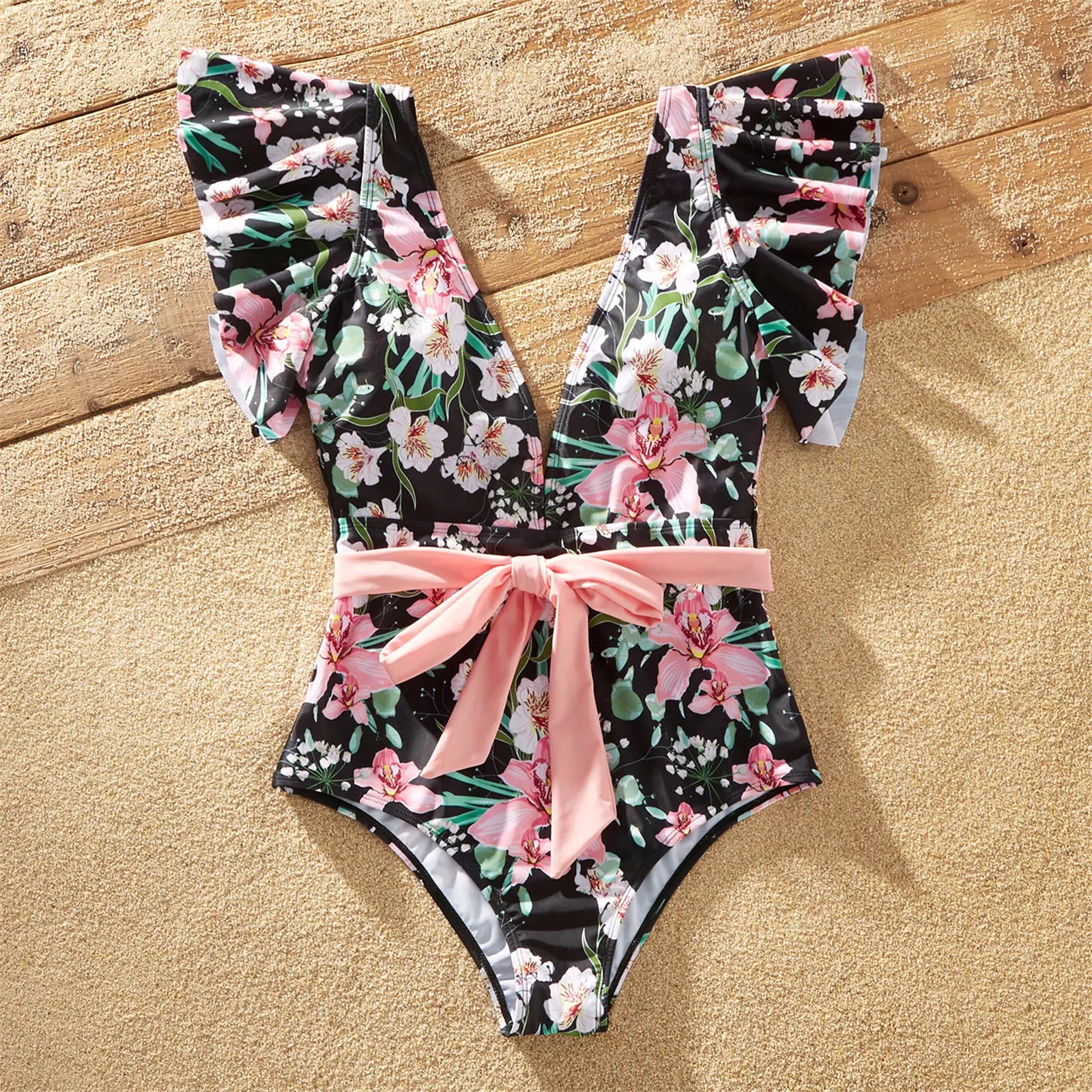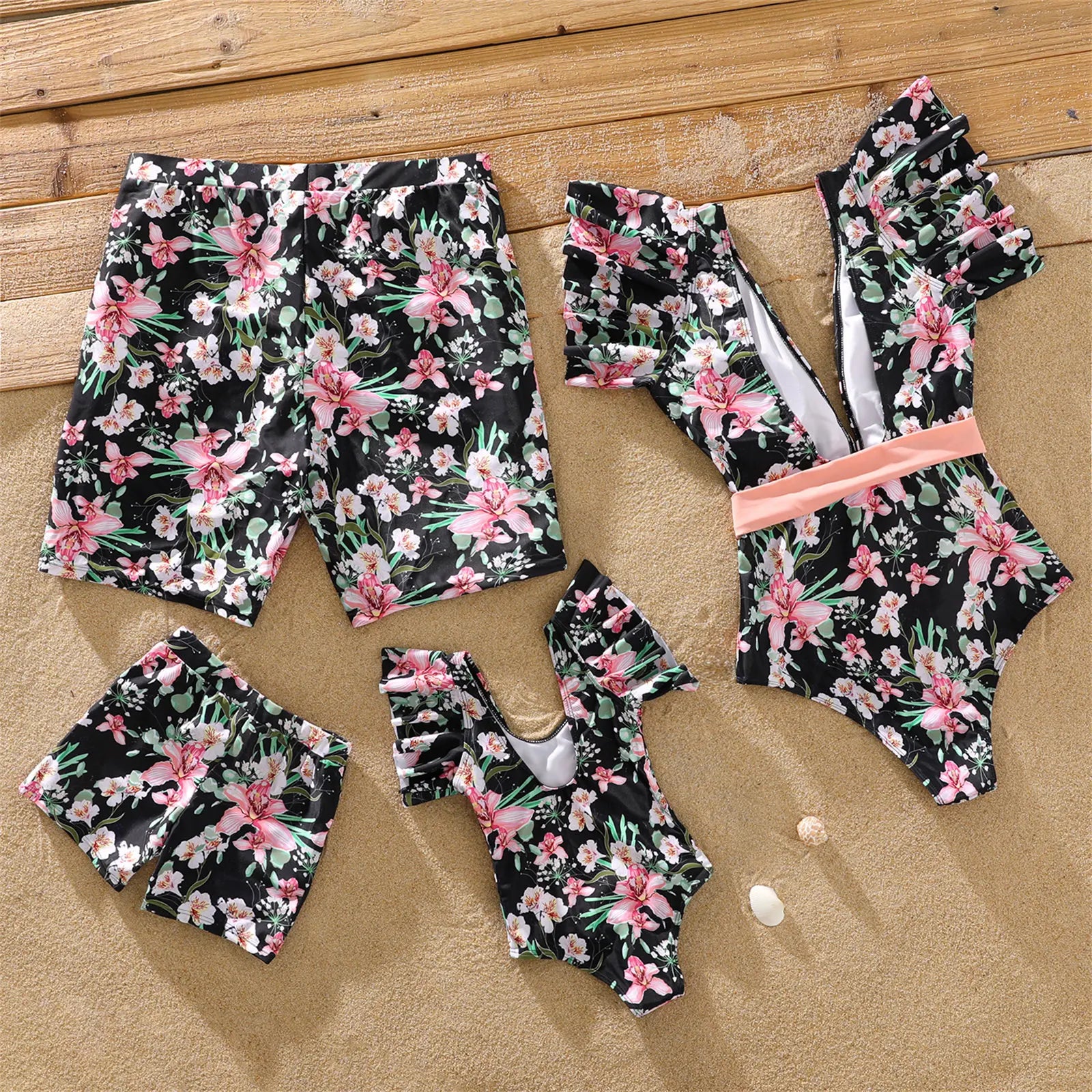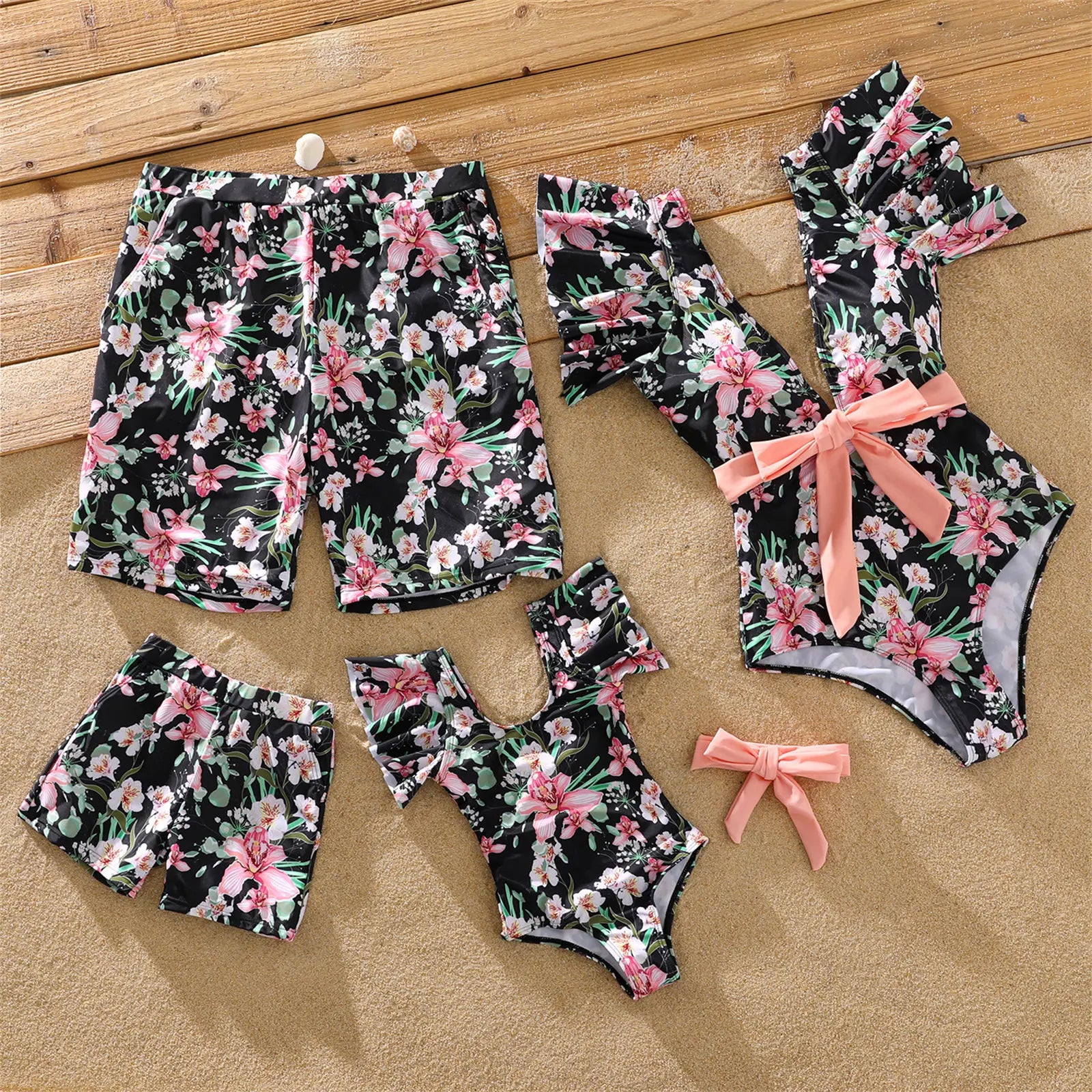 Gear up for unforgettable summer moments with our Family Matching Allover Floral Print Swim Trunks Shorts and Ruffle-Sleeve Belted One-Piece Swimsuit. Whether you're hitting the beach or lounging by the pool, this matching set is a must-have for the whole family.