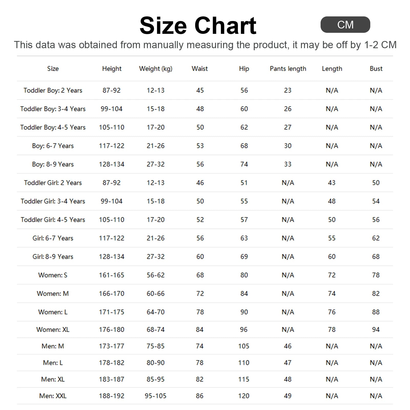 - Size chart: (1 cm = 0.3937 inches)