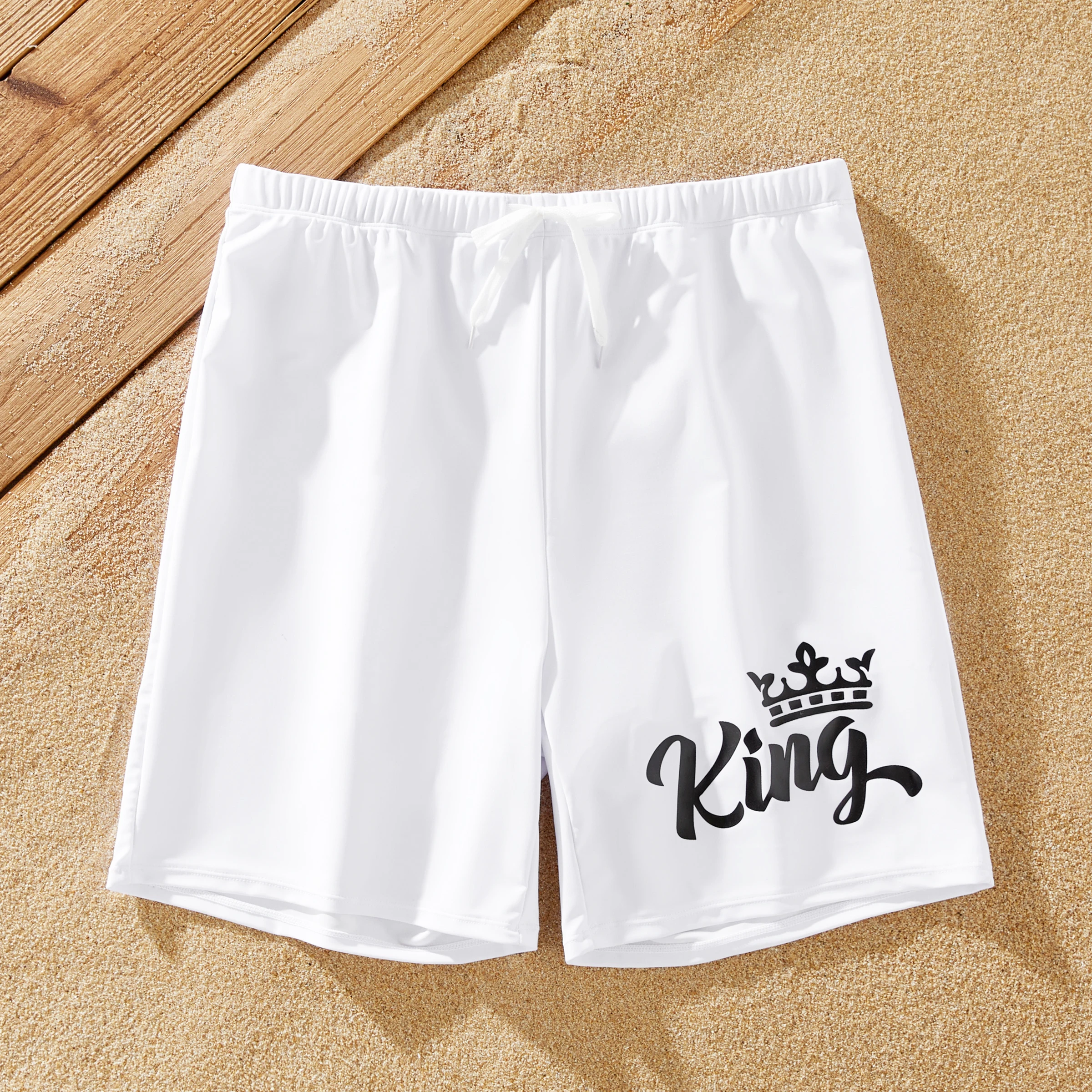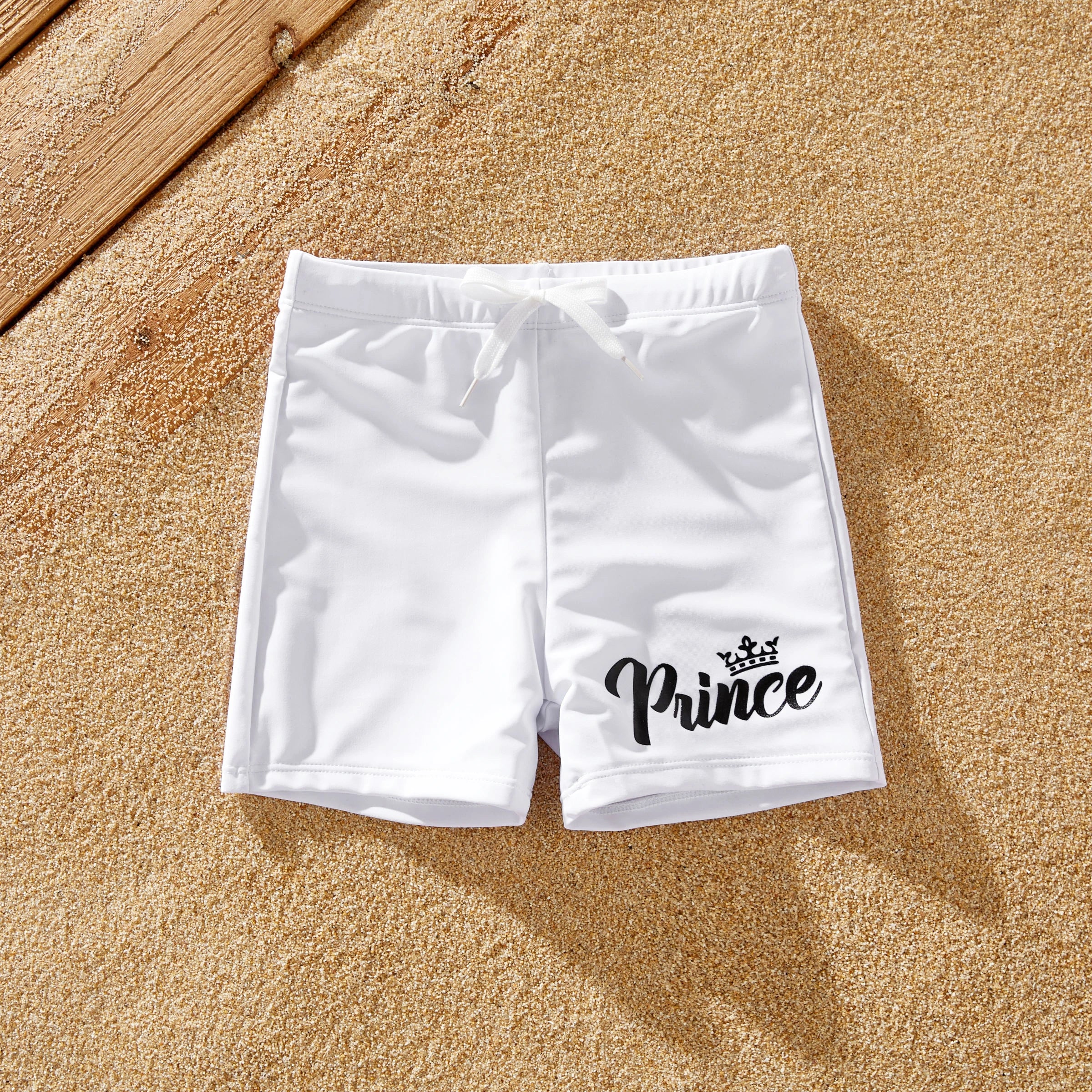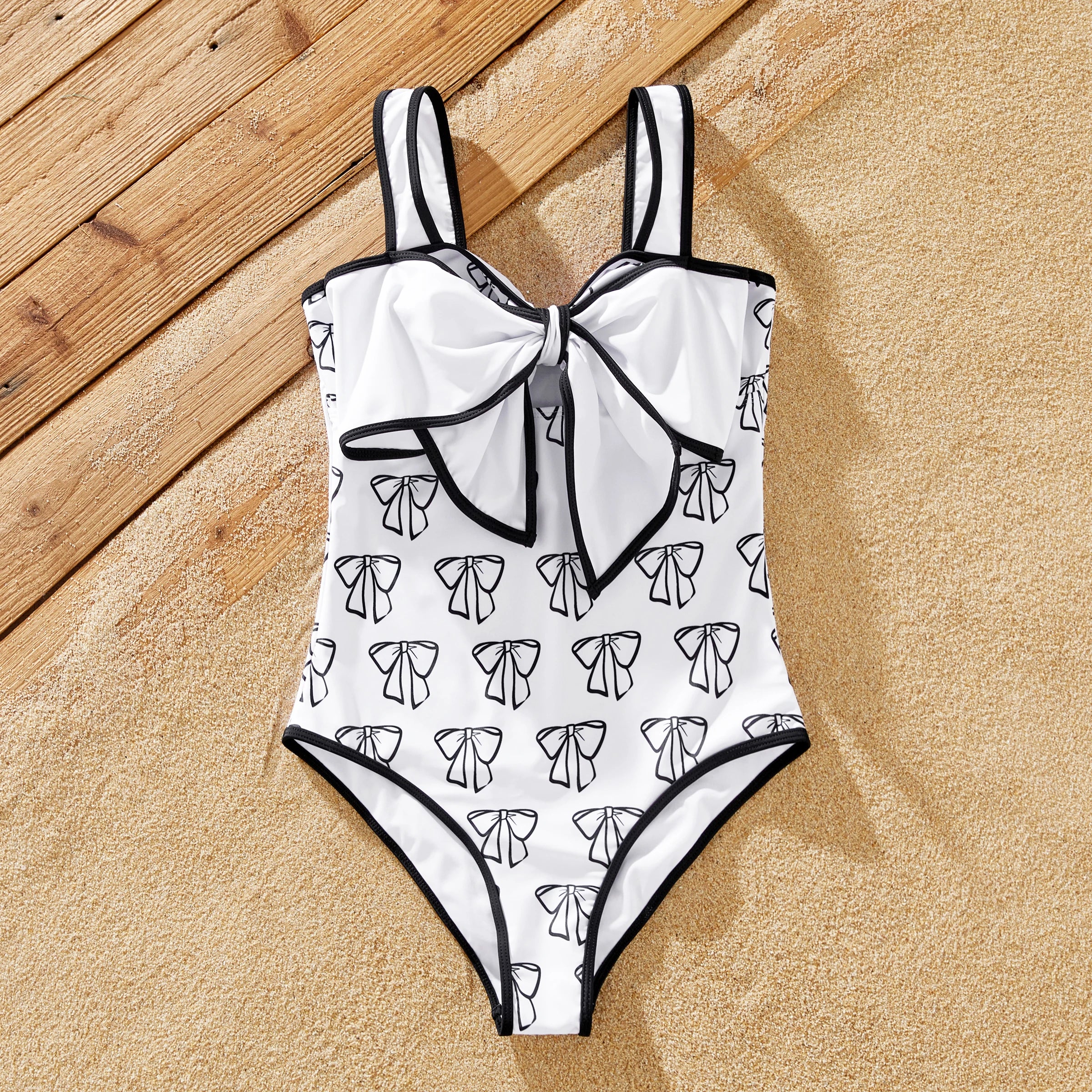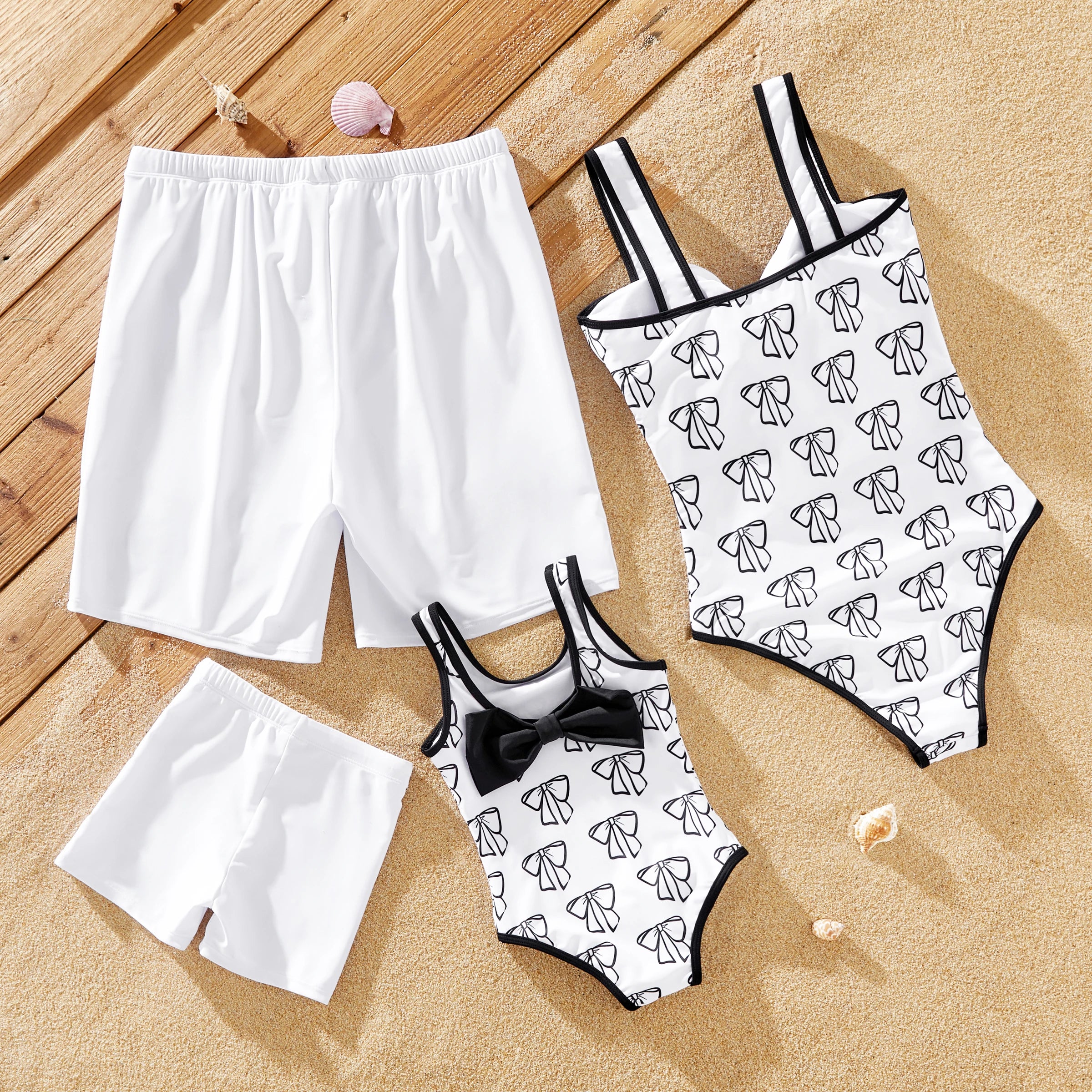 Product Introduction: Elevate your family's summer style with our exquisite Letter Printed Drawstring Swim Trunks & Bow Pattern Swimsuit Set. Immerse yourselves in the epitome of elegance as you indulge in this beautiful white one-piece swimsuit adorned with a charming bow design. Ideal for outdoor activities, vacations, and parties, this set ensures your family stands out with sophistication.