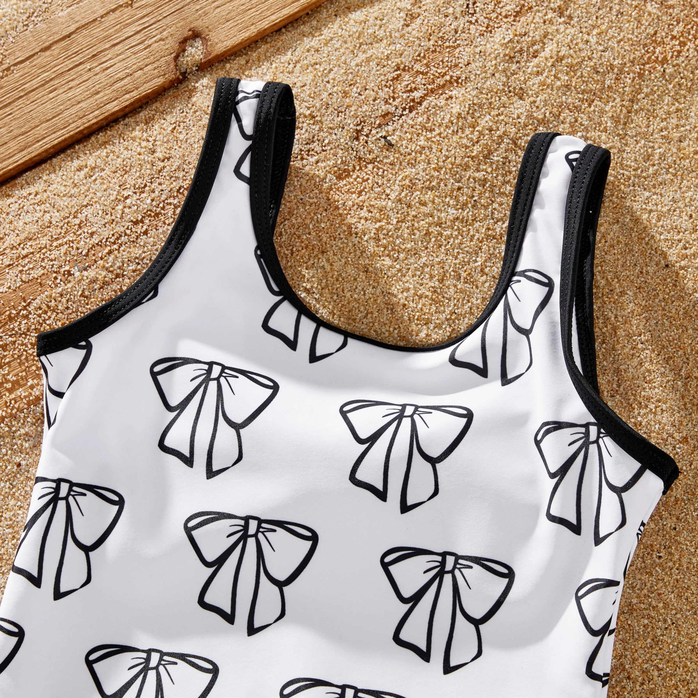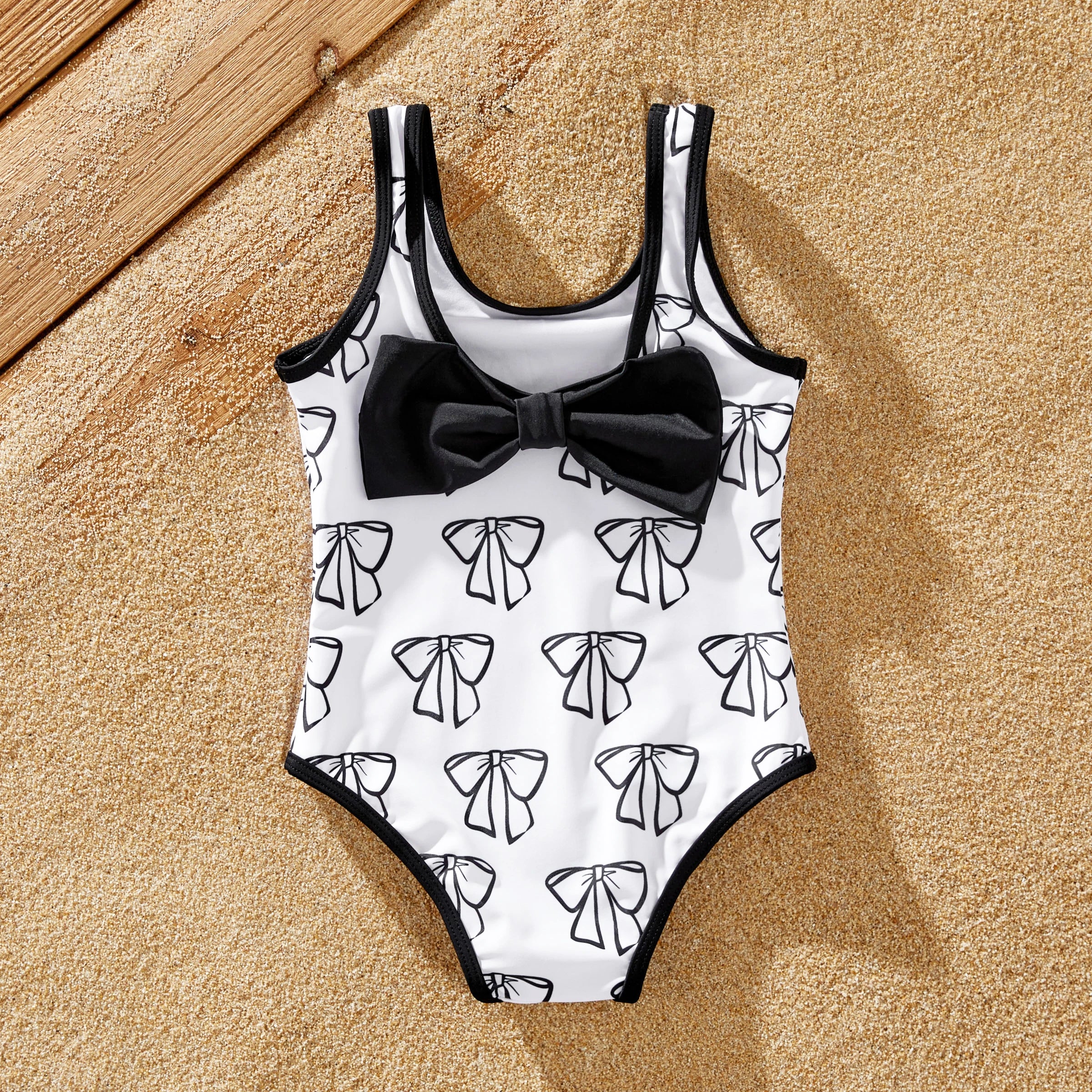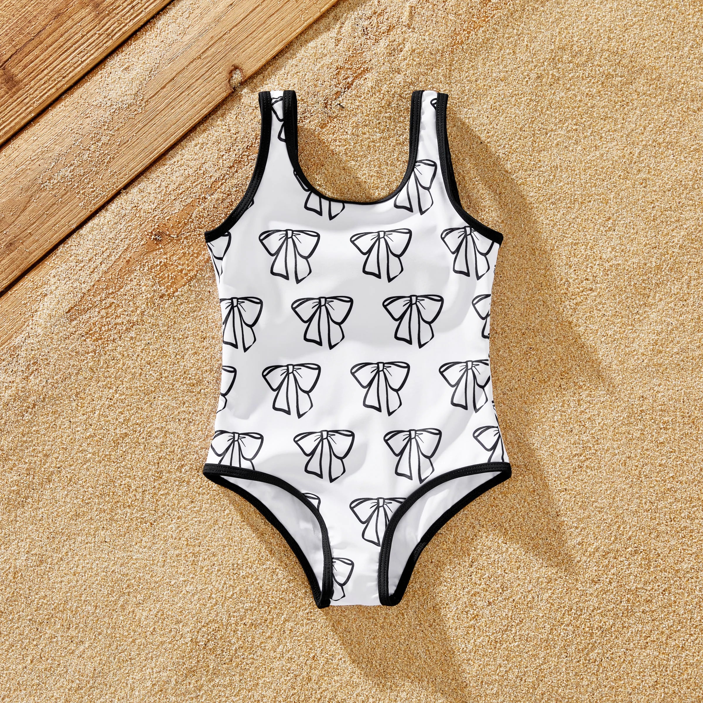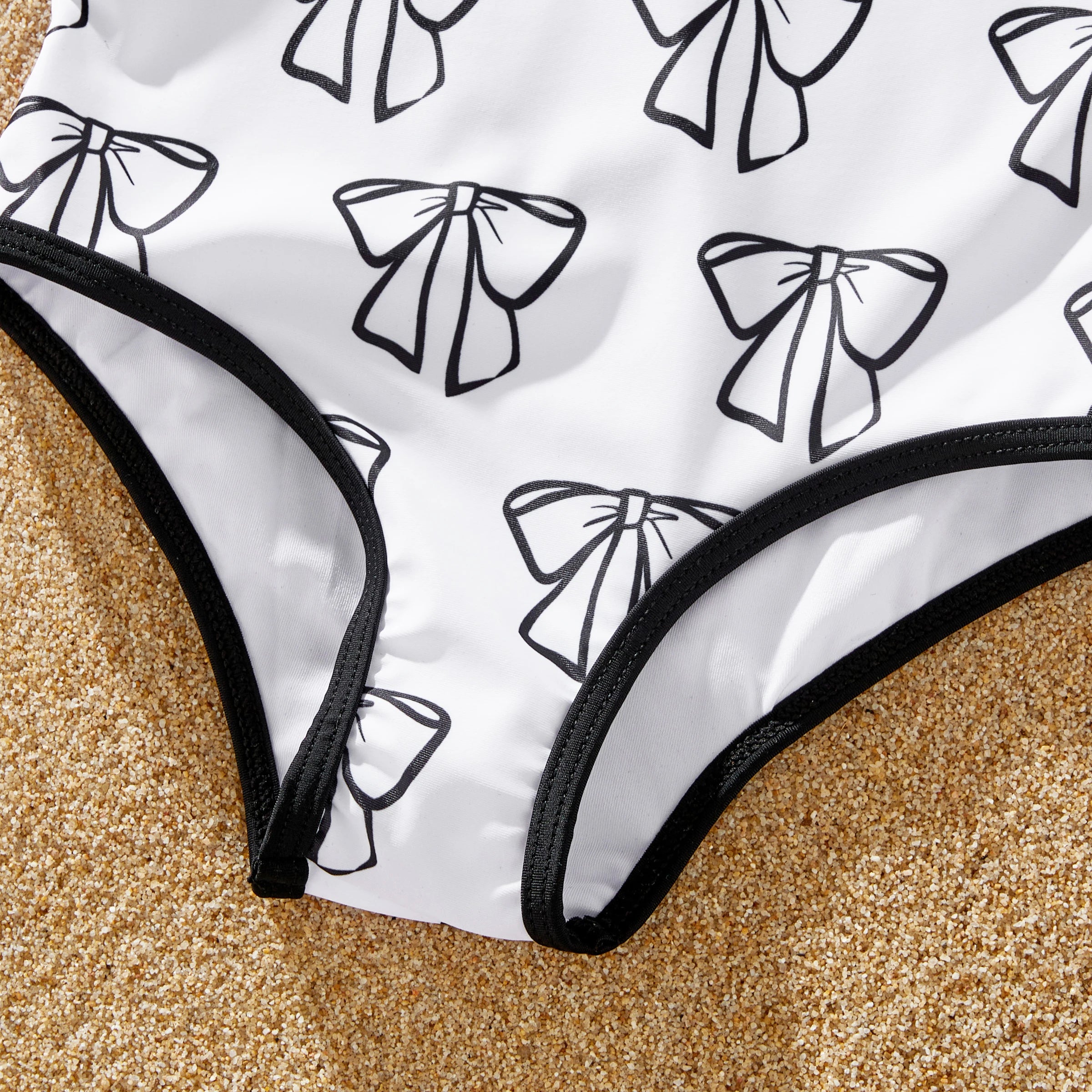 Product Introduction: Elevate your family's summer style with our exquisite Letter Printed Drawstring Swim Trunks & Bow Pattern Swimsuit Set. Immerse yourselves in the epitome of elegance as you indulge in this beautiful white one-piece swimsuit adorned with a charming bow design. Ideal for outdoor activities, vacations, and parties, this set ensures your family stands out with sophistication.