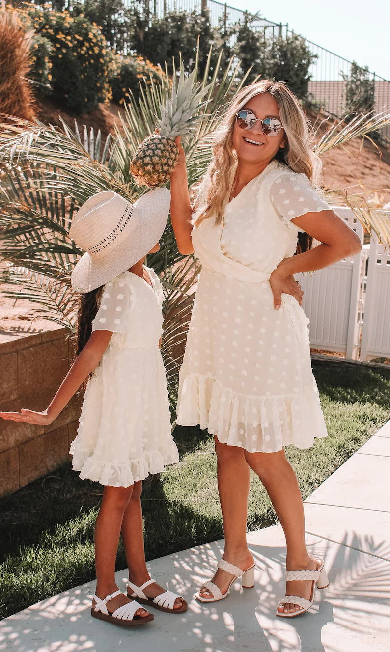 Transform into an angel for your mother's princess with this pretty dress. Minimalist design with a V-neck and extremely cute arms for mom and baby. Love the belly from the design to the material. Chubby or thin eyelashes are both suitable.