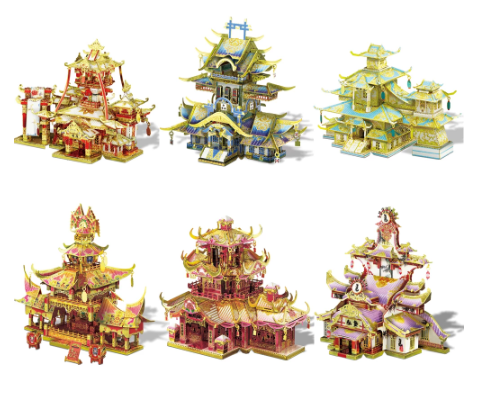 3D Assembled Metal Models of ancient buildings in ancient china. There are 6 assembly models: Cloth Factory, Gambling House, Private School, Opera Stage, Rouge Shop, and Social Club. Each model simulates its use and you will learn more about the historical Chinese architecture of the time.