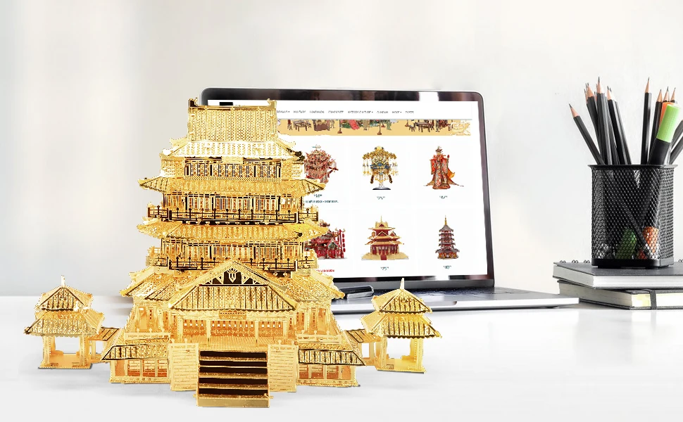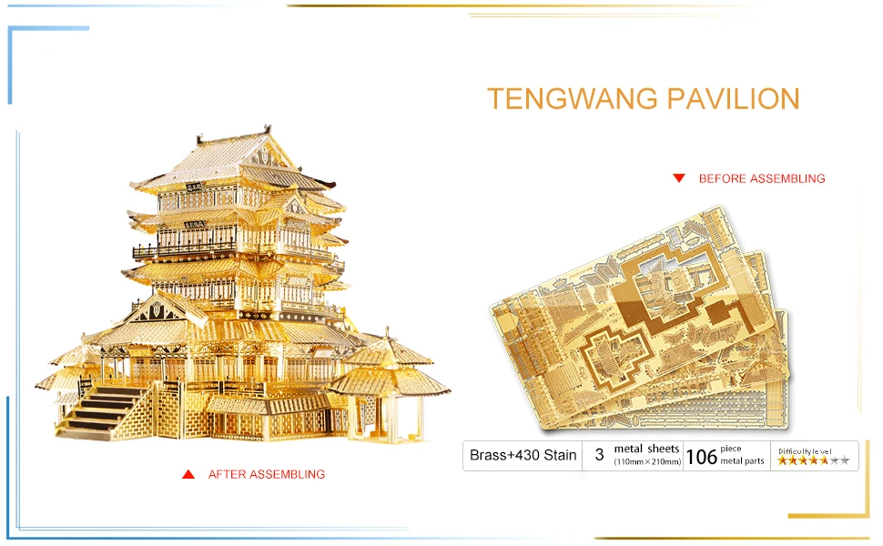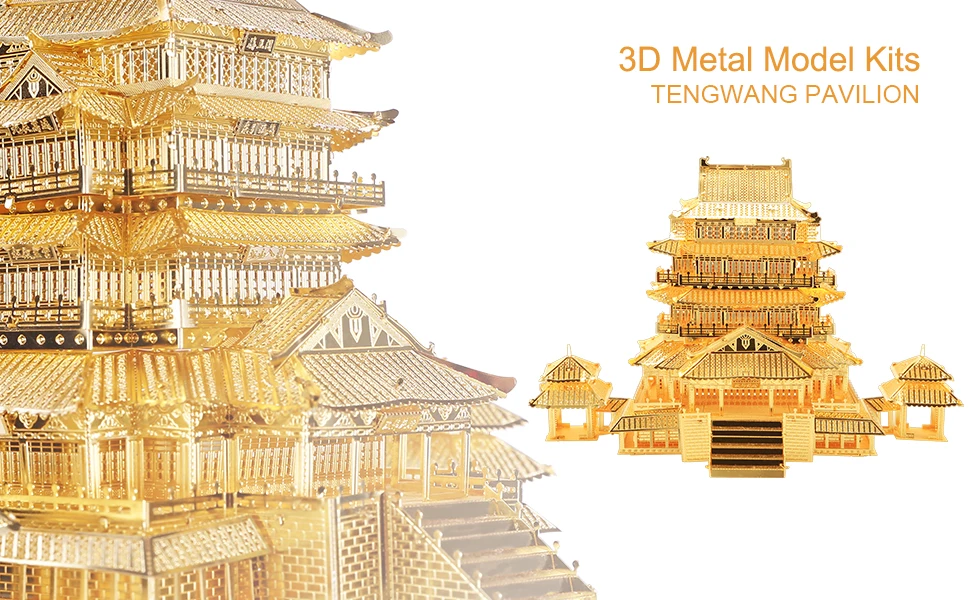 3D Assembled Metal Model Tengwang Pavilion simulates famous Chinese architecture. Tengwang Pavilion is the name of the three-storeyed houses built by Teng Wang Li Yuanying during the Tang Dynasty in Jiangxi, Sichuan, and Shandong provinces.
