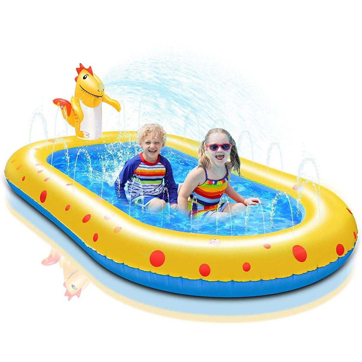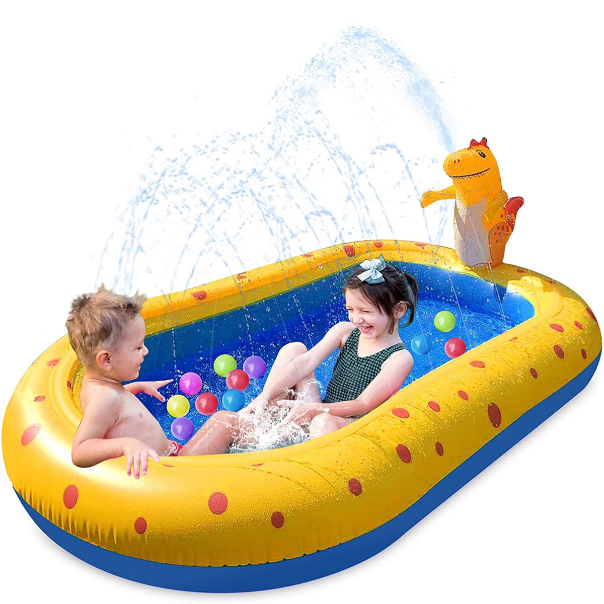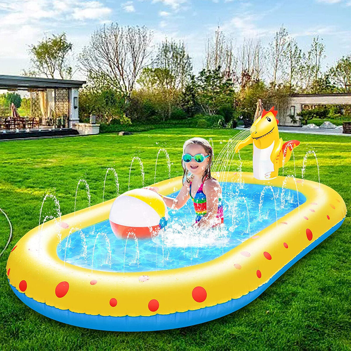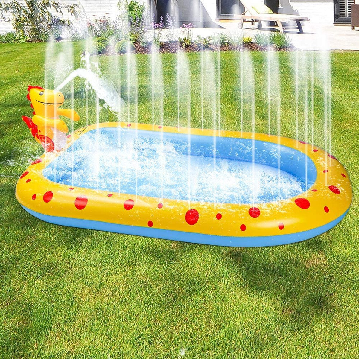- 3 in 1 Inflatable Pool: Never miss summer water fun with an inflatable sprinkler pool, which is a combination of a kid play pool and a splash pad. Simple connecting it to a garden hose, fill it with water, and use it as a sunbathing tub or wading pool. Leaving dinosaur head and rim of pool spraying by adjusting water pressure.