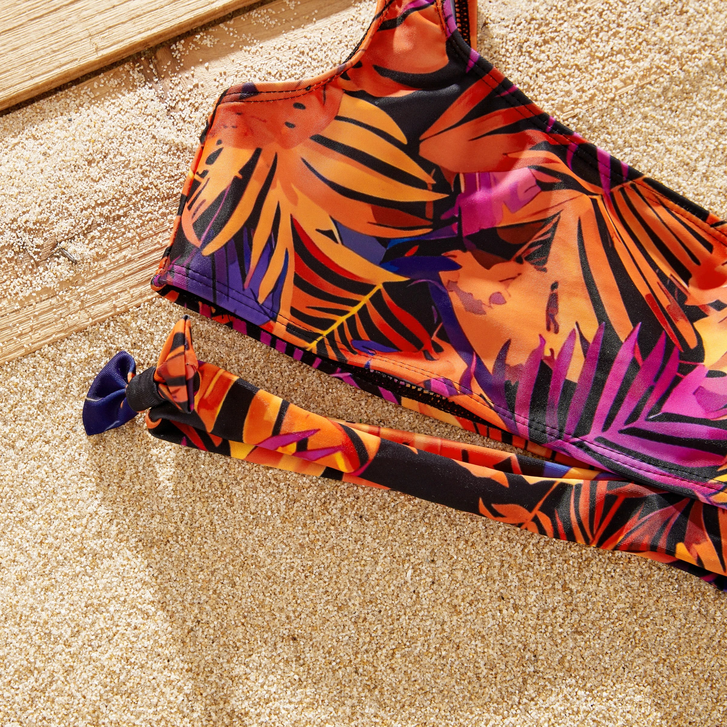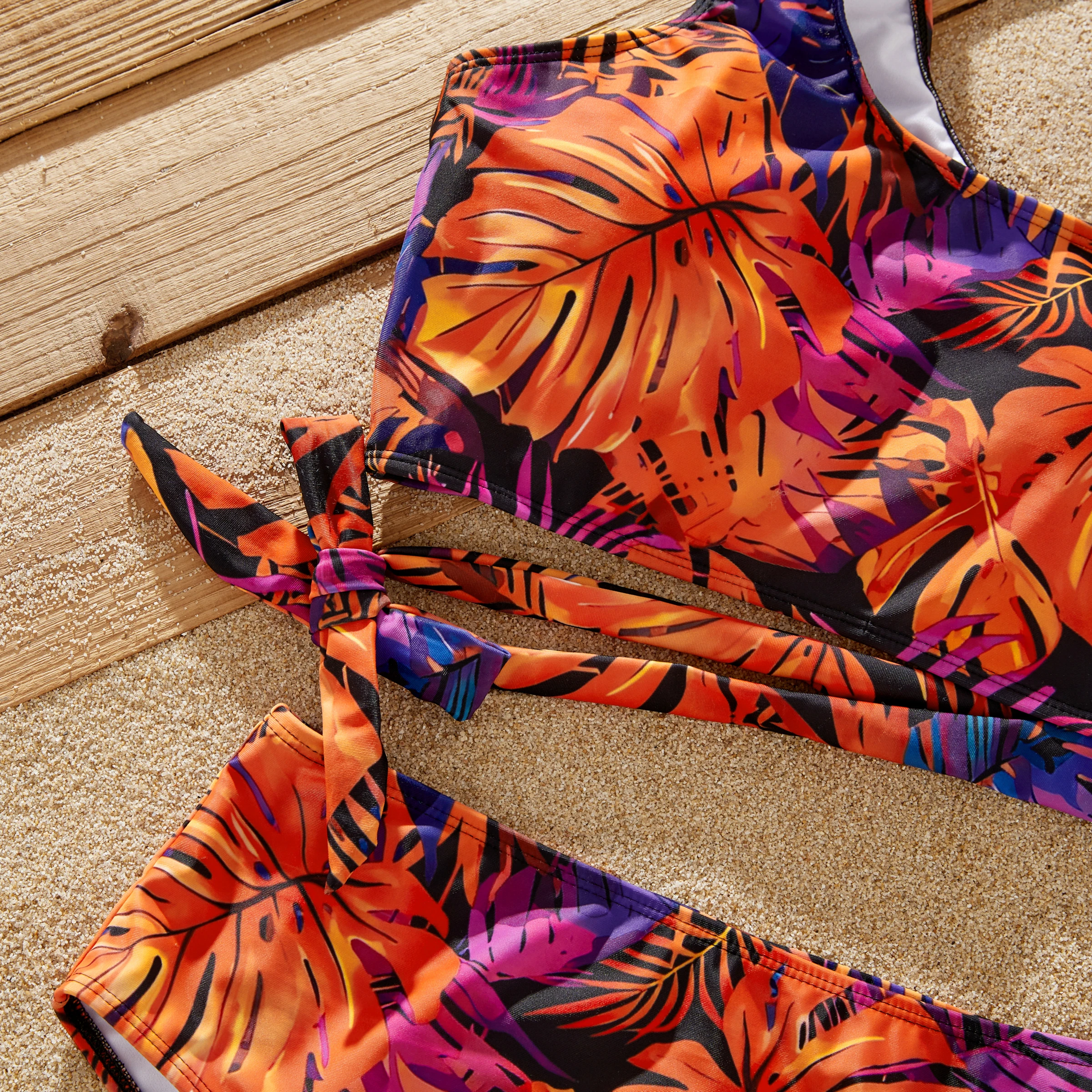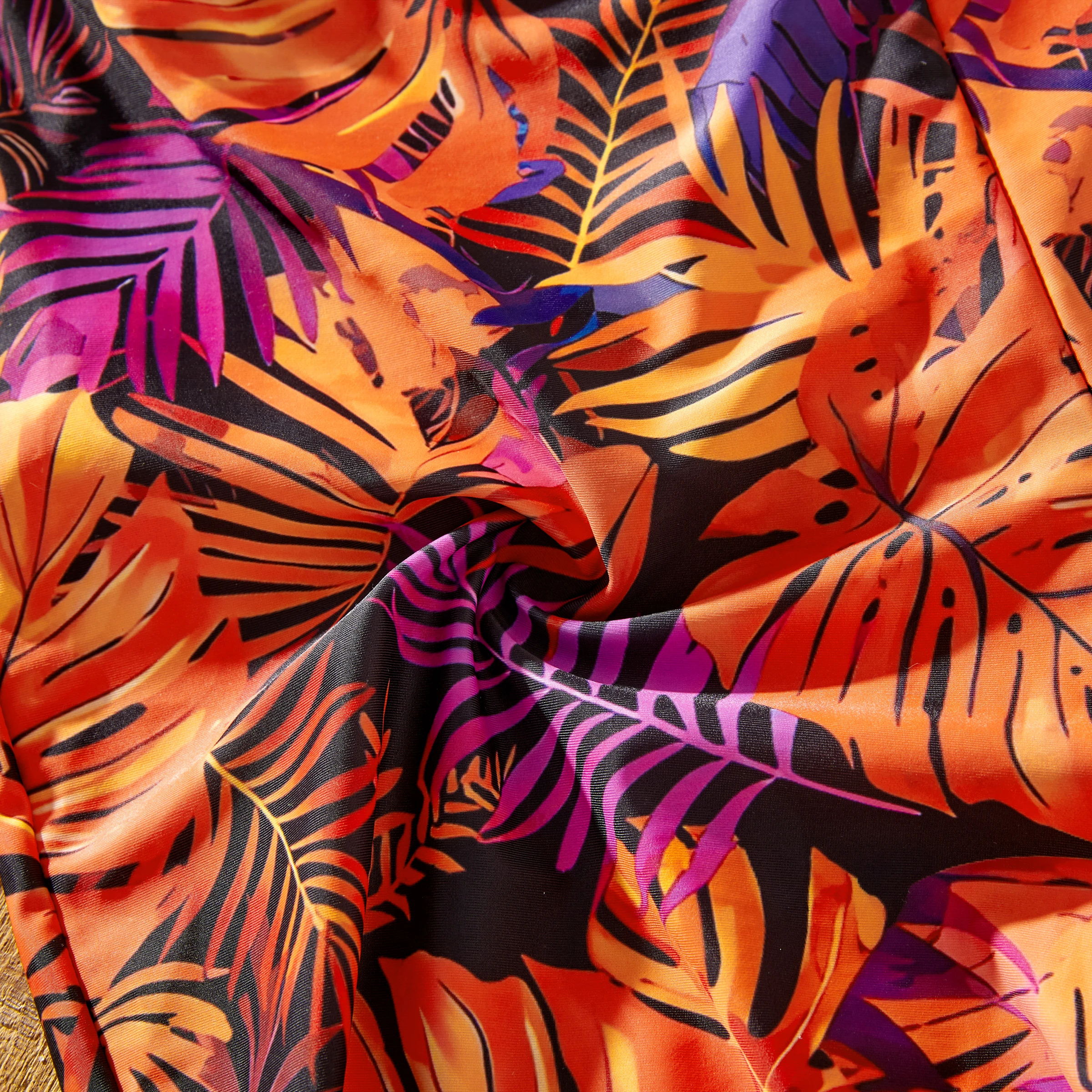 Points forts : Plongez dans le charme d'un paradis tropical avec nos maillots de bain ornés d'un motif de feuilles vibrant, mêlant des nuances d'orange, de violet et de noir. Le short homme présente une coupe décontractée et une longueur genou, complétée par un cordon de serrage blanc réglable pour un maintien optimal. Le short garçon, quant à lui, reprend ce modèle, mais offre une touche ludique avec une longueur plus courte. Le bikini deux pièces pour femme se compose d'un haut bandeau tendance à fines bretelles et d'un bas taille haute qui couvre et sublime la silhouette. De même, les maillots de bain pour fille s'inspirent du style féminin tout en conservant un style adapté à chaque âge.