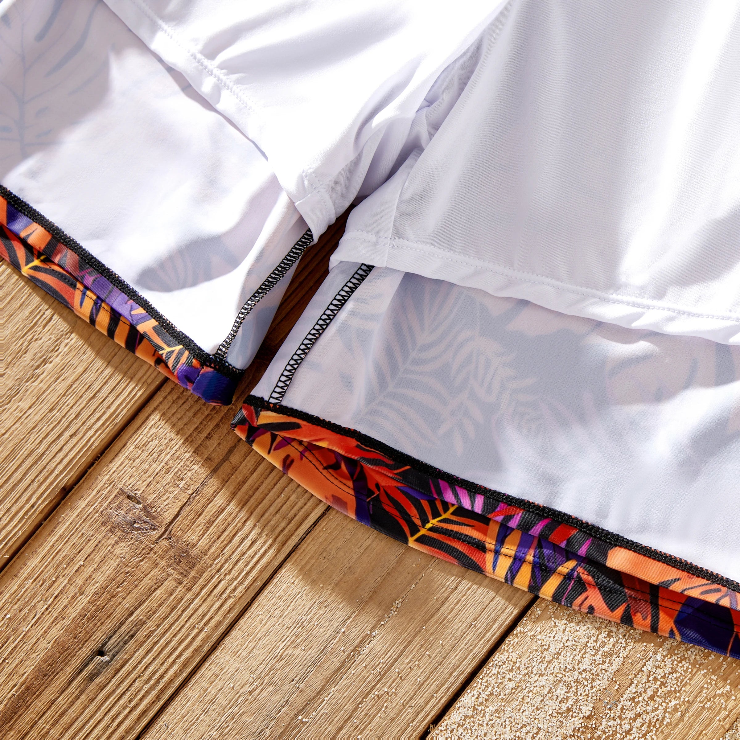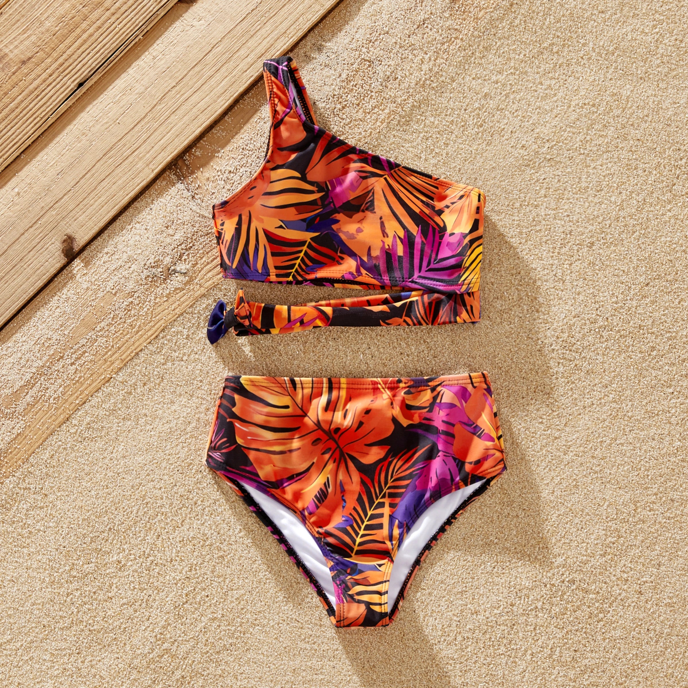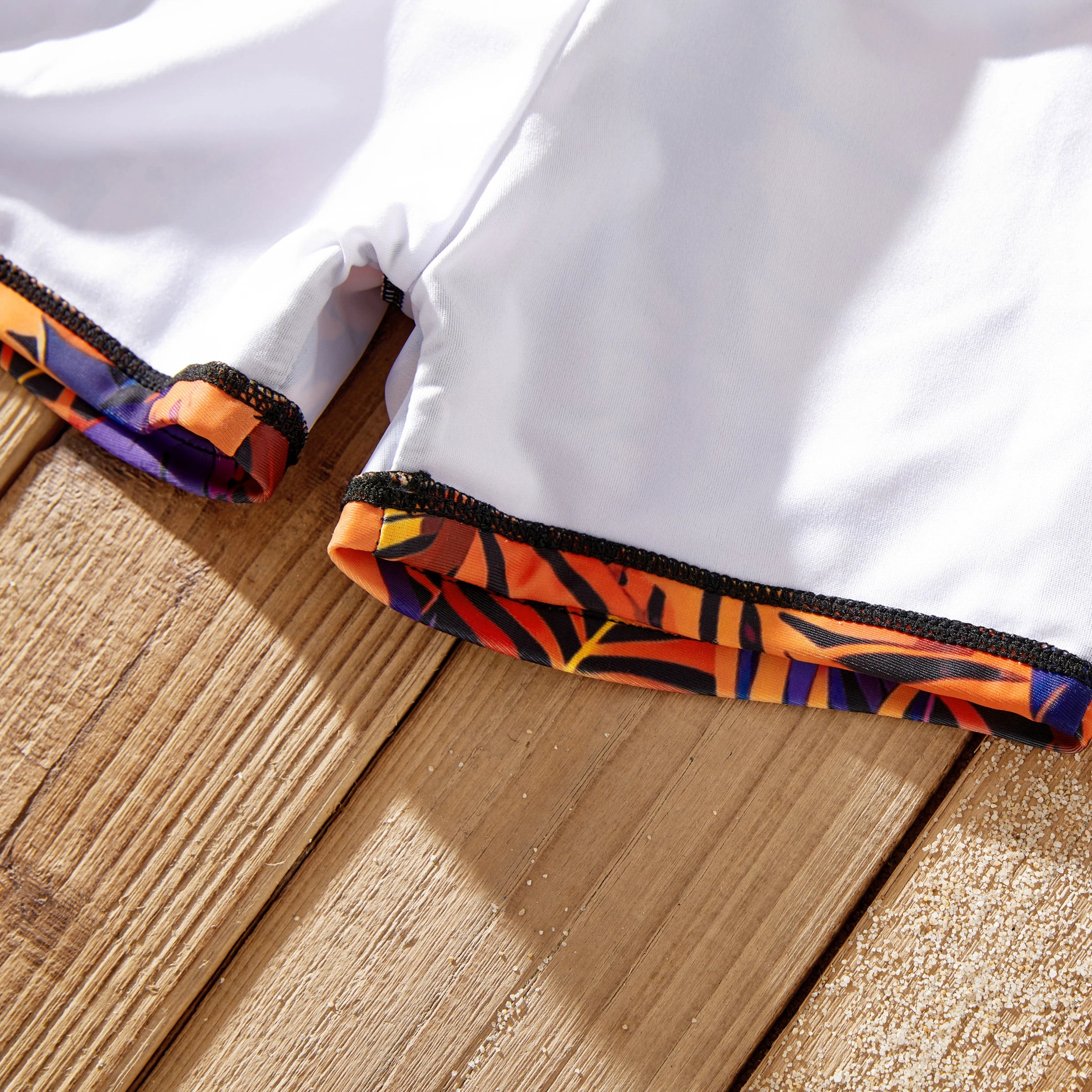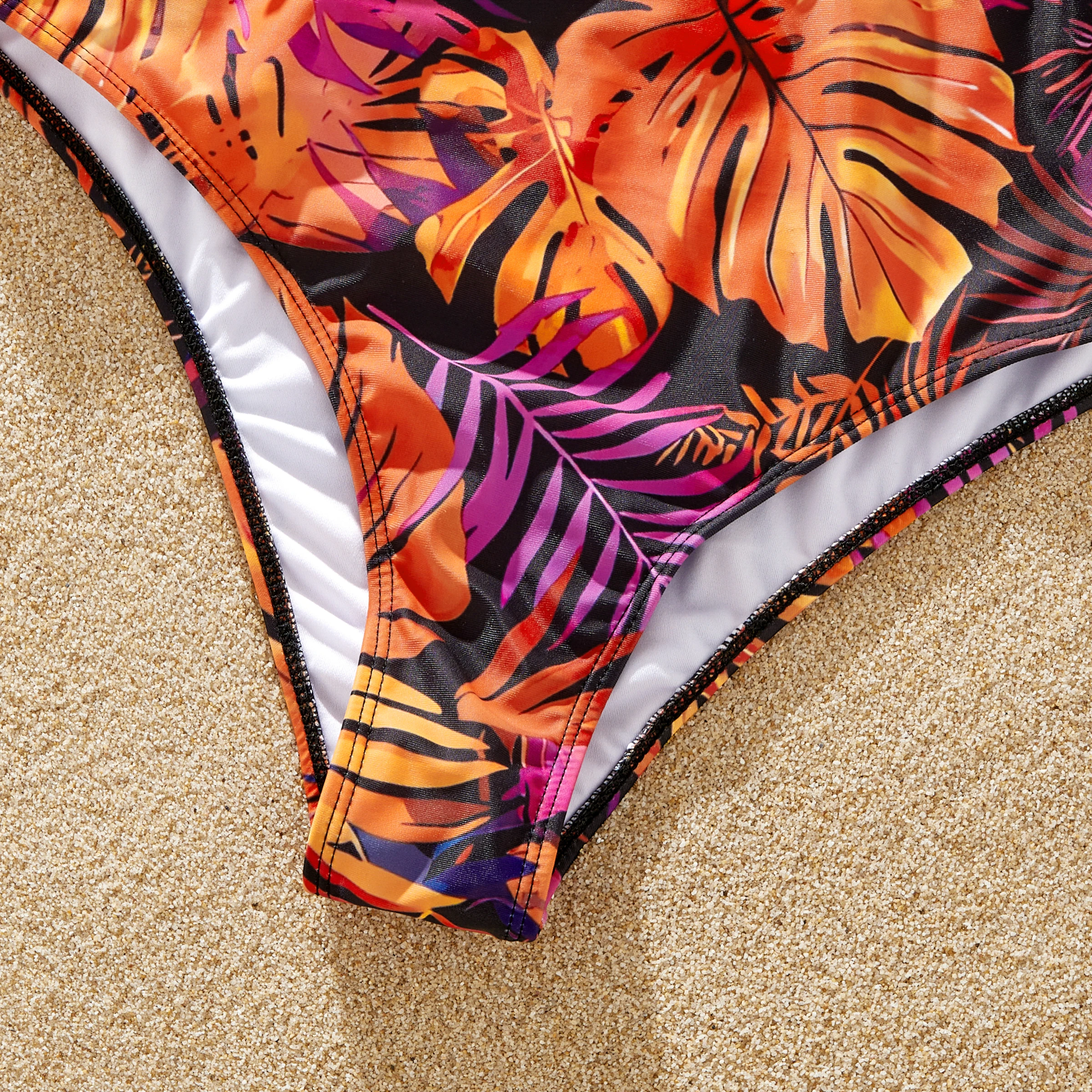 Points forts : Plongez dans le charme d'un paradis tropical avec nos maillots de bain ornés d'un motif de feuilles vibrant, mêlant des nuances d'orange, de violet et de noir. Le short homme présente une coupe décontractée et une longueur genou, complétée par un cordon de serrage blanc réglable pour un maintien optimal. Le short garçon, quant à lui, reprend ce modèle, mais offre une touche ludique avec une longueur plus courte. Le bikini deux pièces pour femme se compose d'un haut bandeau tendance à fines bretelles et d'un bas taille haute qui couvre et sublime la silhouette. De même, les maillots de bain pour fille s'inspirent du style féminin tout en conservant un style adapté à chaque âge.
