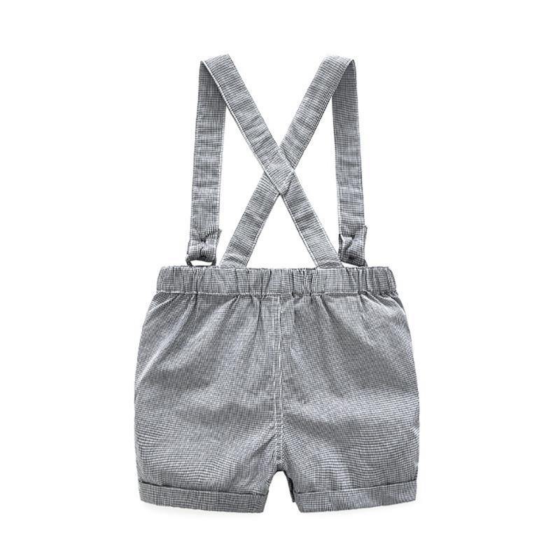 La barboteuse à manches courtes est fabriquée en coton et est extrêmement confortable à porter. Le short possède une taille élastique garantissant un ajustement parfait. Le nœud papillon et les bretelles rendent la tenue élégante et tendance. L’ensemble donne une allure de petit gentleman de façon classe et simple à la fois.