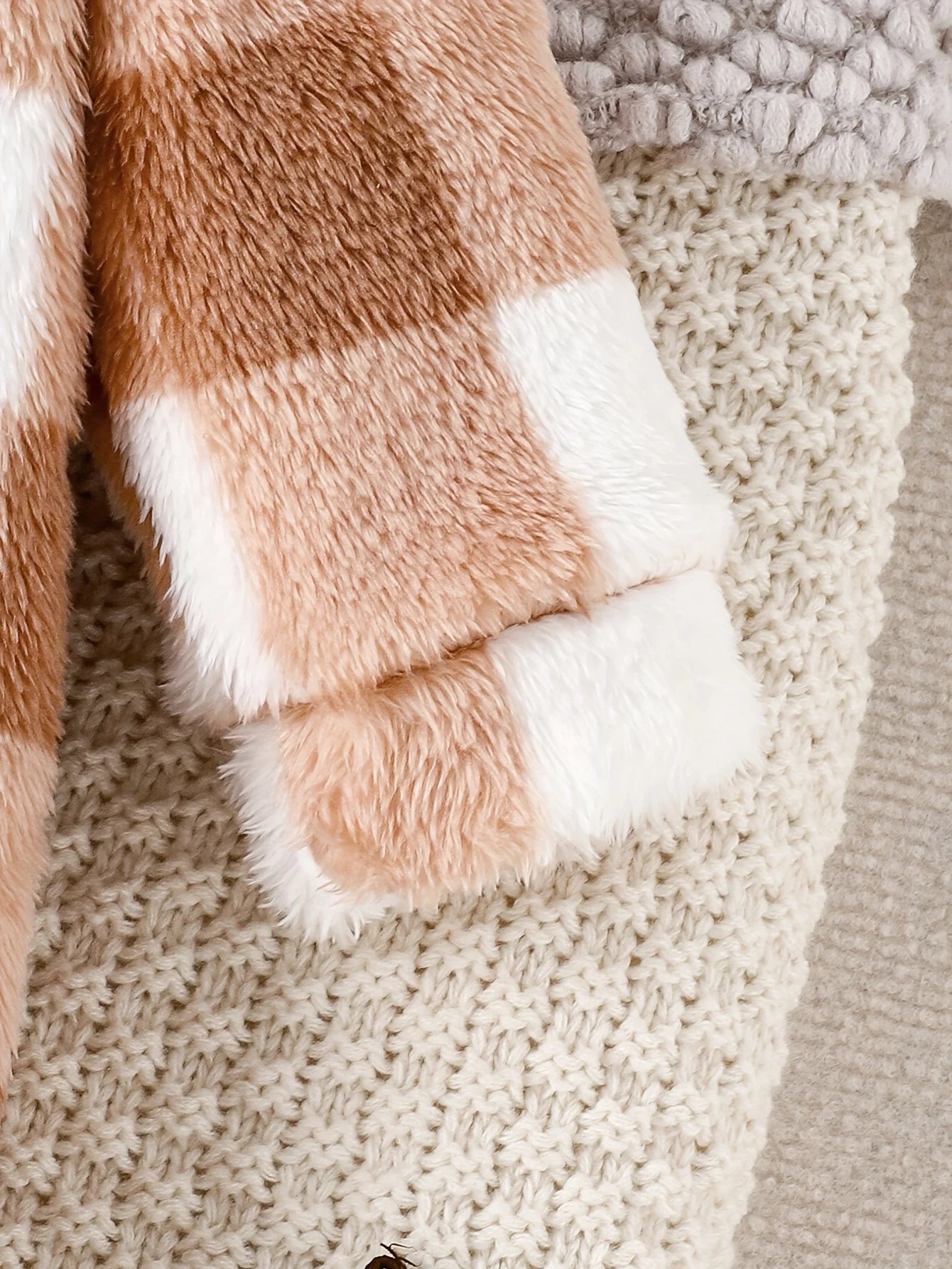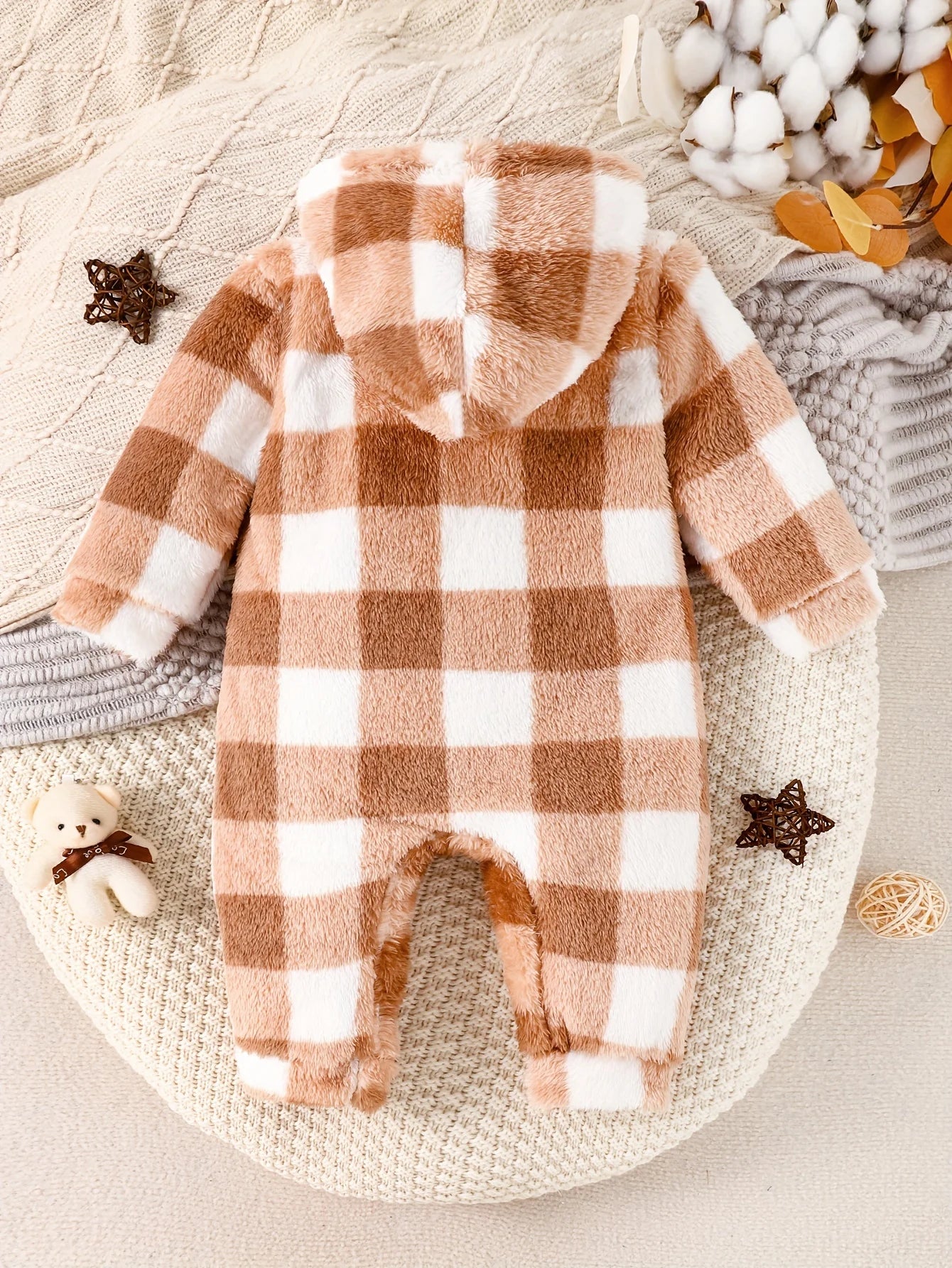 Barboteuse à capuche en velours à carreaux marron pour bébé - Chaleur automne/hiver