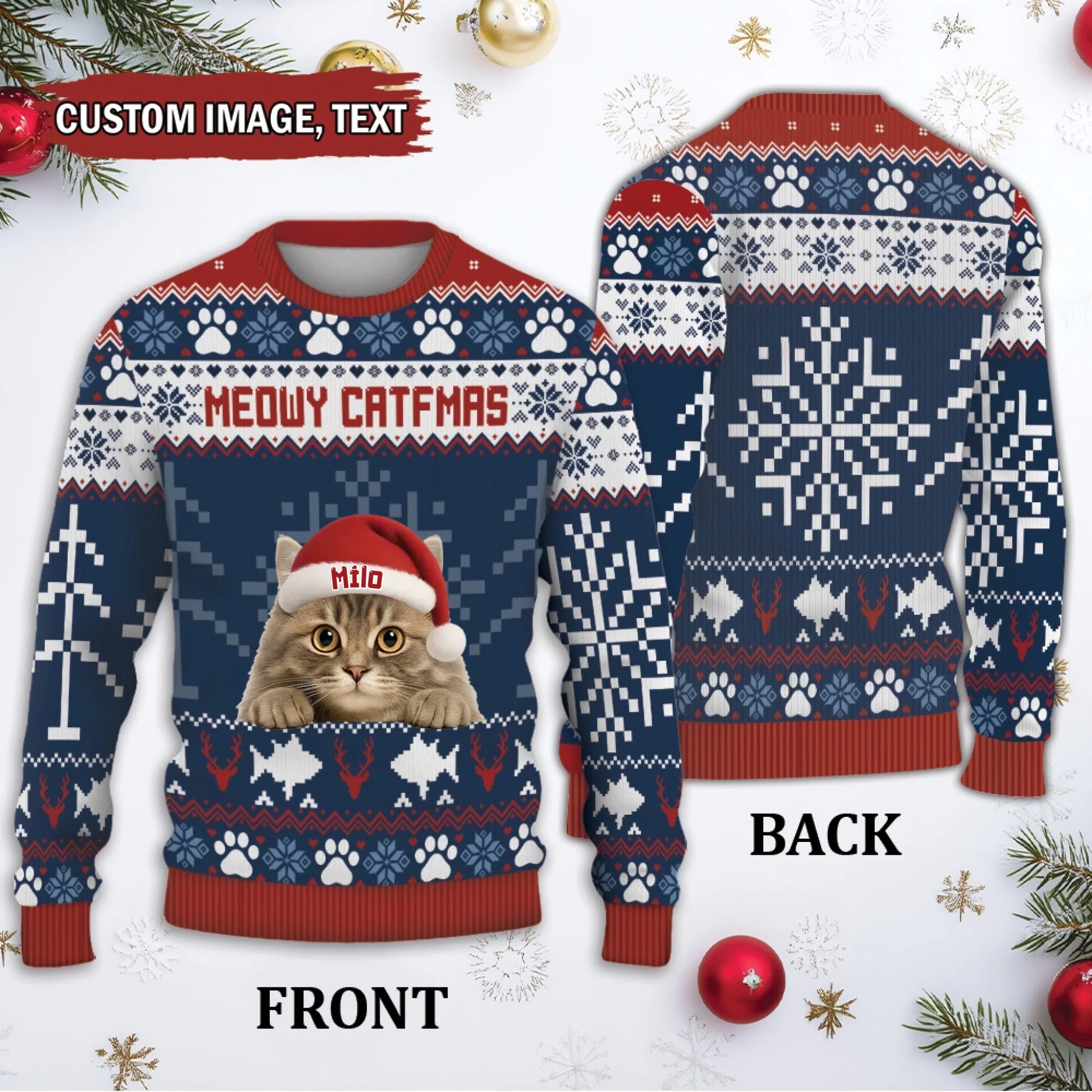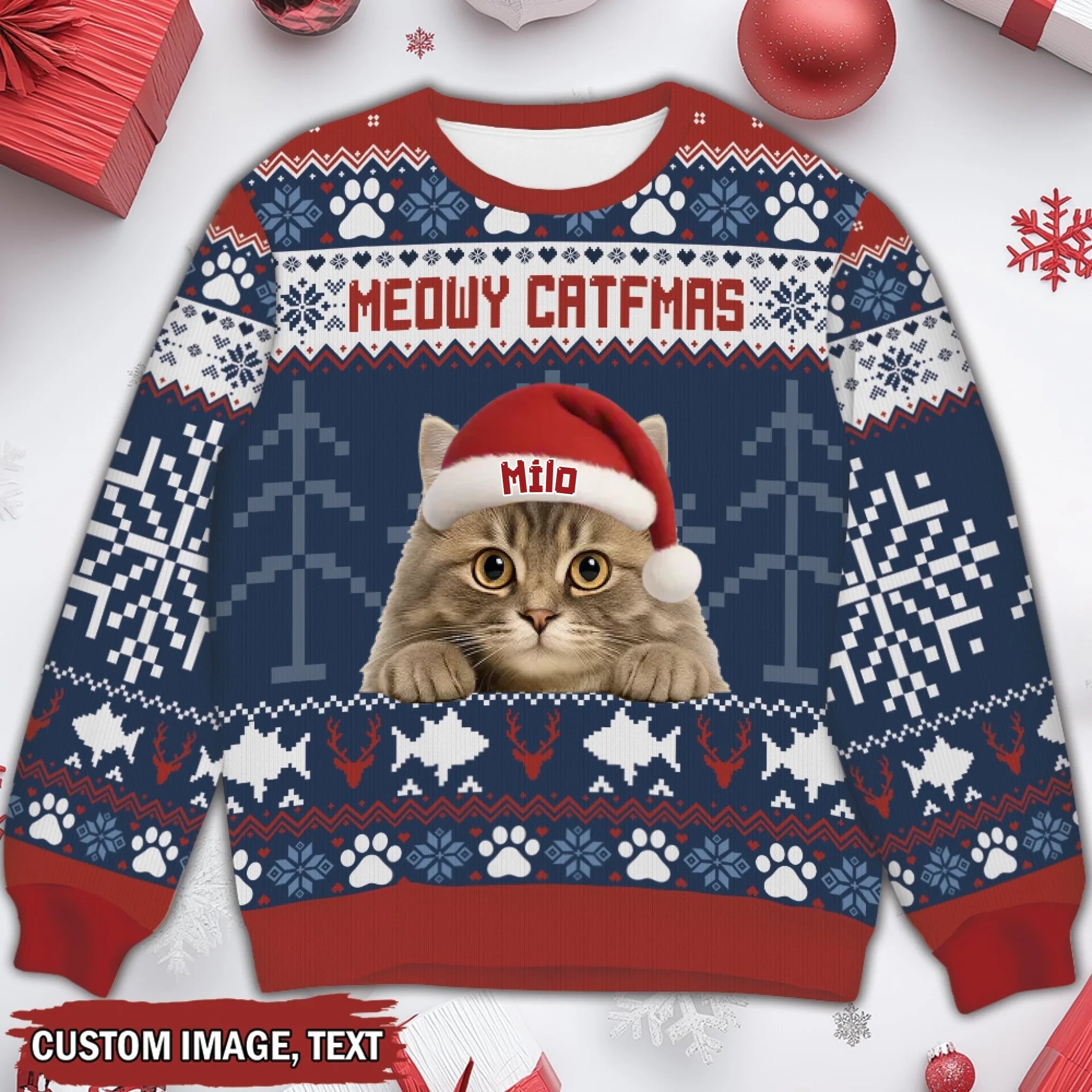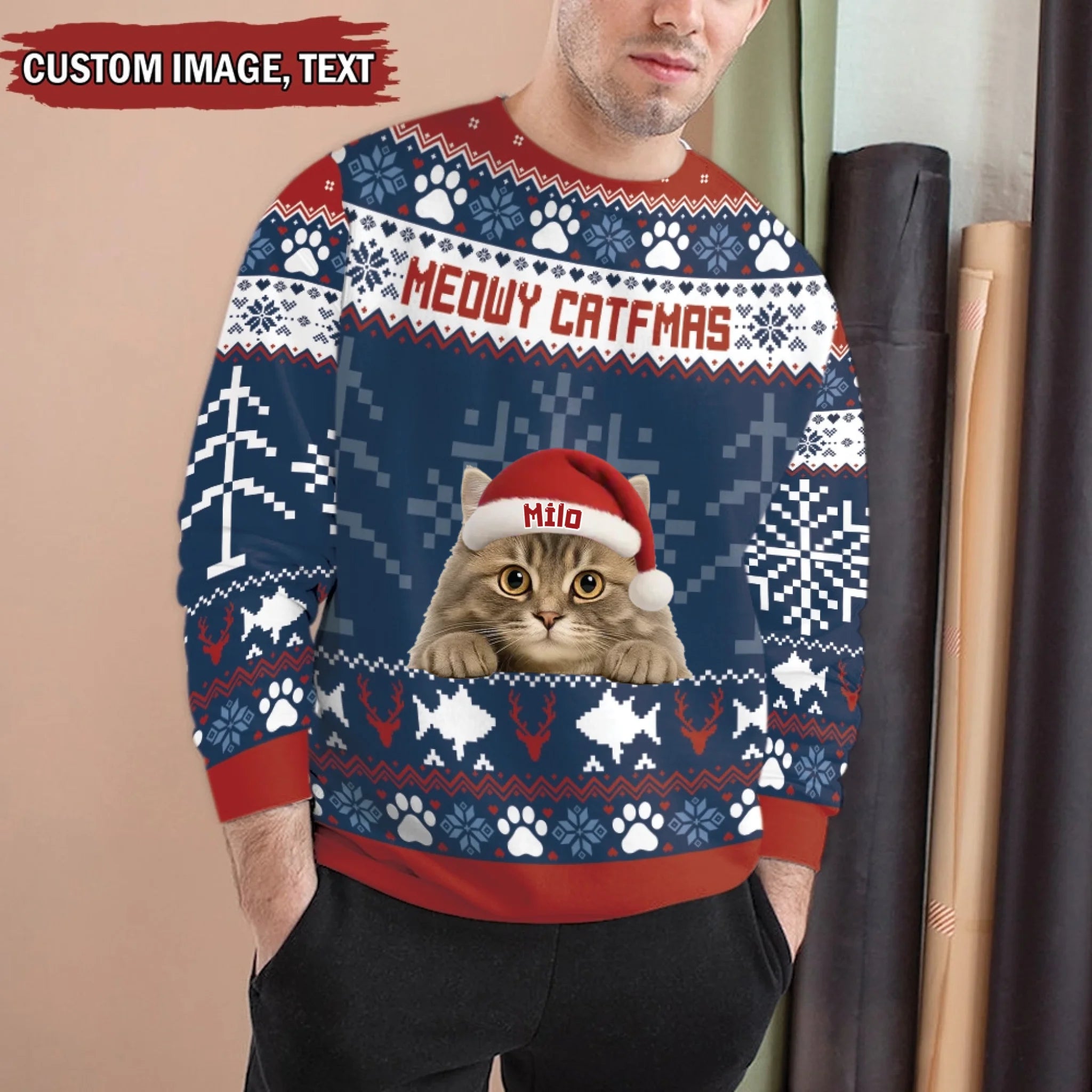 Pulls moches personnalisés de famille avec visage de chat – Nom & photo personnalisés « Meowy Catmas » | Cadeau de Noël drôle pour les amoureux des chats