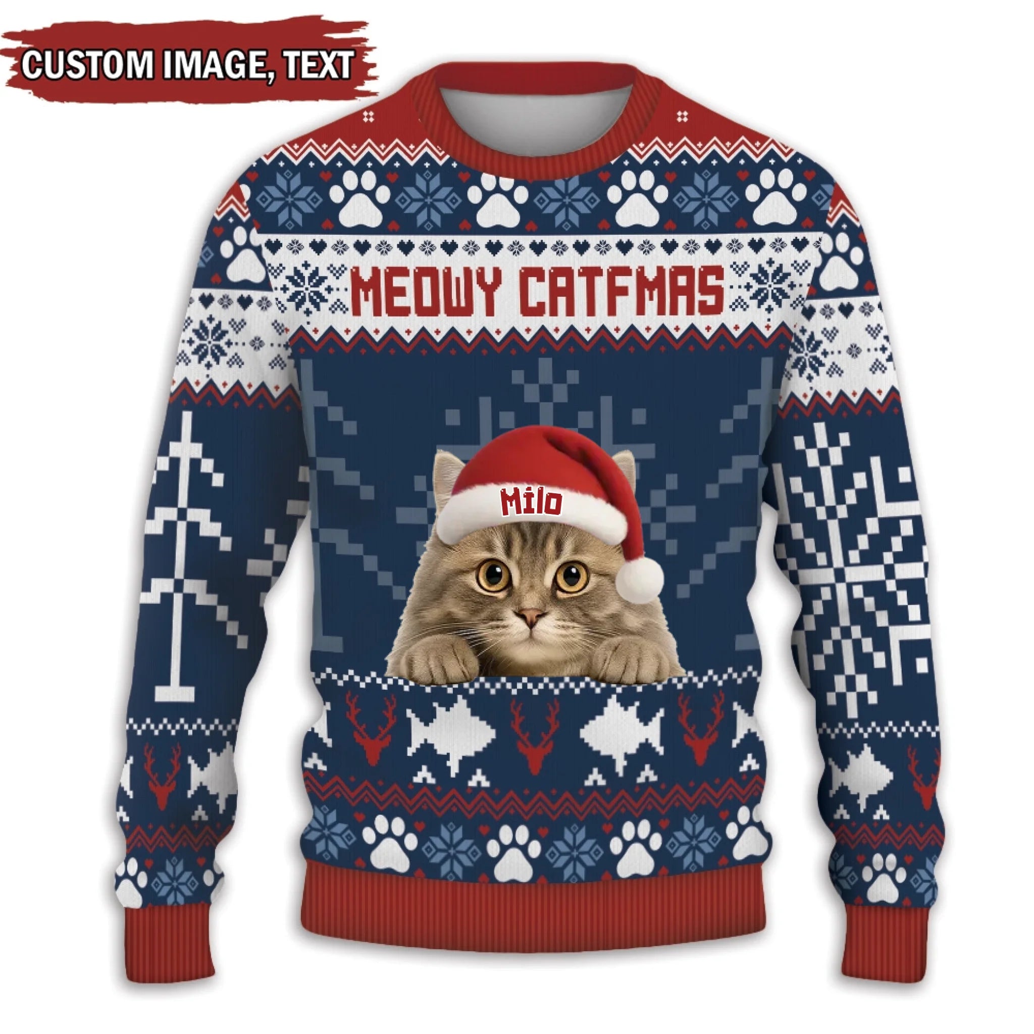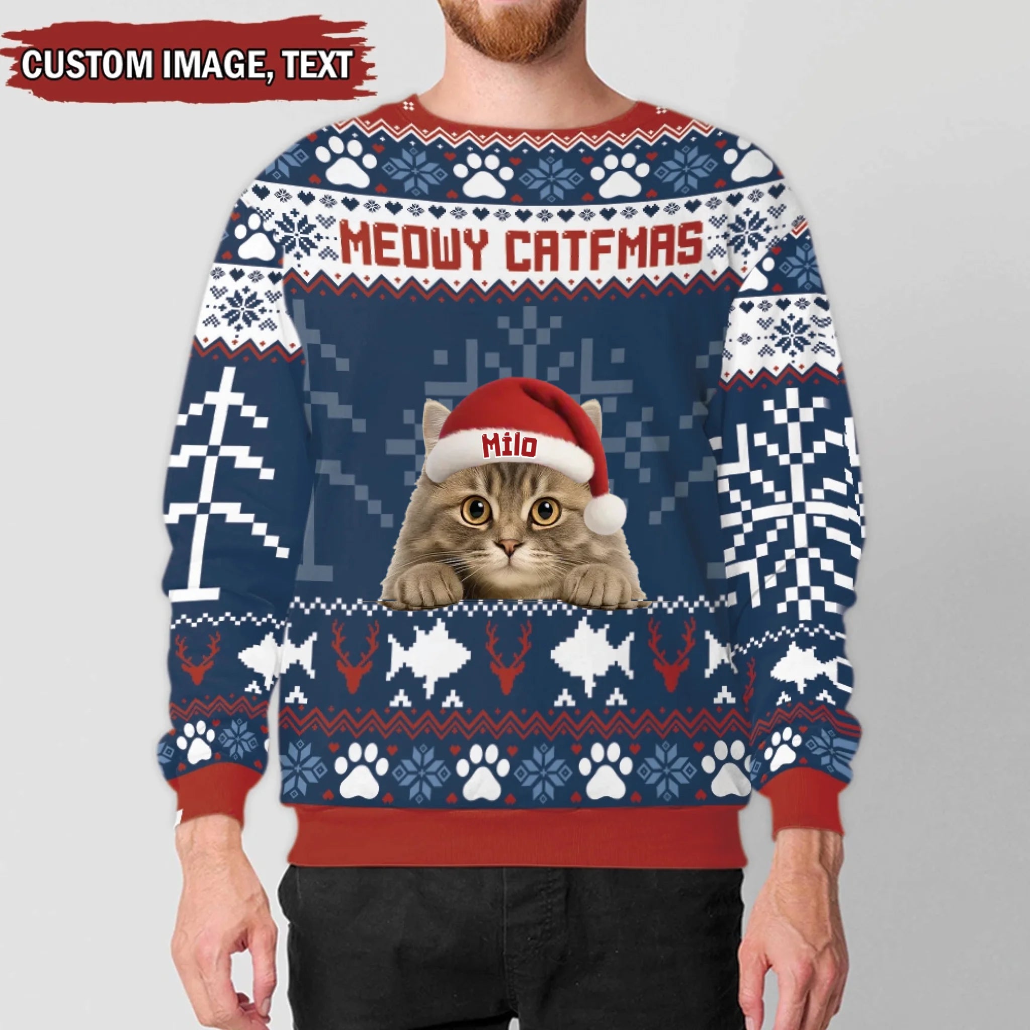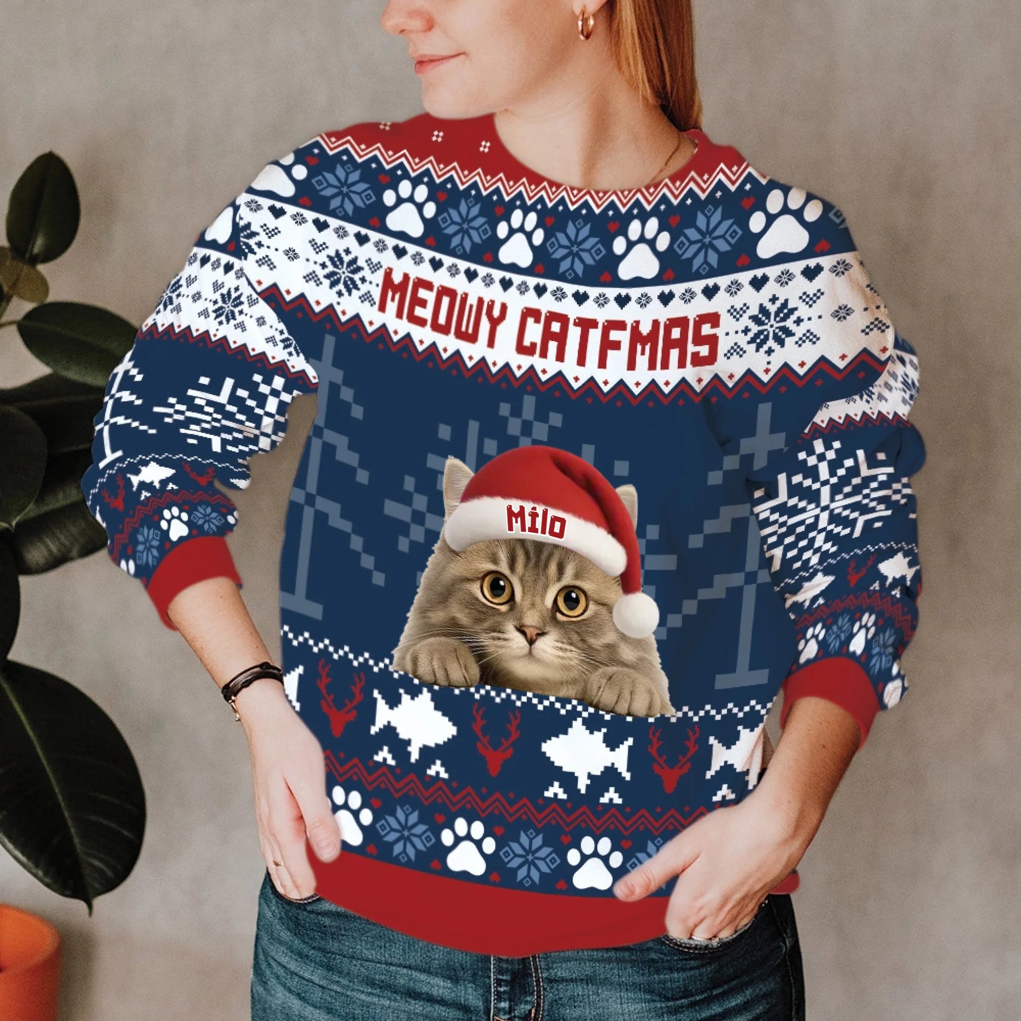 Pulls moches personnalisés de famille avec visage de chat – Nom & photo personnalisés « Meowy Catmas » | Cadeau de Noël drôle pour les amoureux des chats