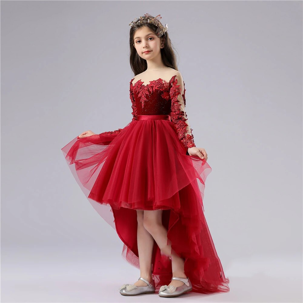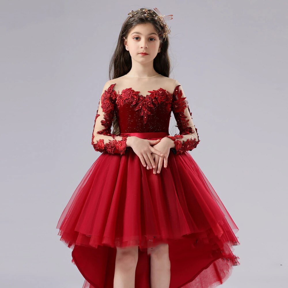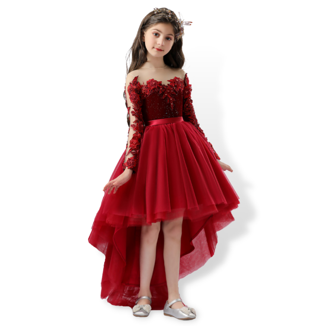 Laissez la foule admirer votre petite demoiselle avec cette robe de princesse rouge flamboyante ornée de dentelle florale. Son design unique, avec ses manches transparentes, ses ornements floraux en dentelle et ses applications de perles, lui confère une beauté époustouflante et un look de princesse flamboyant parfait ! Tailles disponibles pour les tout-petits et les adolescents.