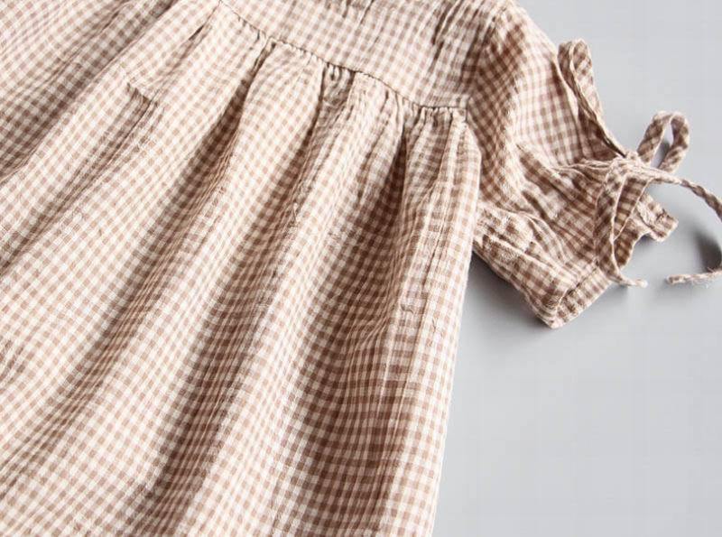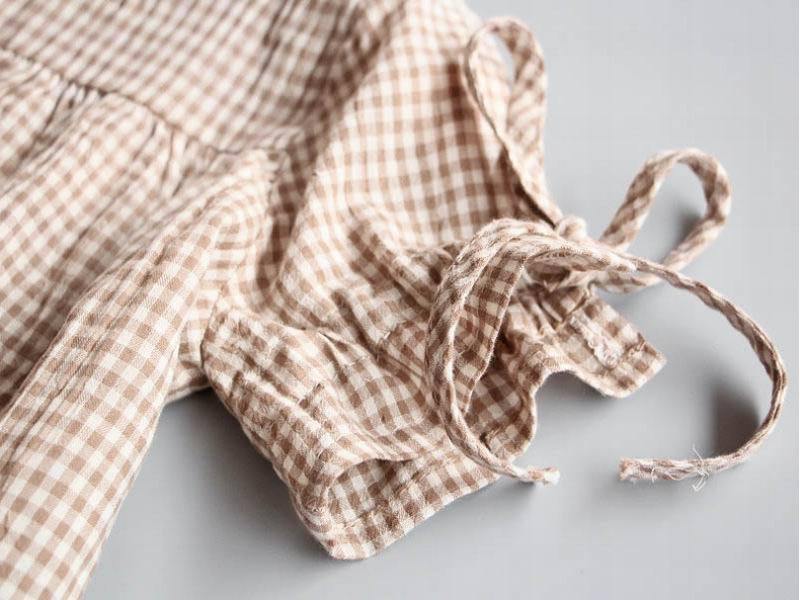 Robe à carreaux pour filles est une tenue vintage à motifs pour petites chéries. La couleur est subtile et convient à une saison agréable. La robe est élégante dans sa simplicité avec ses manches à nouer et ses plis creux.