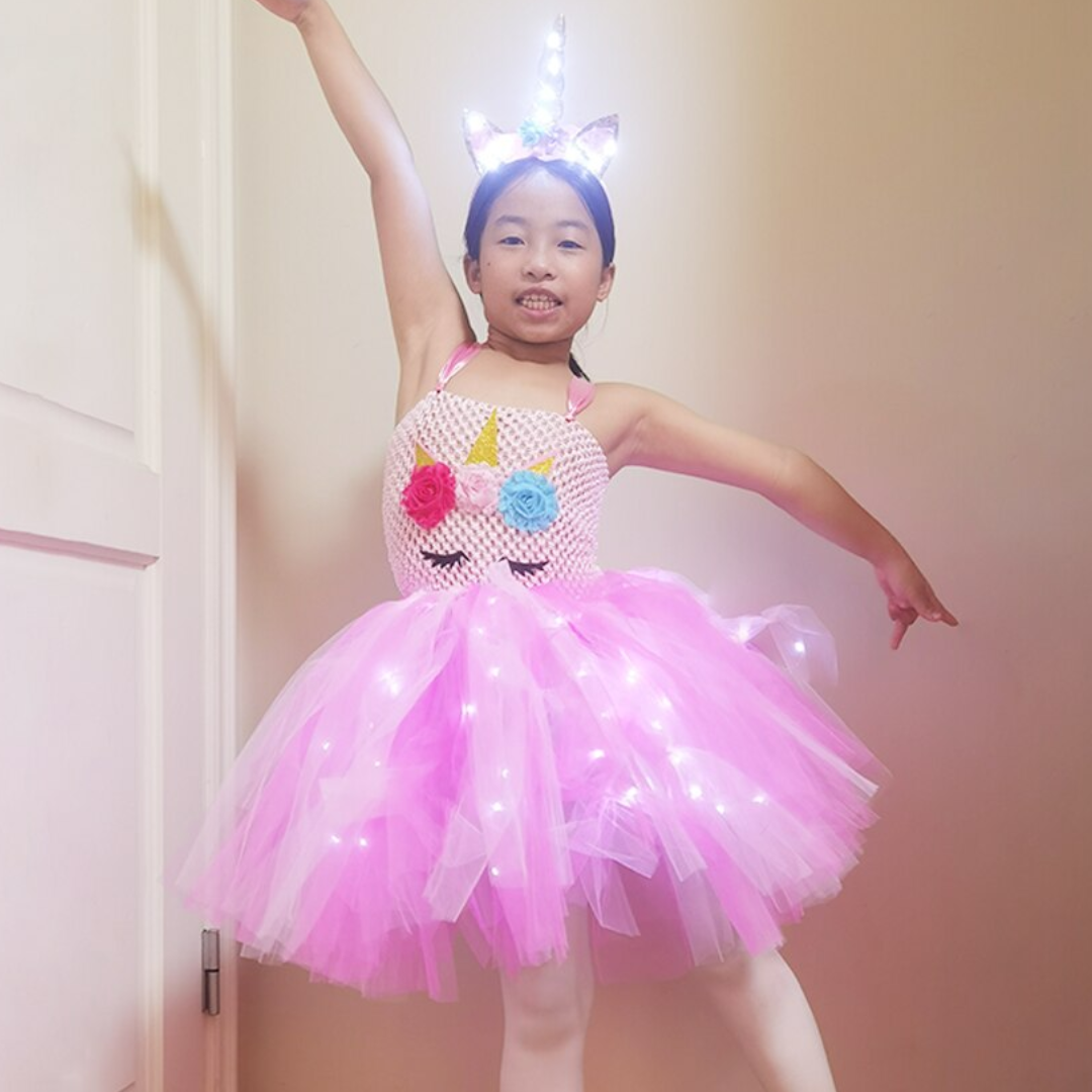 Robe de soirée en tulle avec licorne lumineuse à LED pour filles