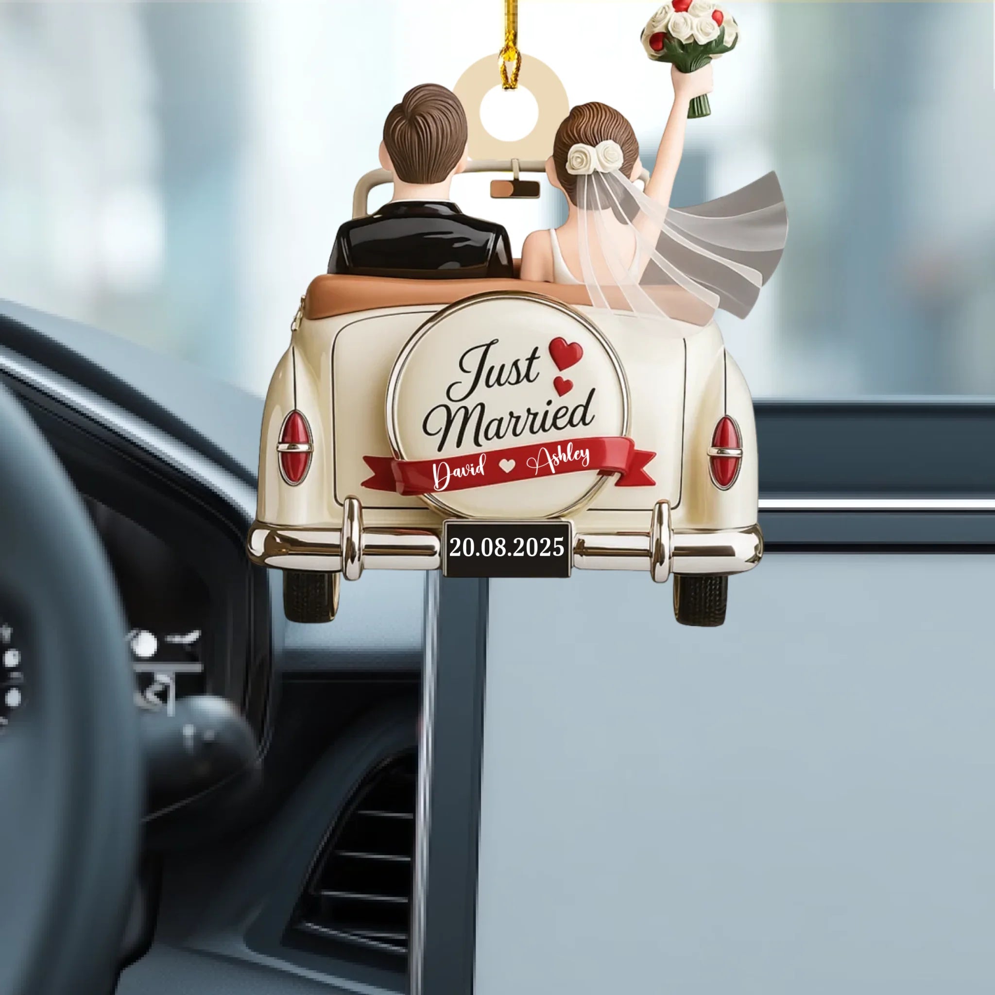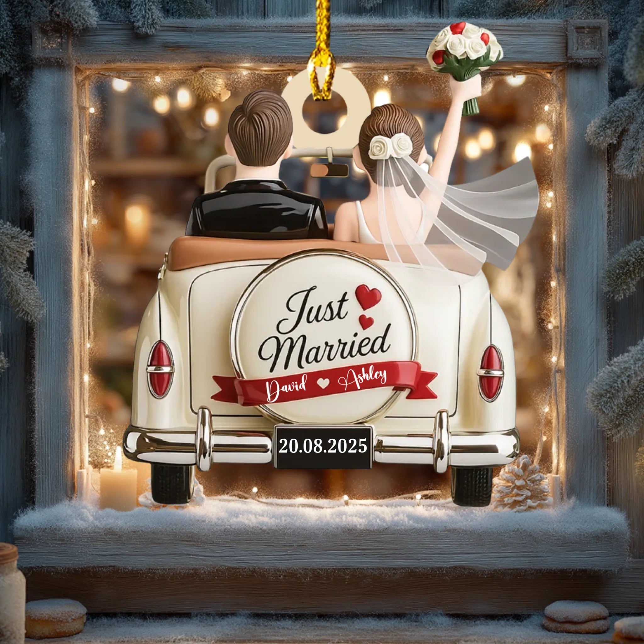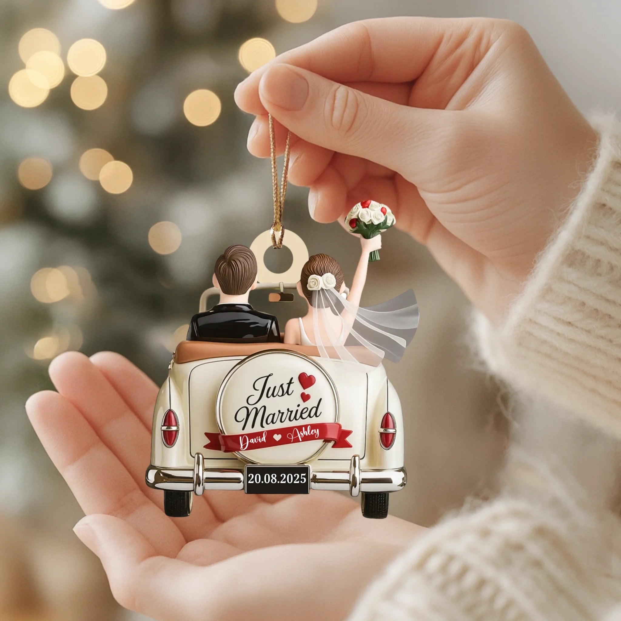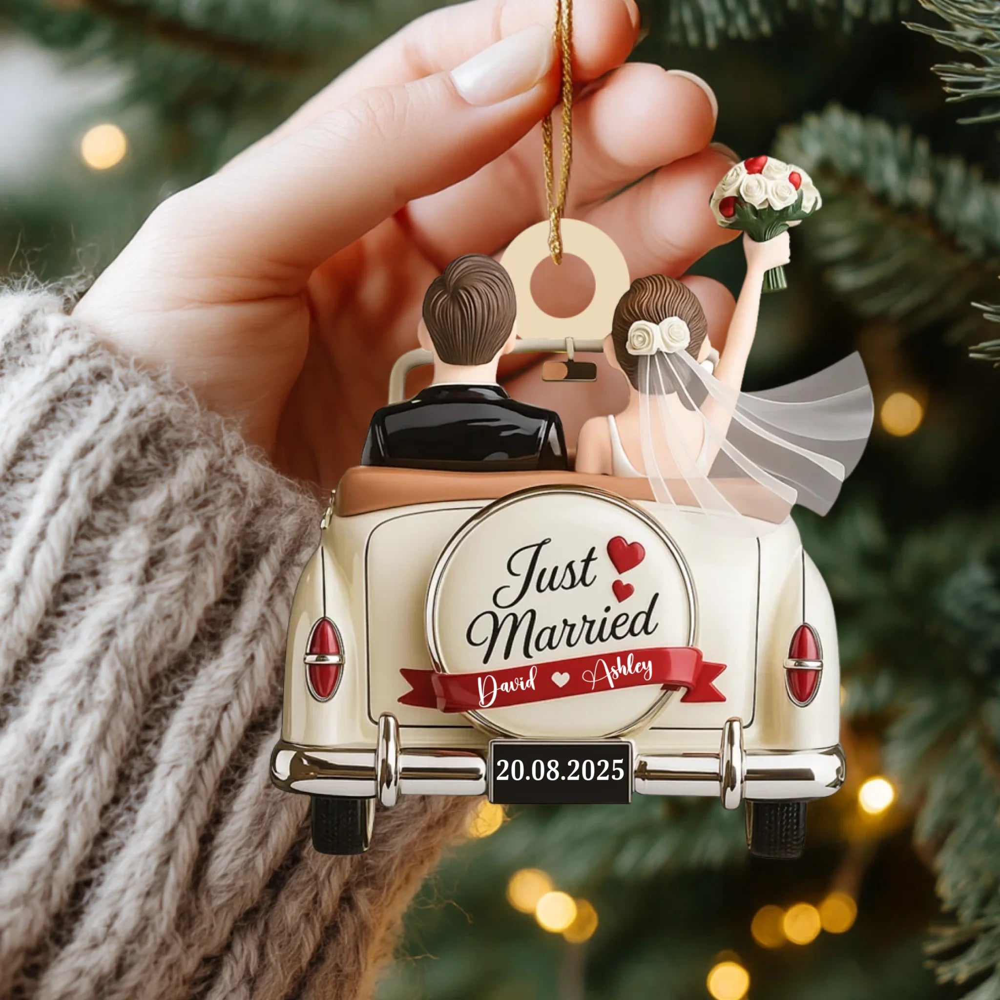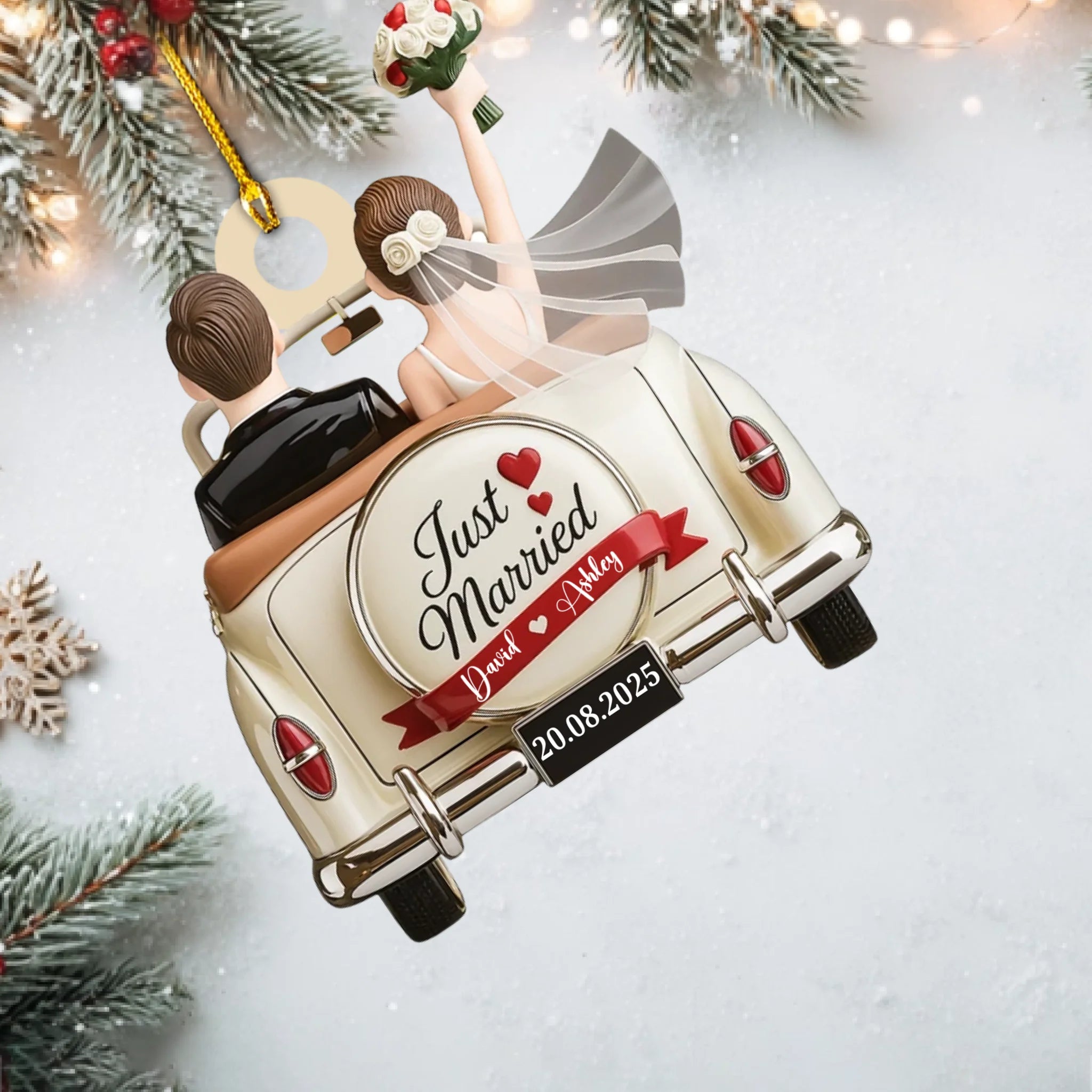 Boule de Noël personnalisée « Just Married » – Prénoms des mariés, teintes de peau & date du mariage sur mesure | Cadeau décoratif en bois pour voiture, spécial jeunes mariés