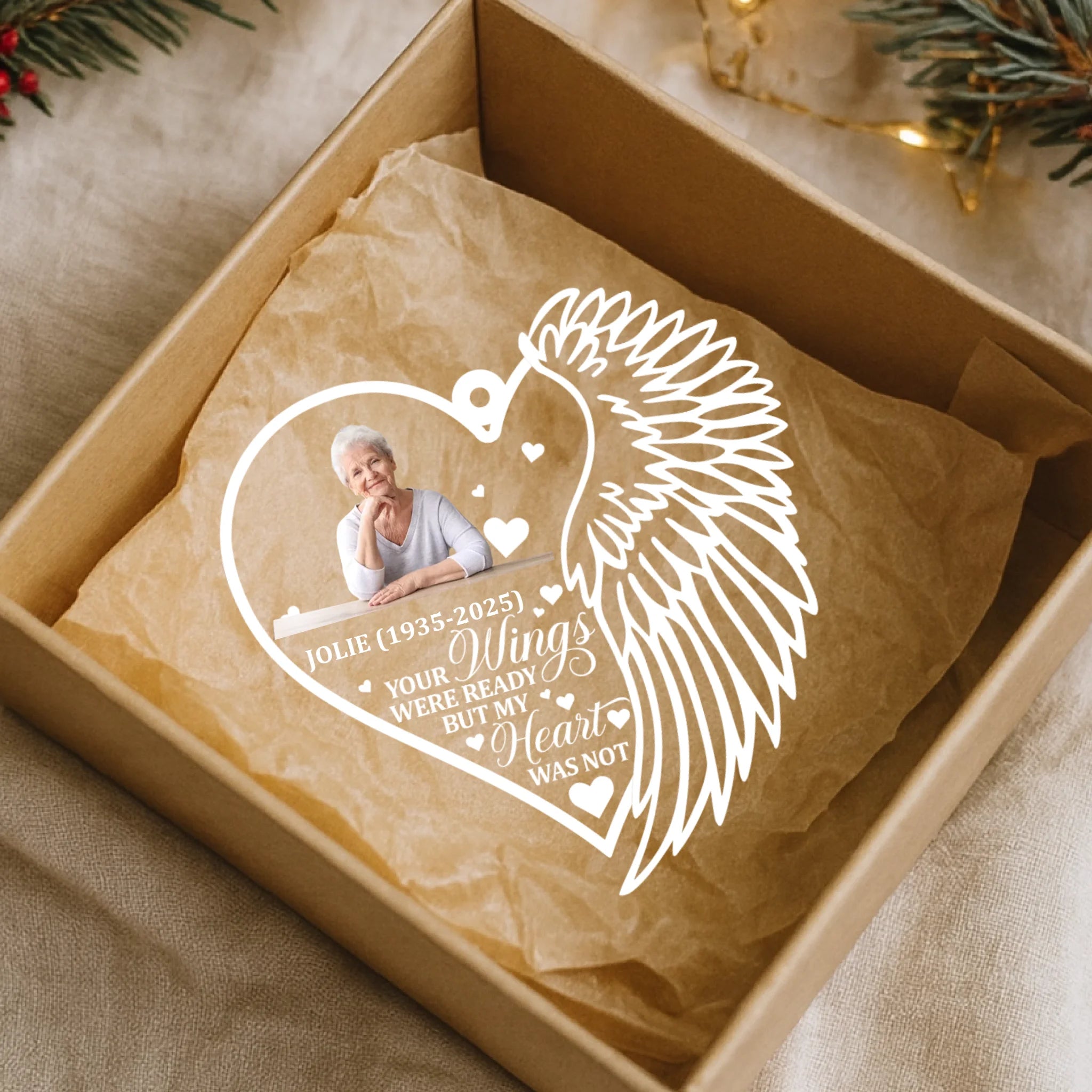 This ornament allows you to customize the photo, name, and years (birth – passing), turning a simple decoration into a meaningful symbol of everlasting love and connection.