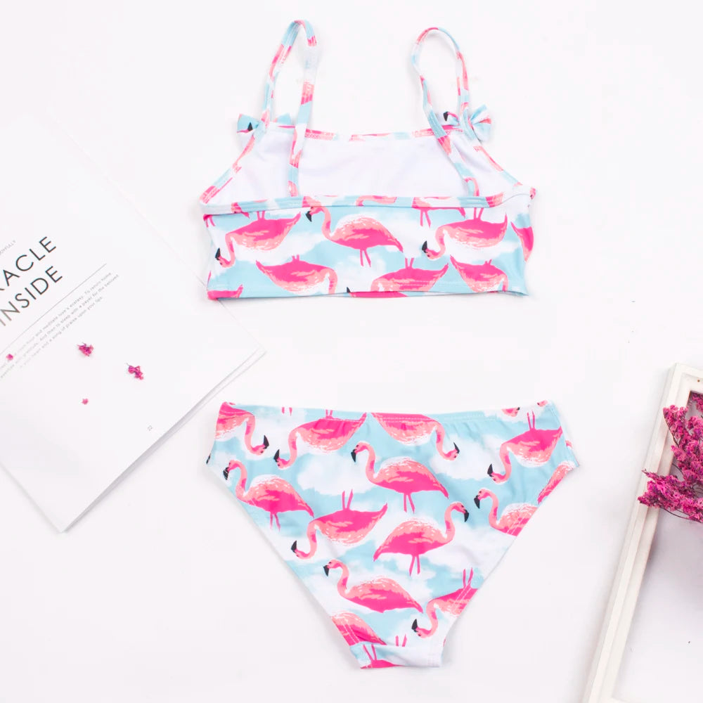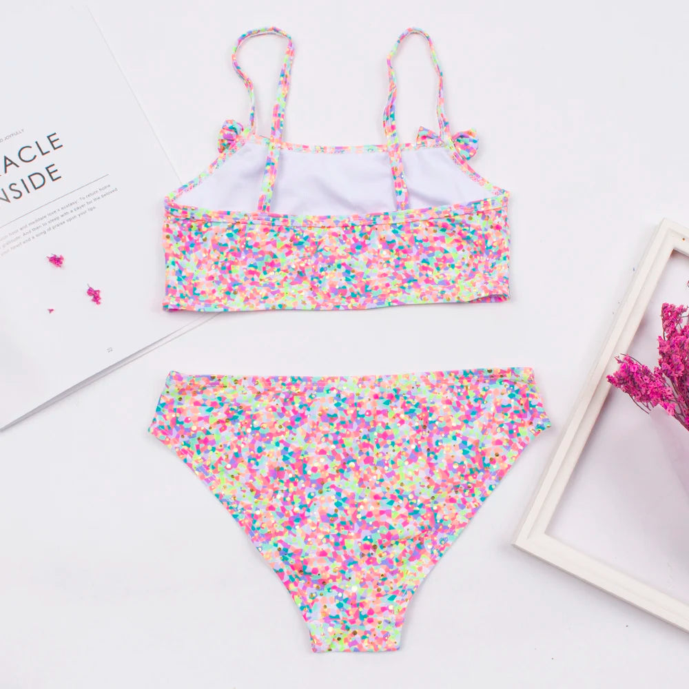 Design chic : Orné d'un charmant imprimé et d'un nœud décoratif, cet ensemble bikini ajoute une touche d'élégance à la collection de maillots de bain de votre enfant.