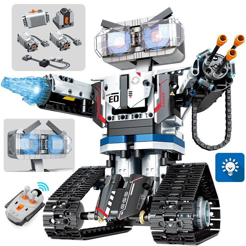 - Un robot radiocommandé ayant des sourcils mobiles, ainsi que des yeux et des avant-bras lumineux.