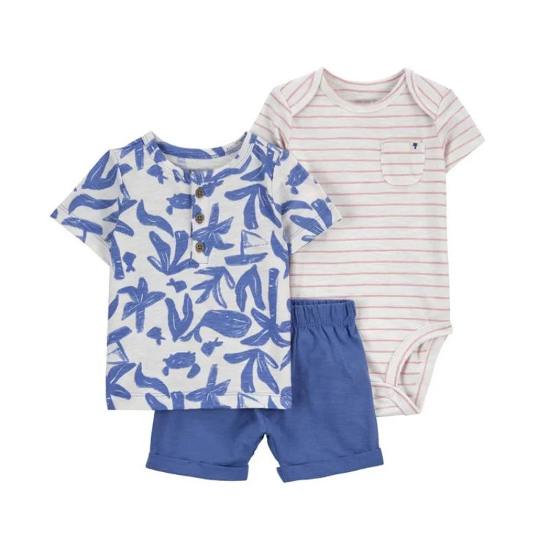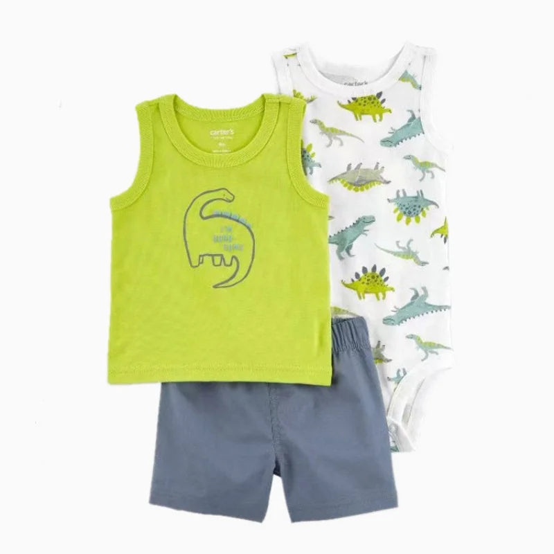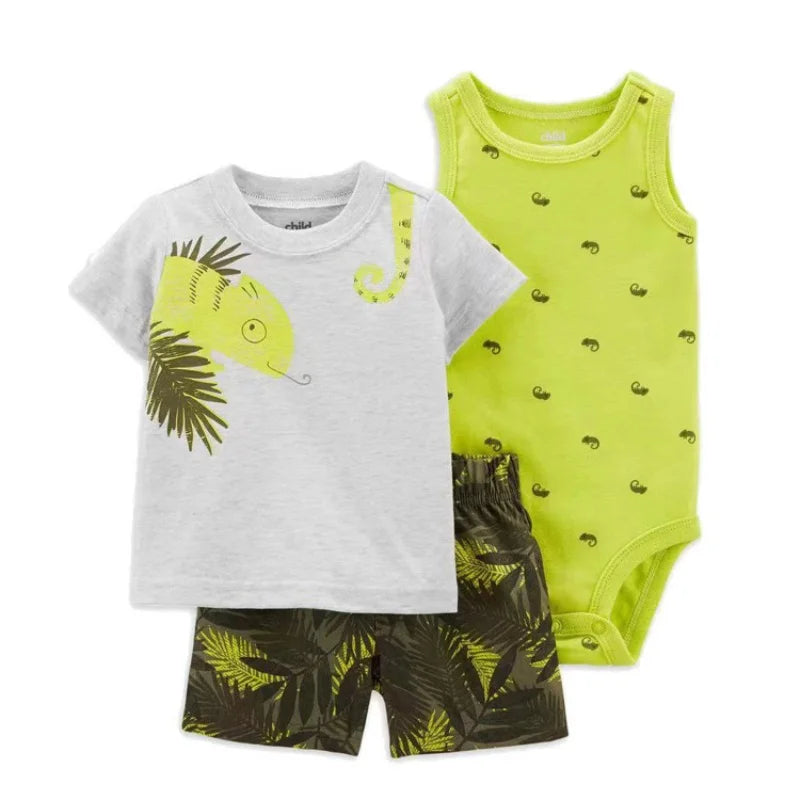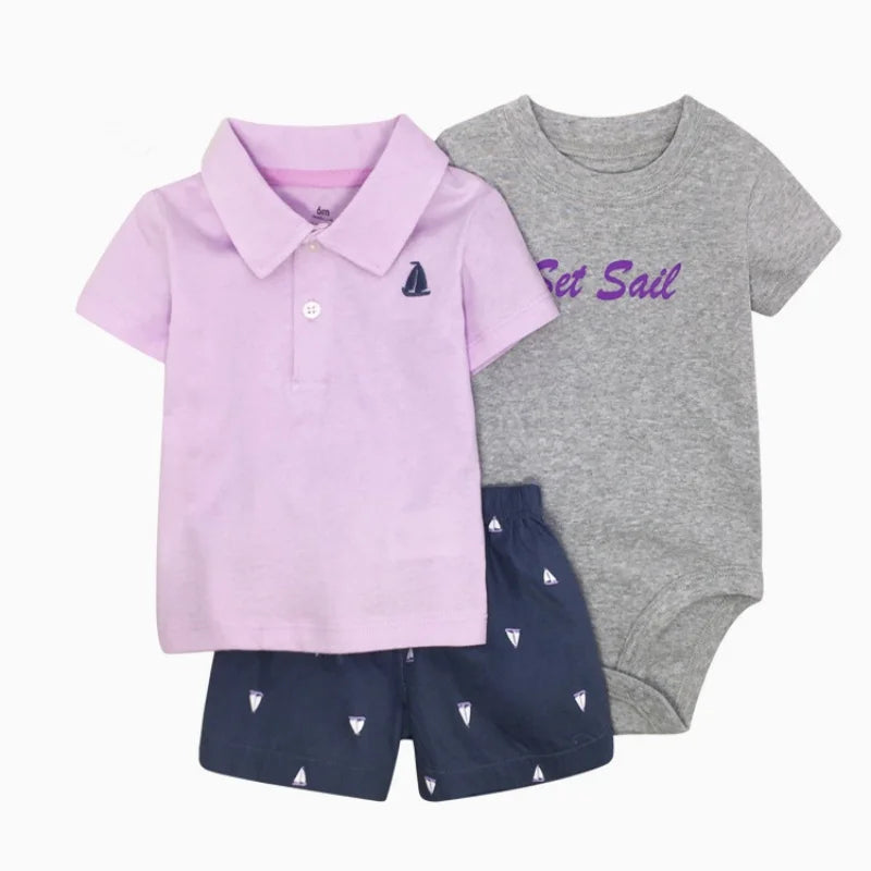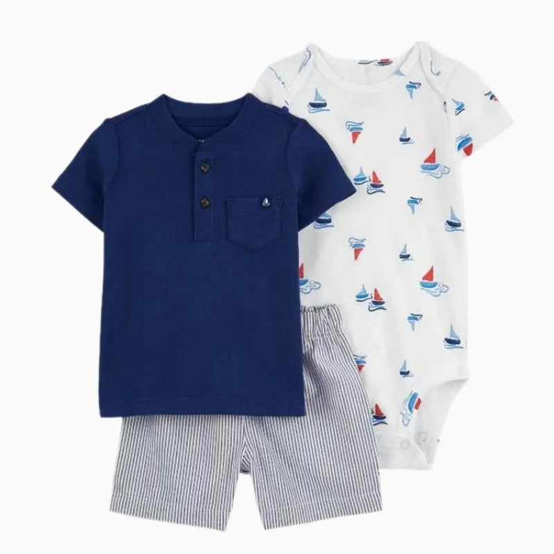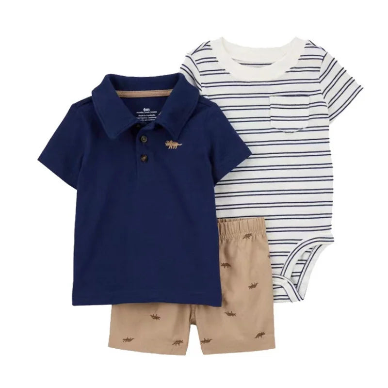 Ensemble d'été pour nouveau-né garçon | Ensemble 3 pièces en coton : t-shirt à manches courtes, short et body (6-24 mois)
