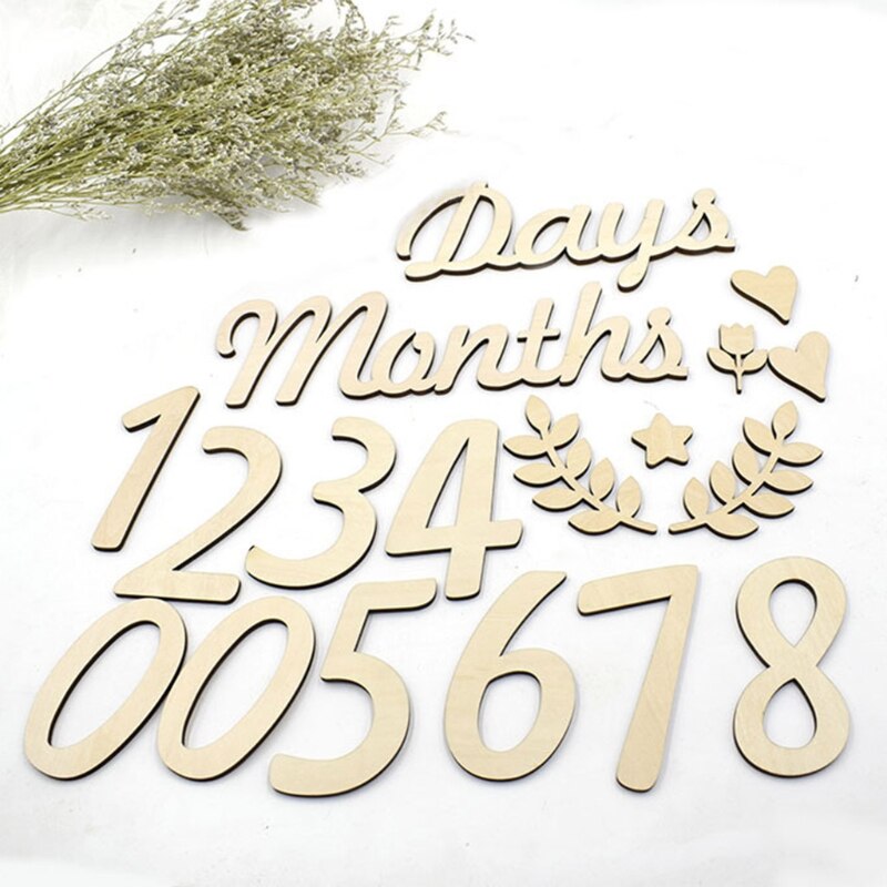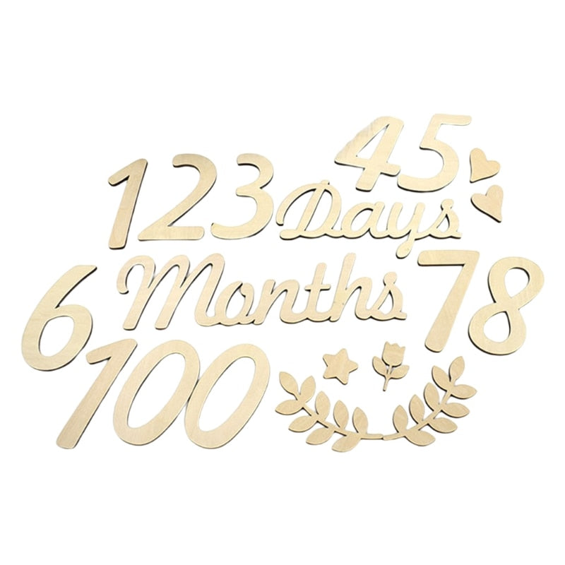 Cutouts include the word "days", "months", , numbers 0, 0, 1, 1, 2, 3, 4, 5, 6, 7, 8, 9, and 10 symbols which includes the "love" "star" "leaves" wooden cards. In total, this set includes 18 cutout cards. These beautifully designed Baby Milestone Markers are a unique baby shower gift for expecting mothers and a great addition to any gift registry.