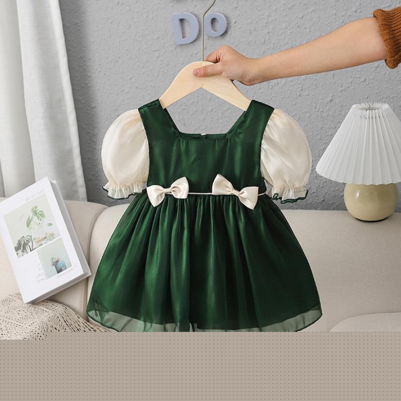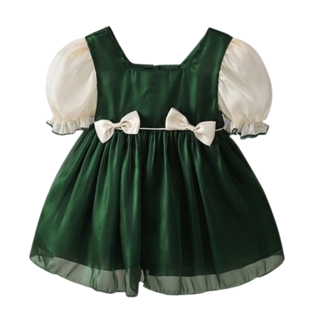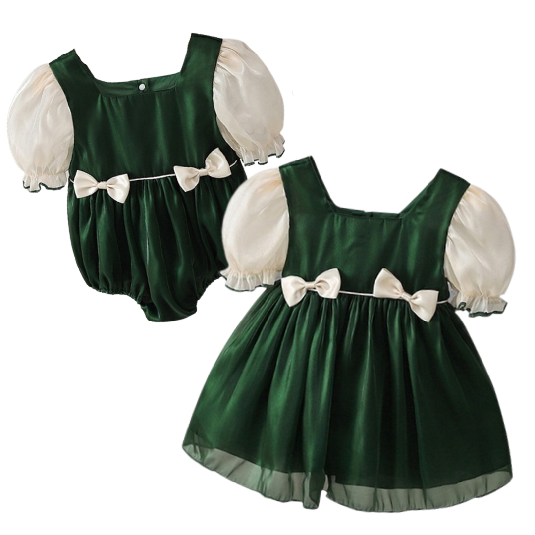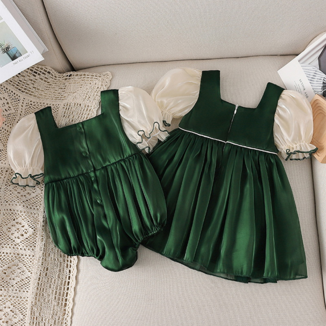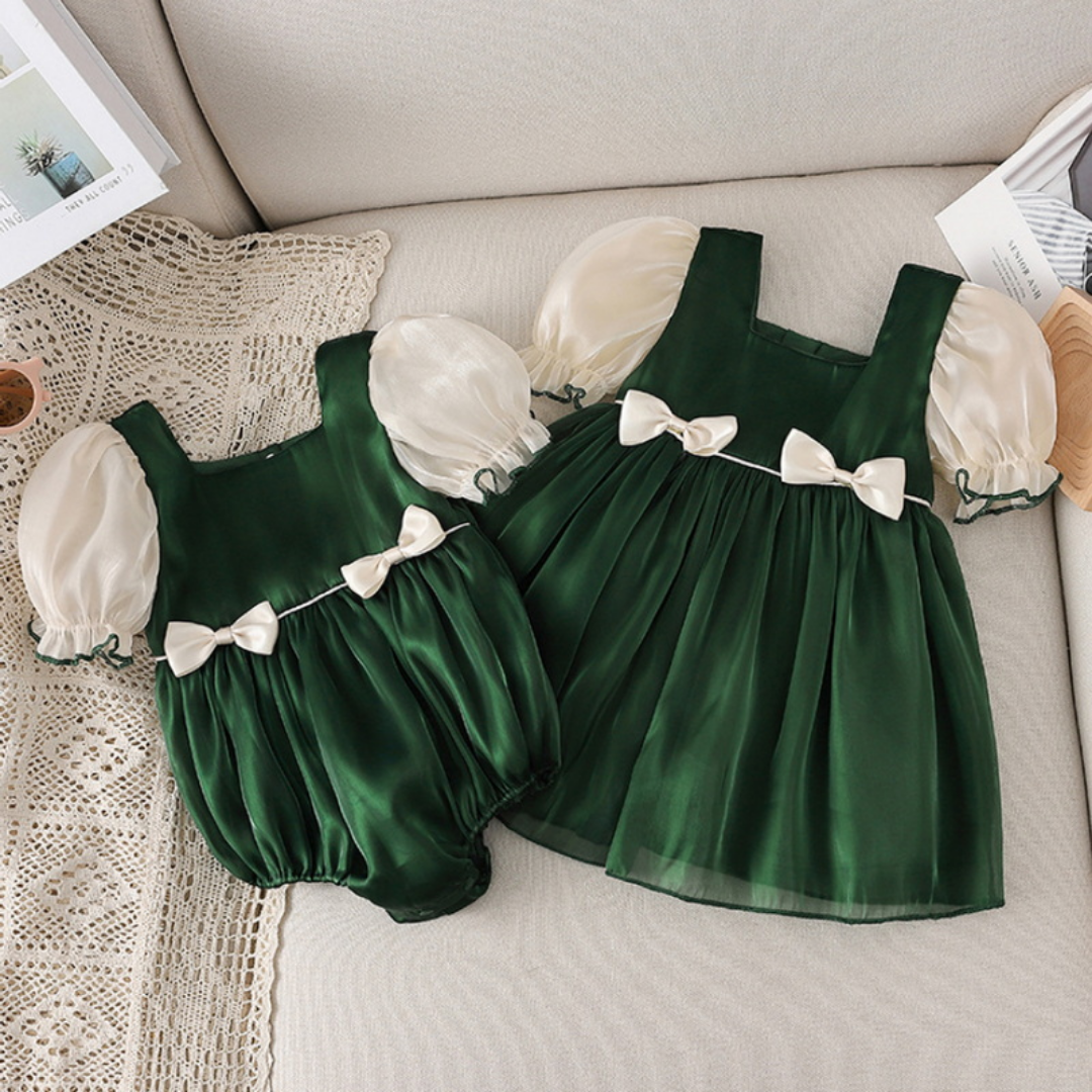 This Bow Design and Puff Sleeves Siblings Matching Outfit features a European fashion design look with a white bow accent and puff sleeves style that complements the silky green fabric. A perfect fashion outfit for little and big sisters in their first photo shoot or birthday party together.