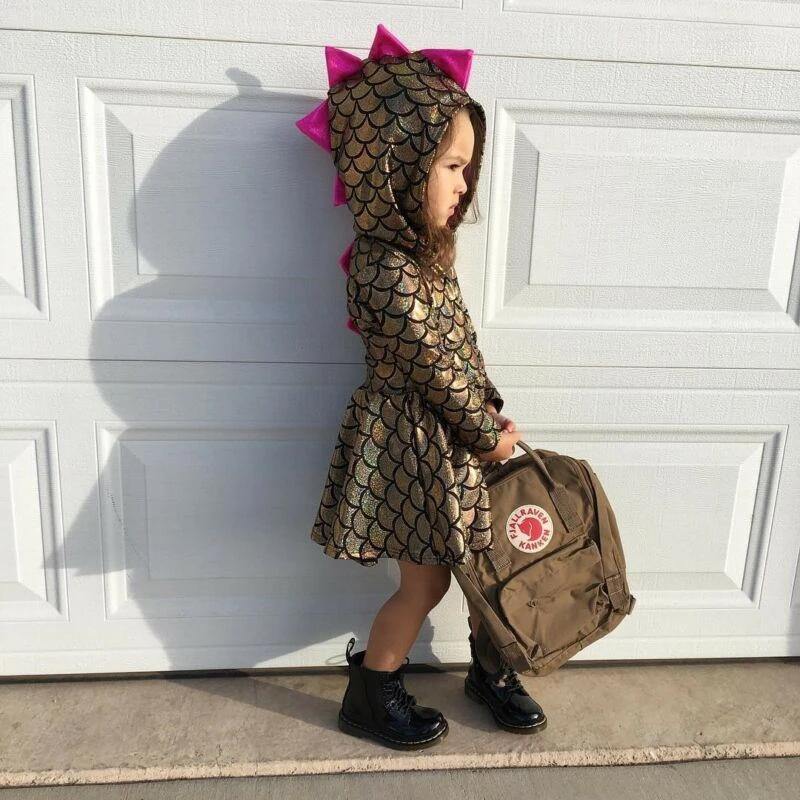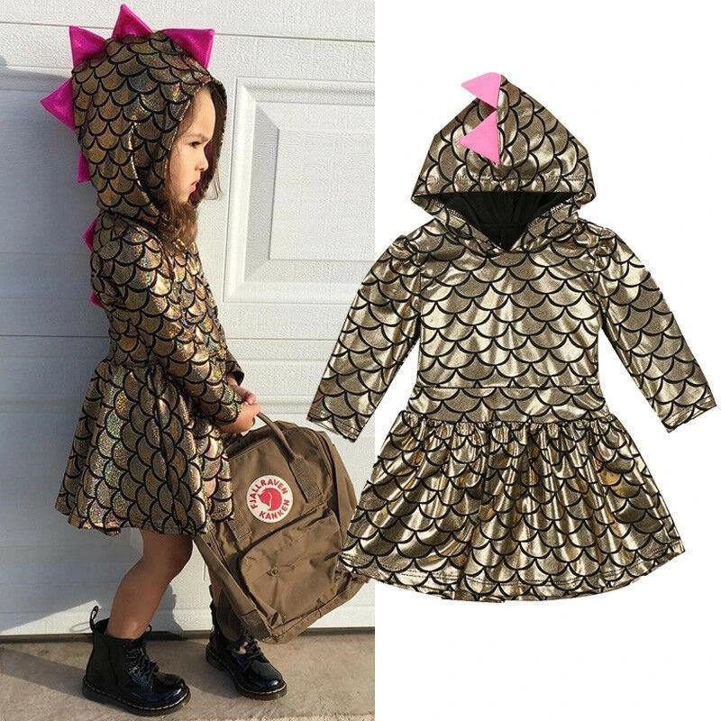 Dinosaur Hooded Dress is a stylish outfit for girls. The shimmering gold fabric stands out in a unique way and draws the attention of everyone around!