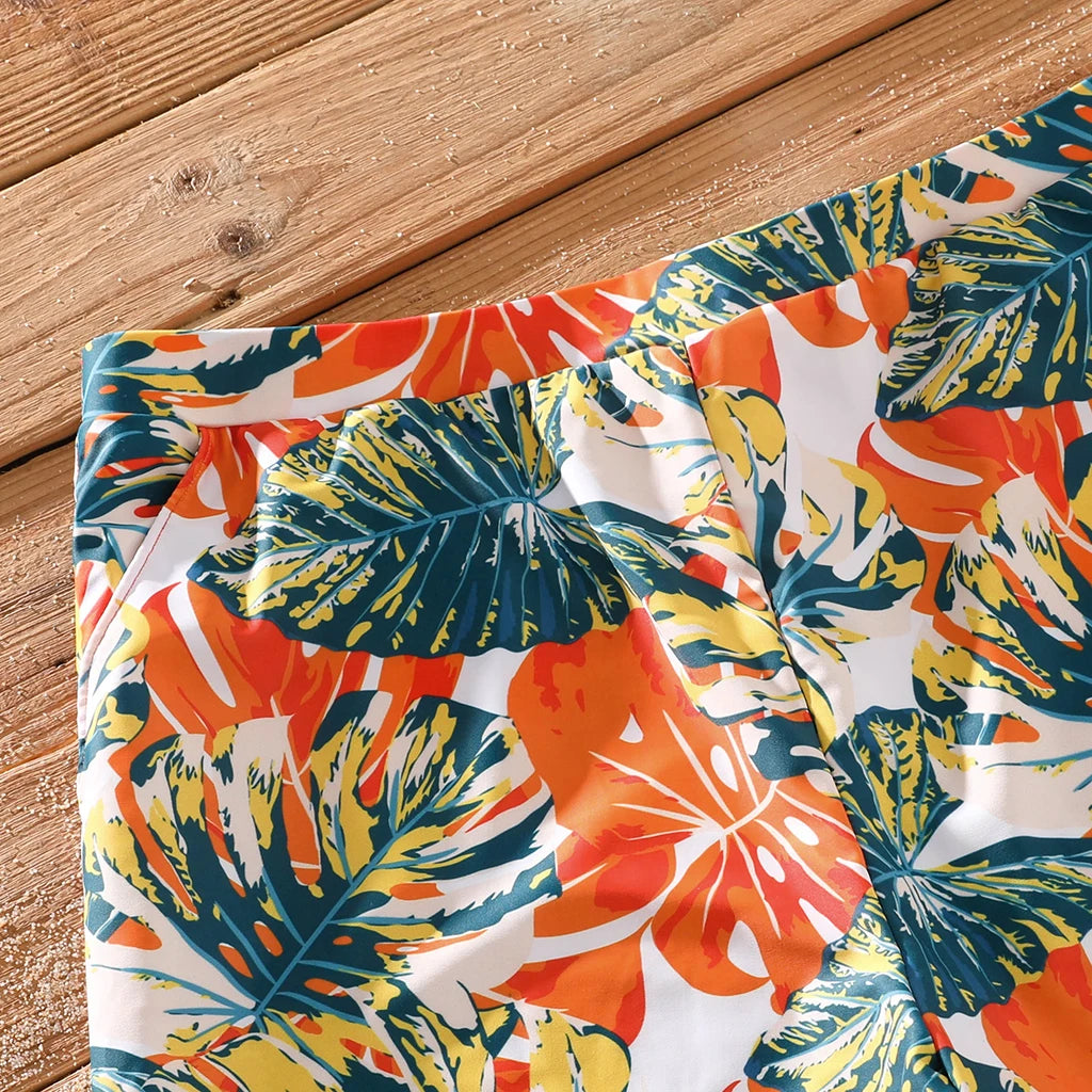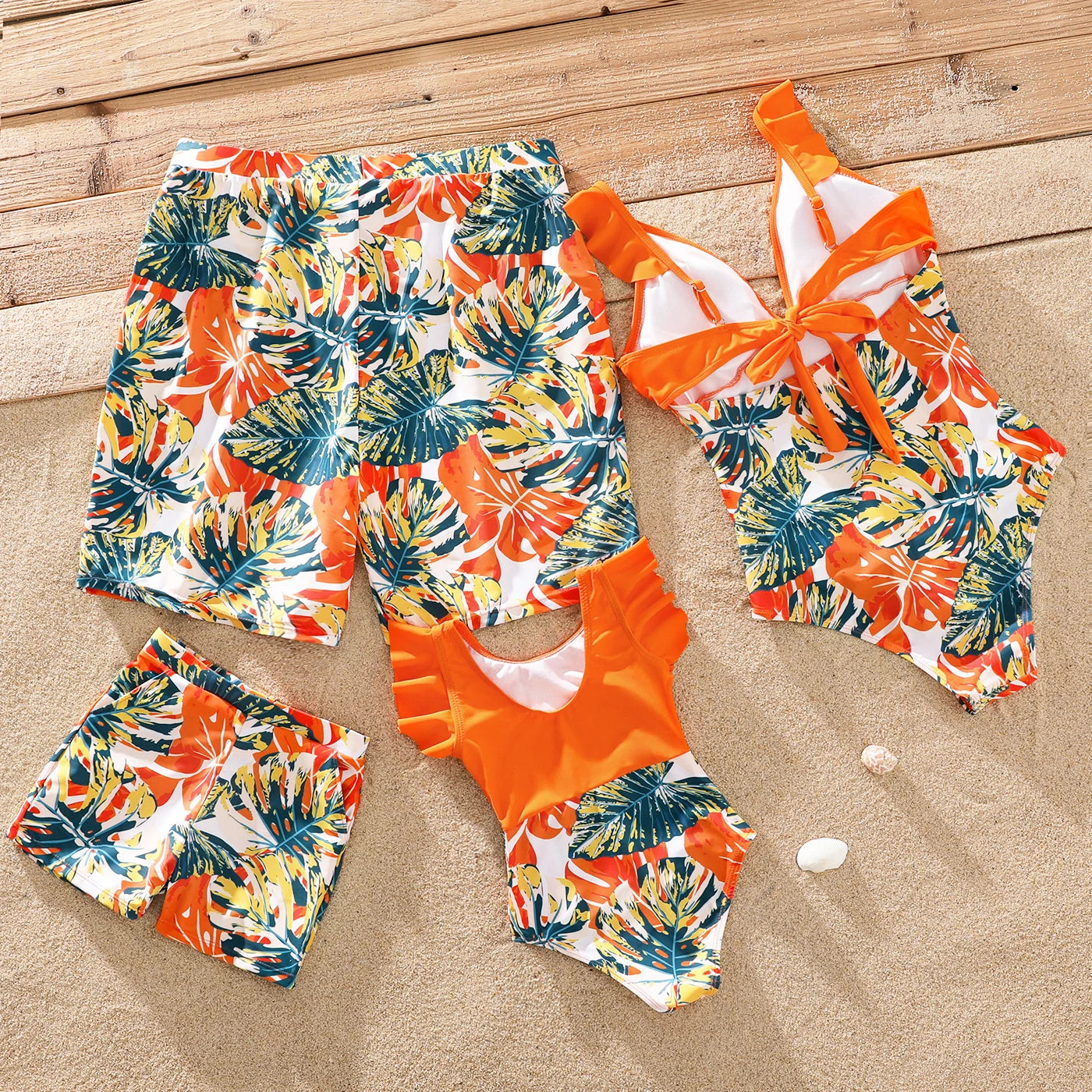 Product Introduction: Embark on a stylish aquatic adventure with our Family Matching Orange Tropical Plant Print Swim Set. This one-piece swimsuit and swim trunks shorts ensemble are designed to make a splash, creating unforgettable memories during sunny vacations, beach outings, and lively pool parties.