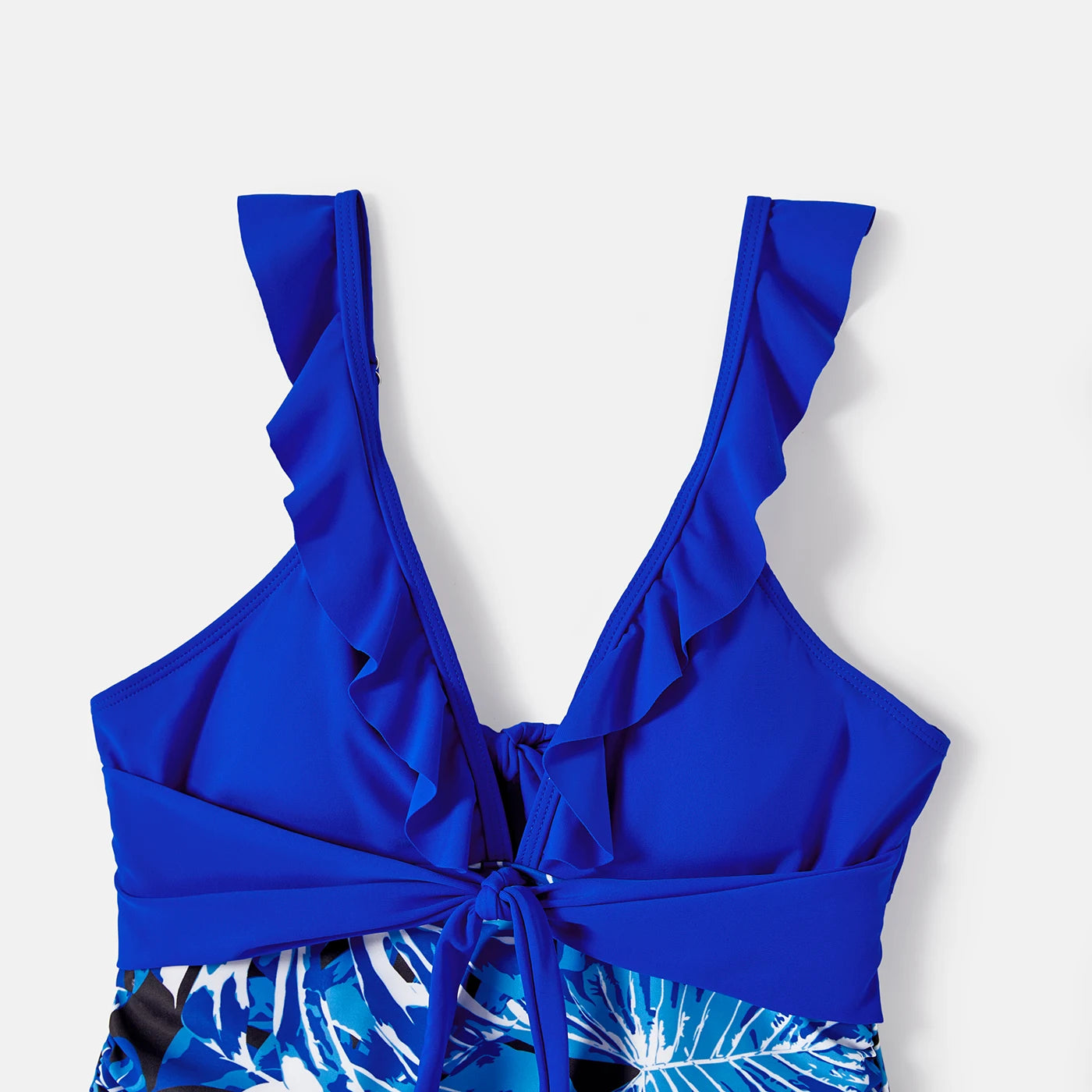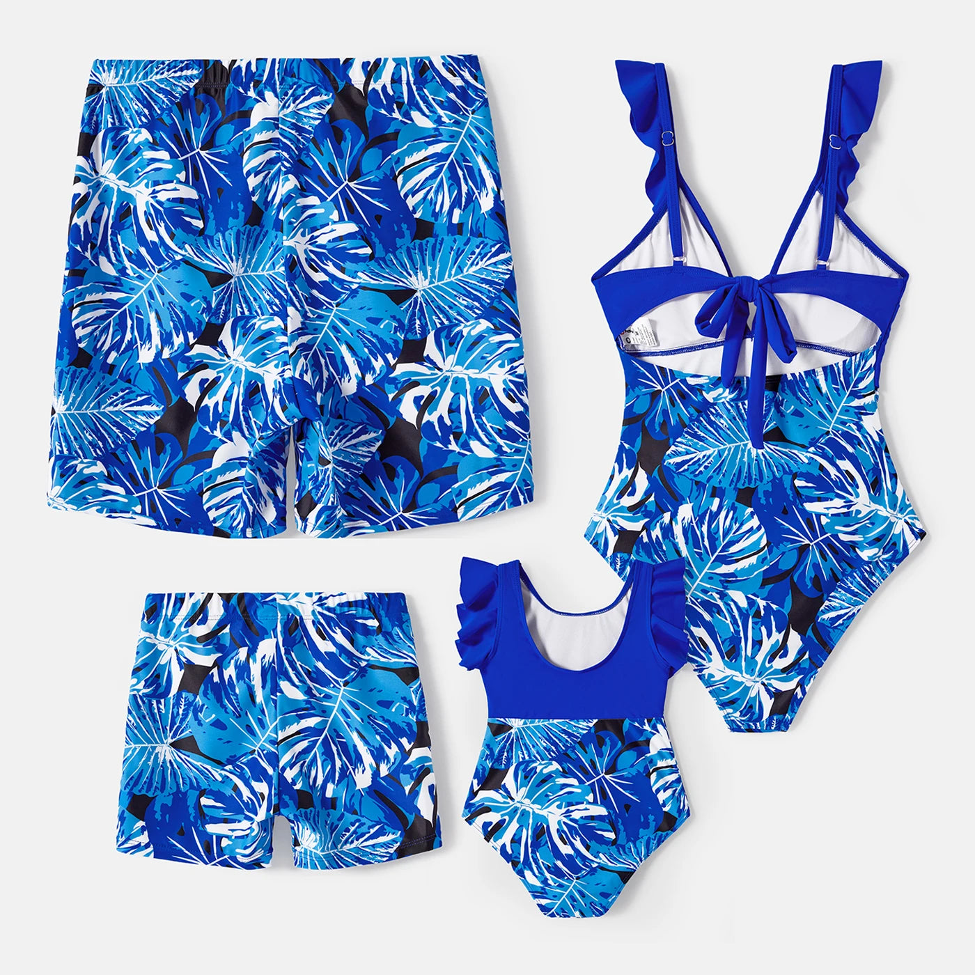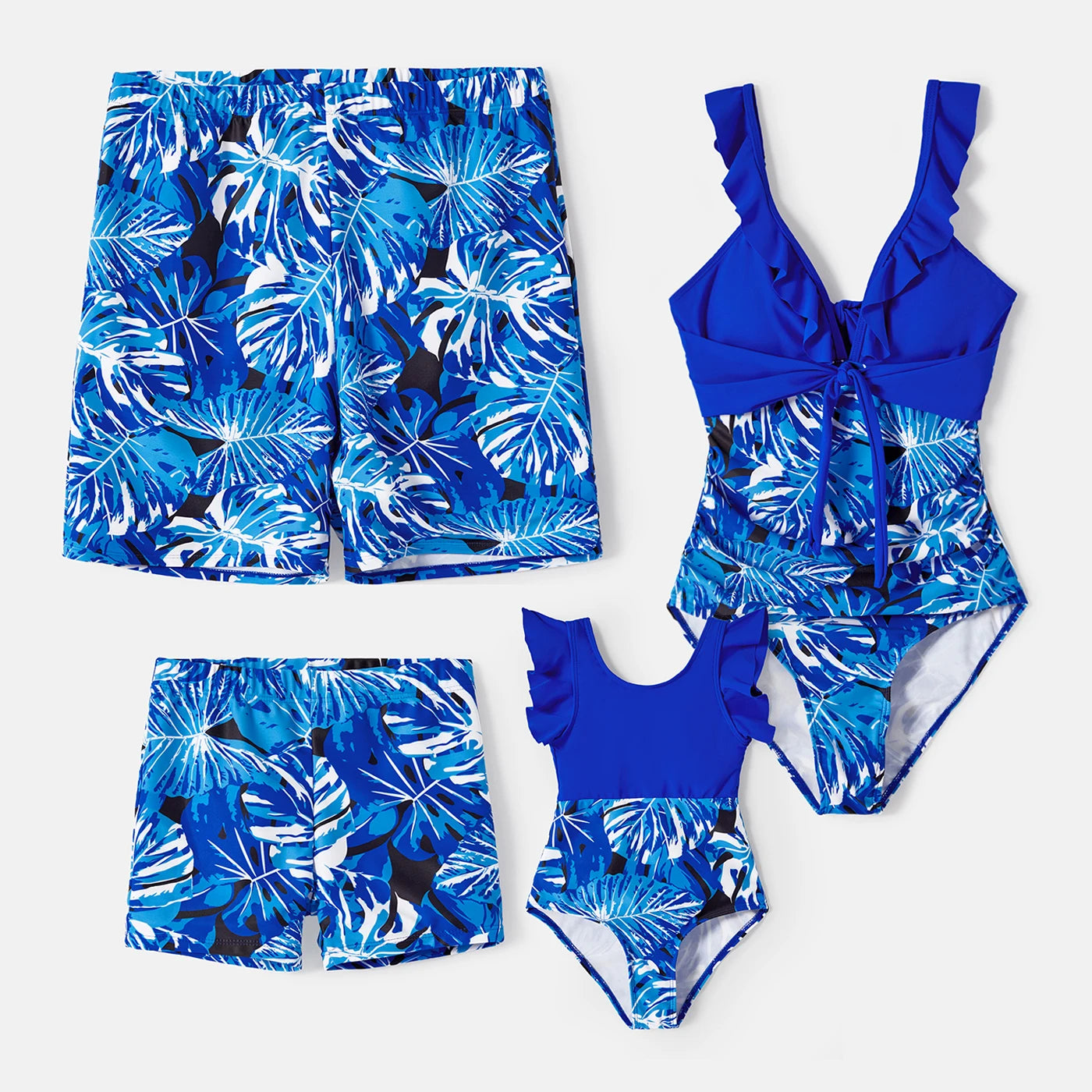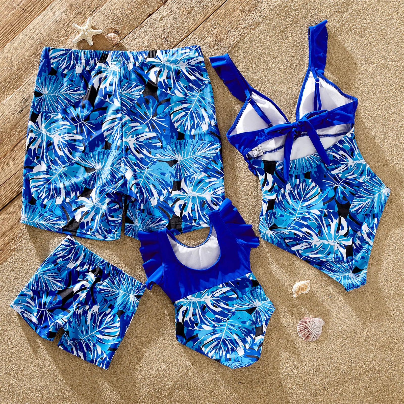 Product Introduction: Unveil a new level of family fashion with our exquisite Family Matching Plant Print Swim Trunks and Blue Ruffle Trim Spliced One-piece Swimsuit. This stylish swimwear set promises to make your family stand out on any sunny day.