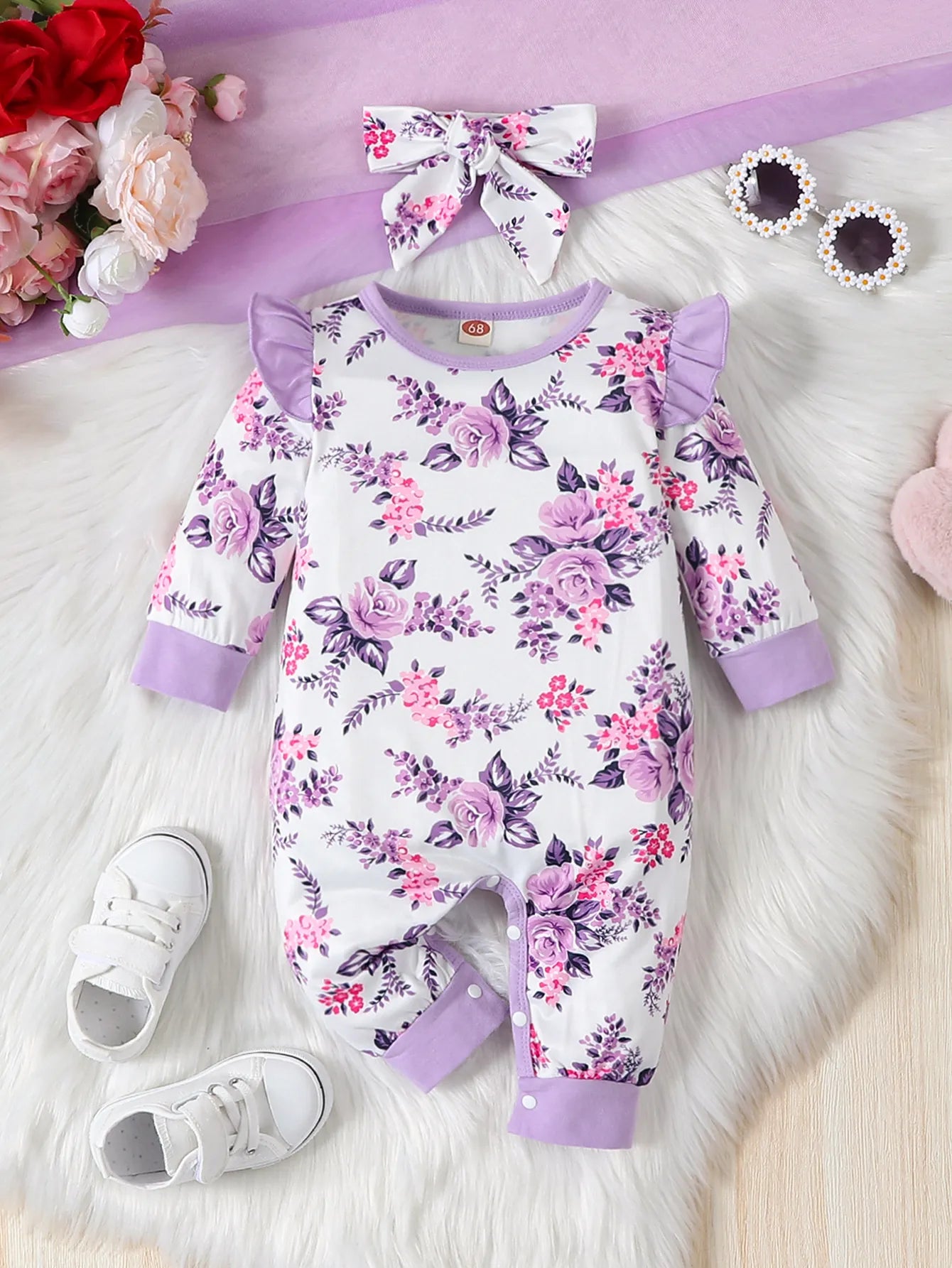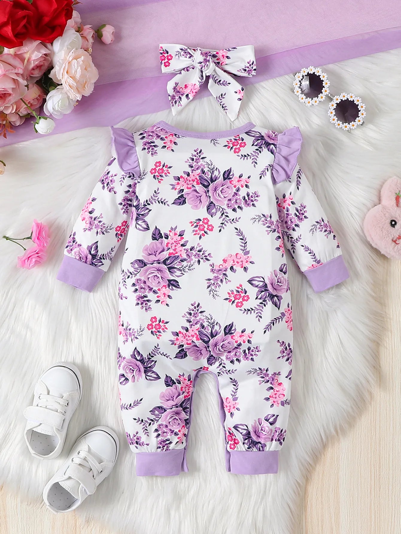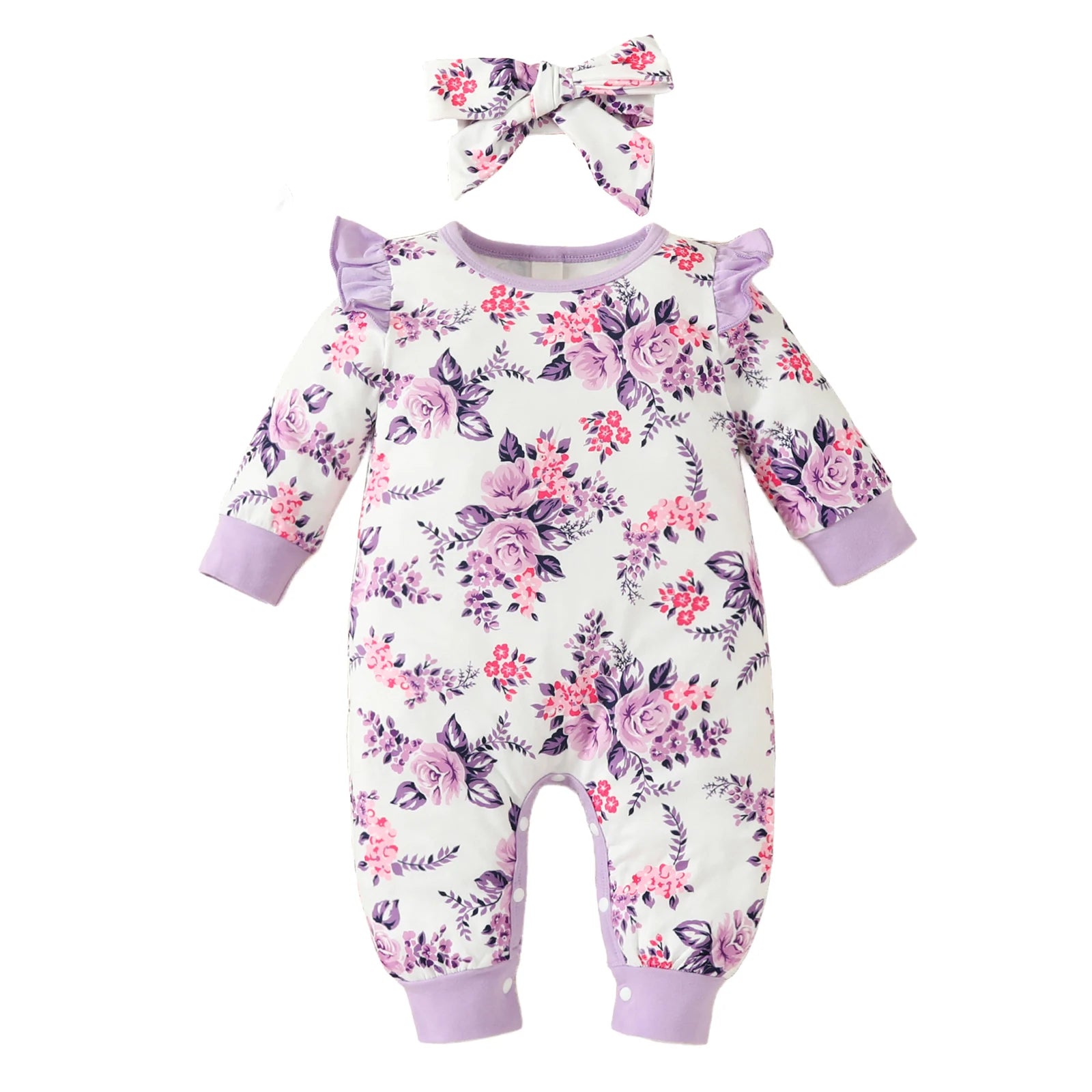 Floral Print Rompers Set for Newborn Girls with Bow Hairband