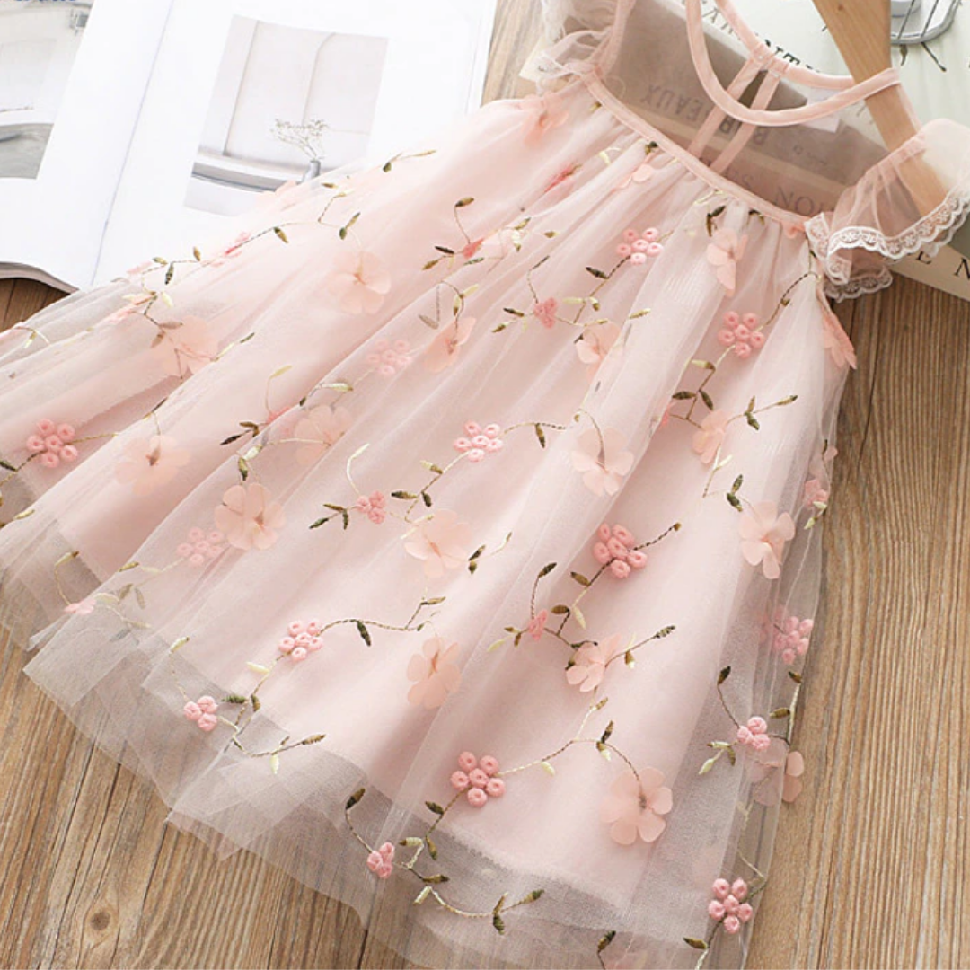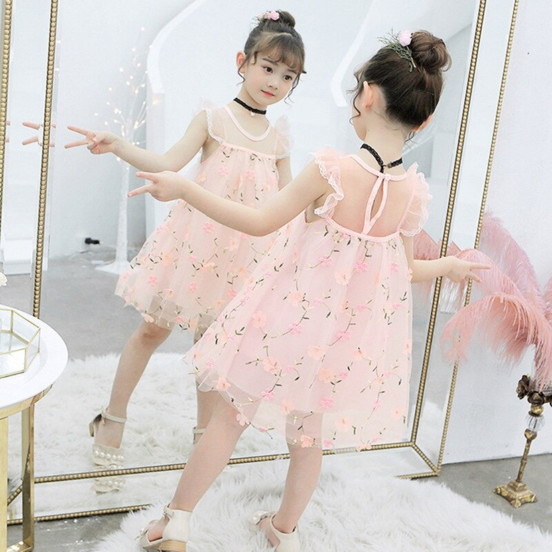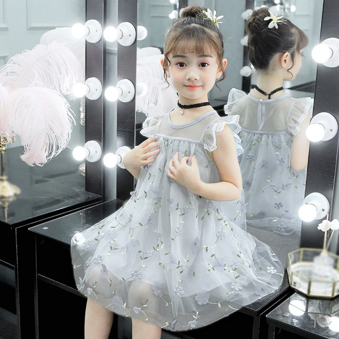 Flying Sleeve Floral Embroidery Girls Summer Mesh Dress