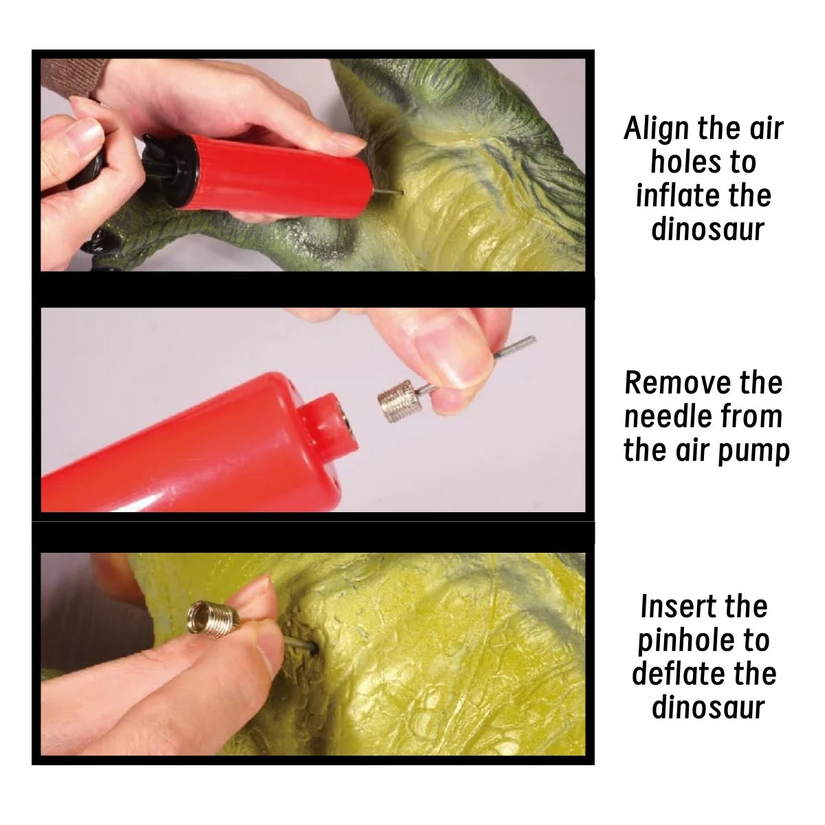 To Inflate: Align the air holes to inflate the dinosaur (using the included needle pump).