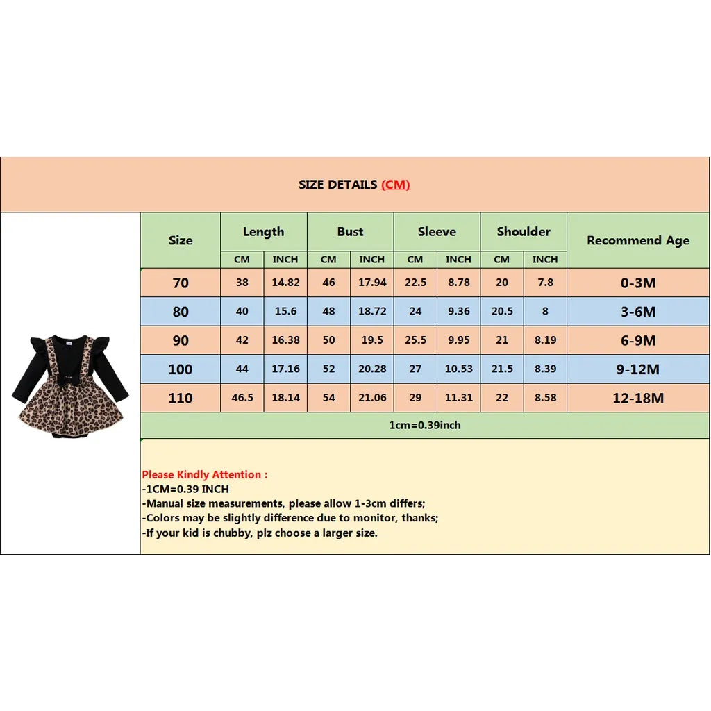 Dress your newborn to 18-month-old baby girl adorably with our Leopard Print Romper Dress. This charming piece combines comfort, style, and a hint of playfulness, making it the perfect choice for the spring and autumn seasons.