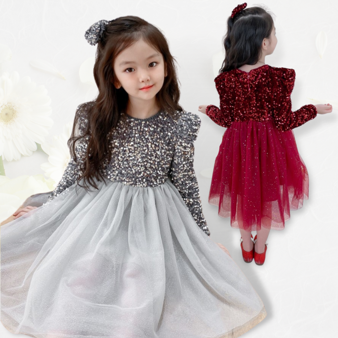 This Long Sleeves Sequin Top Glimmering Princess Party Dress is made of high-quality fabric, very soft and comfortable to wear. It is suitable for girls' birthday parties, Christmas Day, or New Year's Eve. The shining sequins on the top will make your girl look like a princess in this dress.