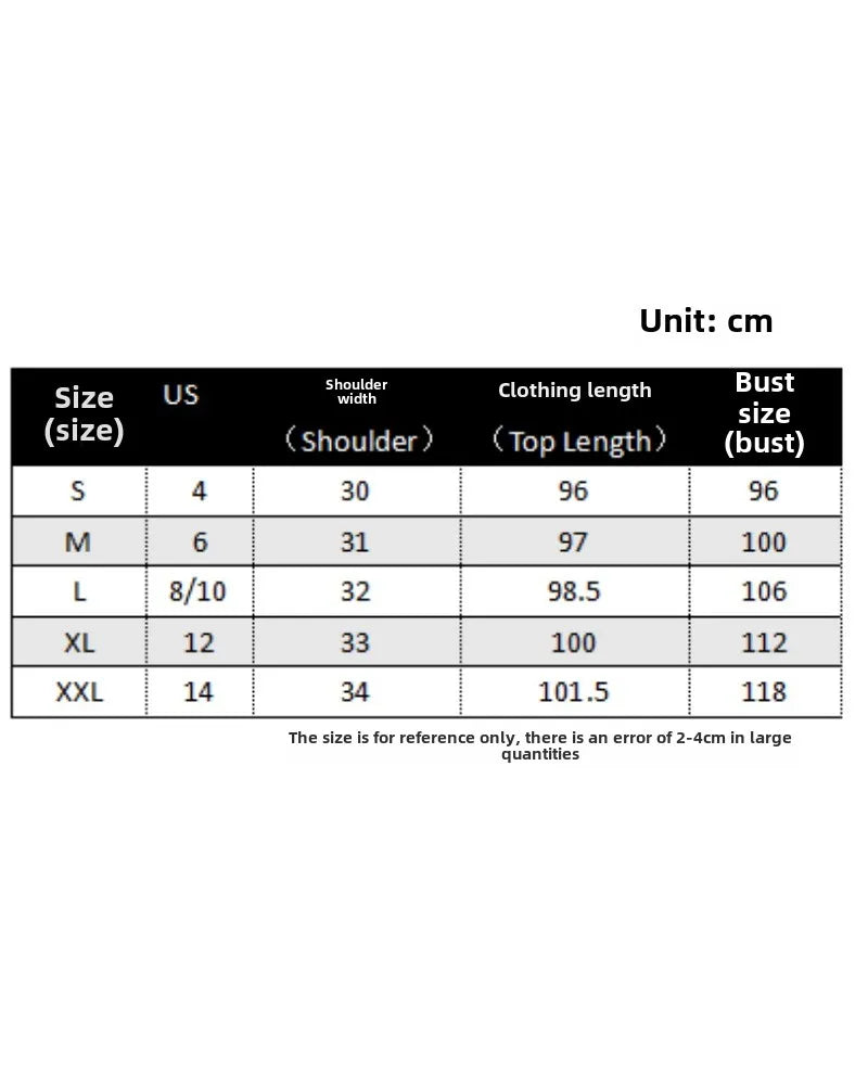Size | Height (in/cm) | Weight (lbs/kg) | Bust (in/cm) | Sleeve (in/cm) | Shoulder (in/cm) | Length (in/cm) |