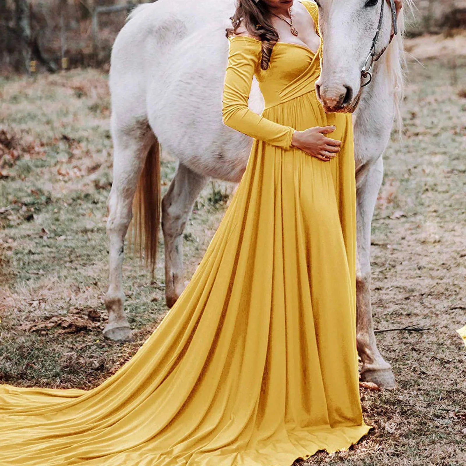 Maternity Off Shoulder Long Sleeve Dress – Elegant Solid Color Gown for Photography & Special Occasions