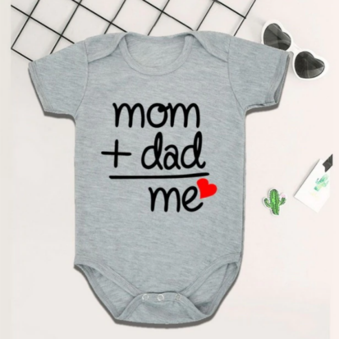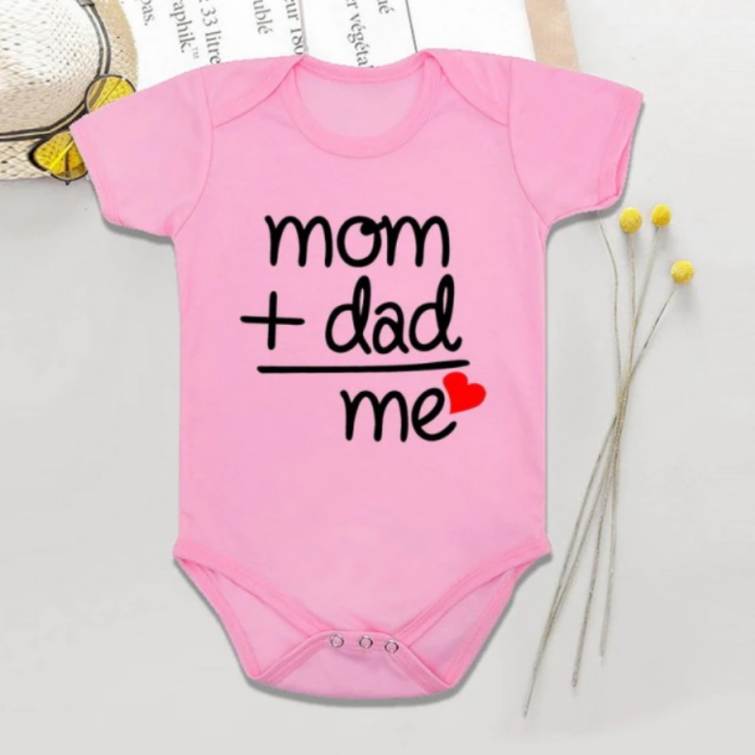 This super cute Mom+Dad Equals Me Baby Romper is easy to combine and looks adorable. Comes in 3 colors, and, fits perfectly on your little munchkin. Very soft and comfortable for everyday use.