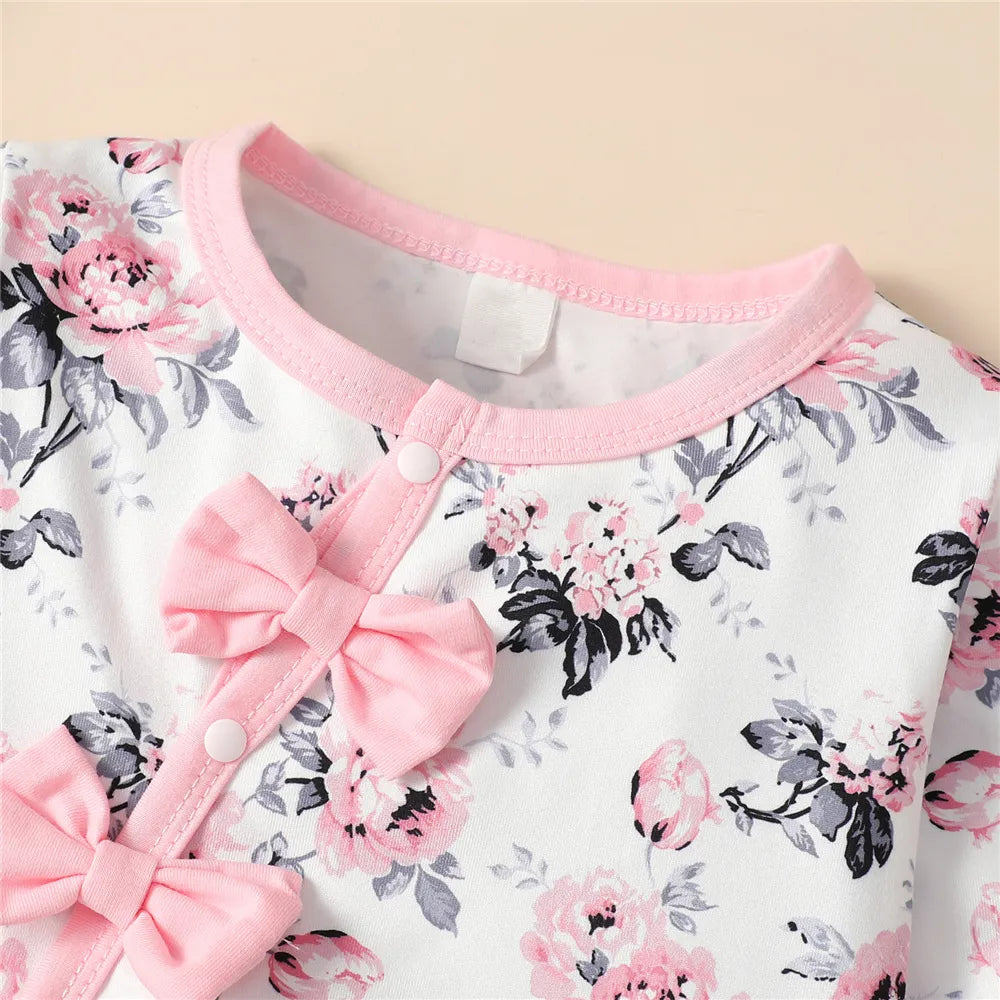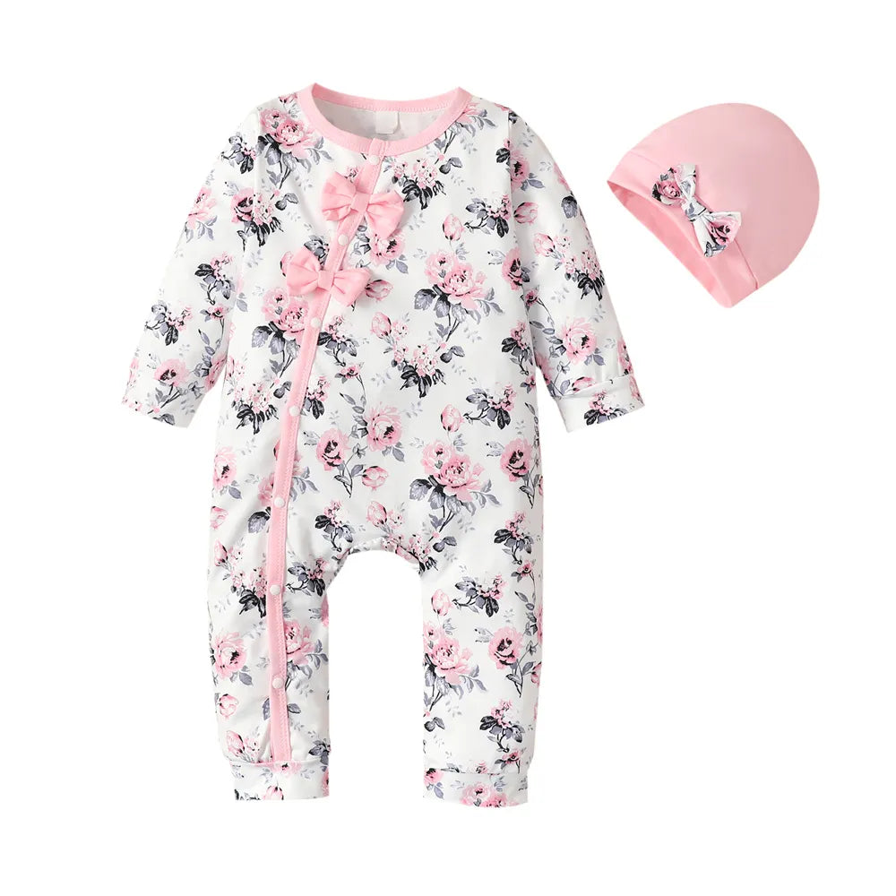 Elevate your newborn baby girl's wardrobe with our delightful Flower Romper accompanied by a matching hat. Tailored for ages newborn to 24 months, this set is a harmonious blend of comfort and style, making it an ideal choice for the spring and autumn seasons.