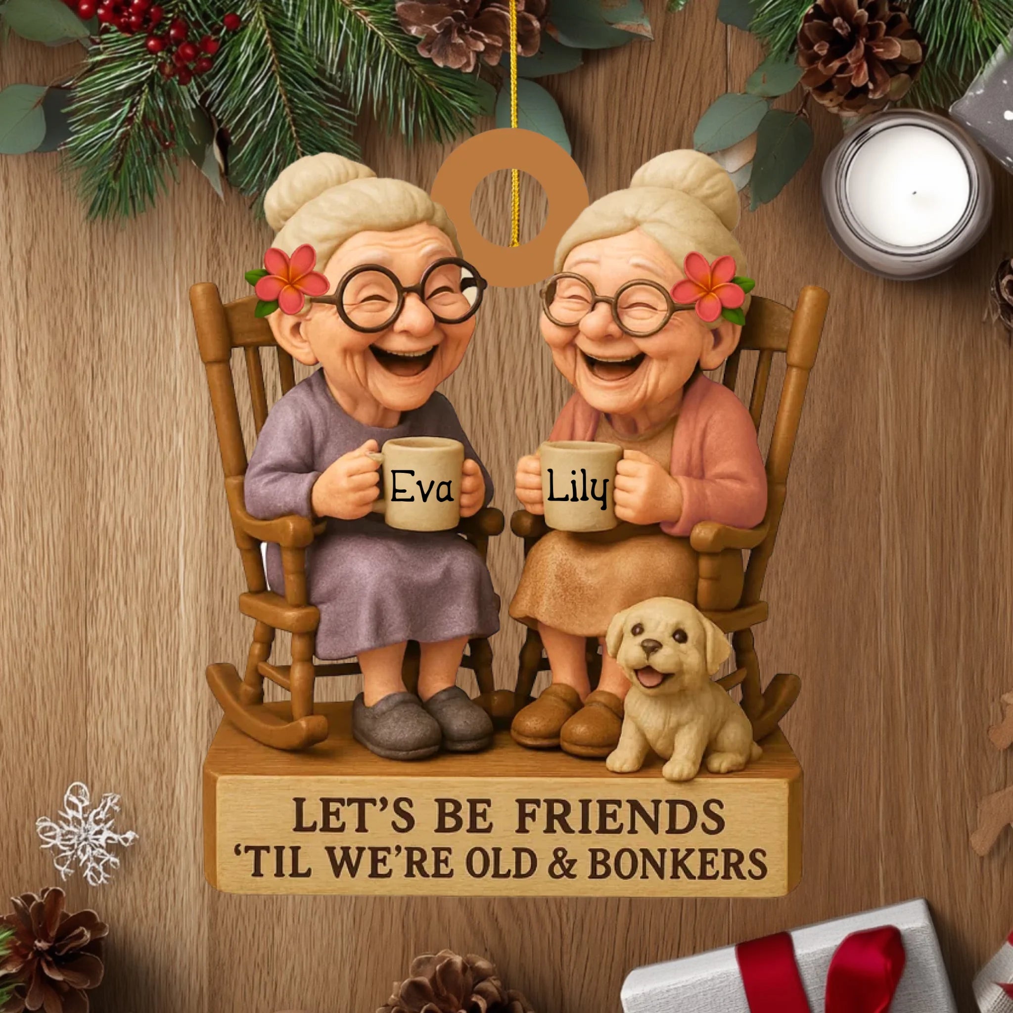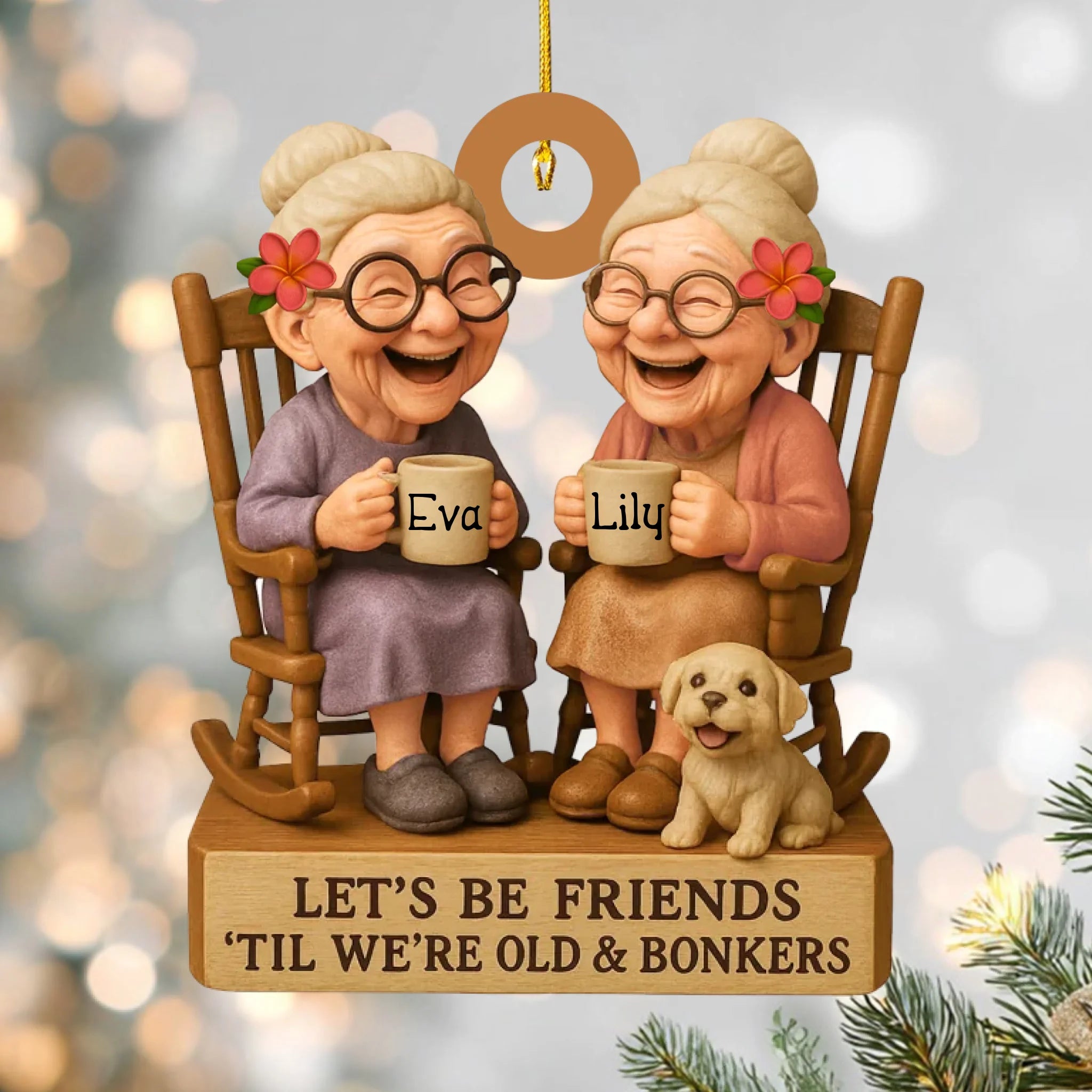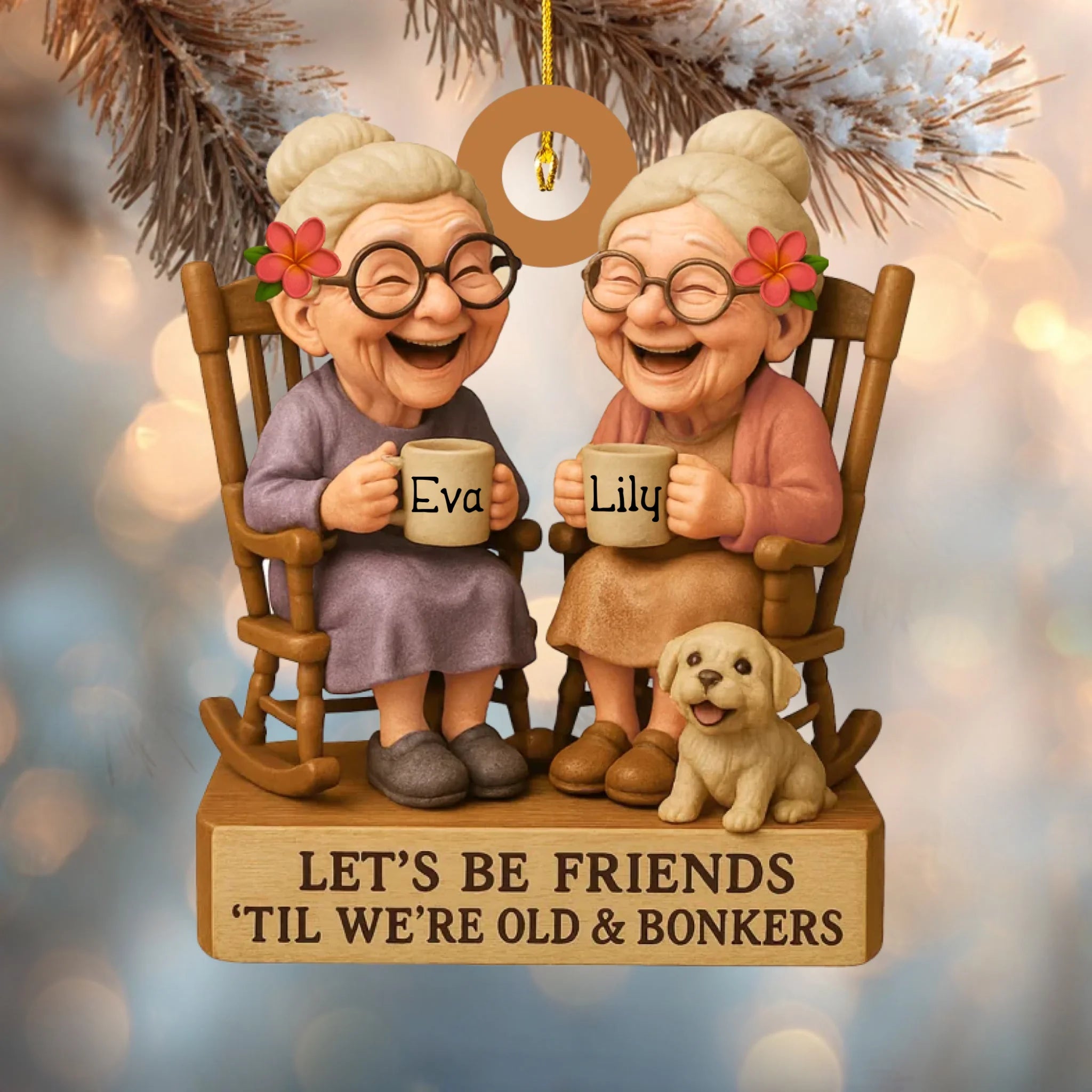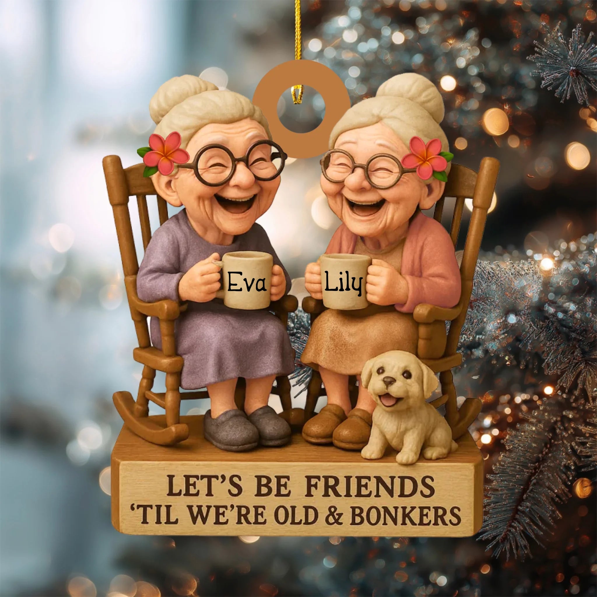 This delightful ornament features two giggling old ladies sitting in rocking chairs, each holding a custom name mug, with an adorable puppy at their feet — a charming symbol of friendship, inside jokes, and growing old together in the funniest way. Whether you’ve been friends since childhood or became close later in life, this ornament is a tribute to the bond that never fades.