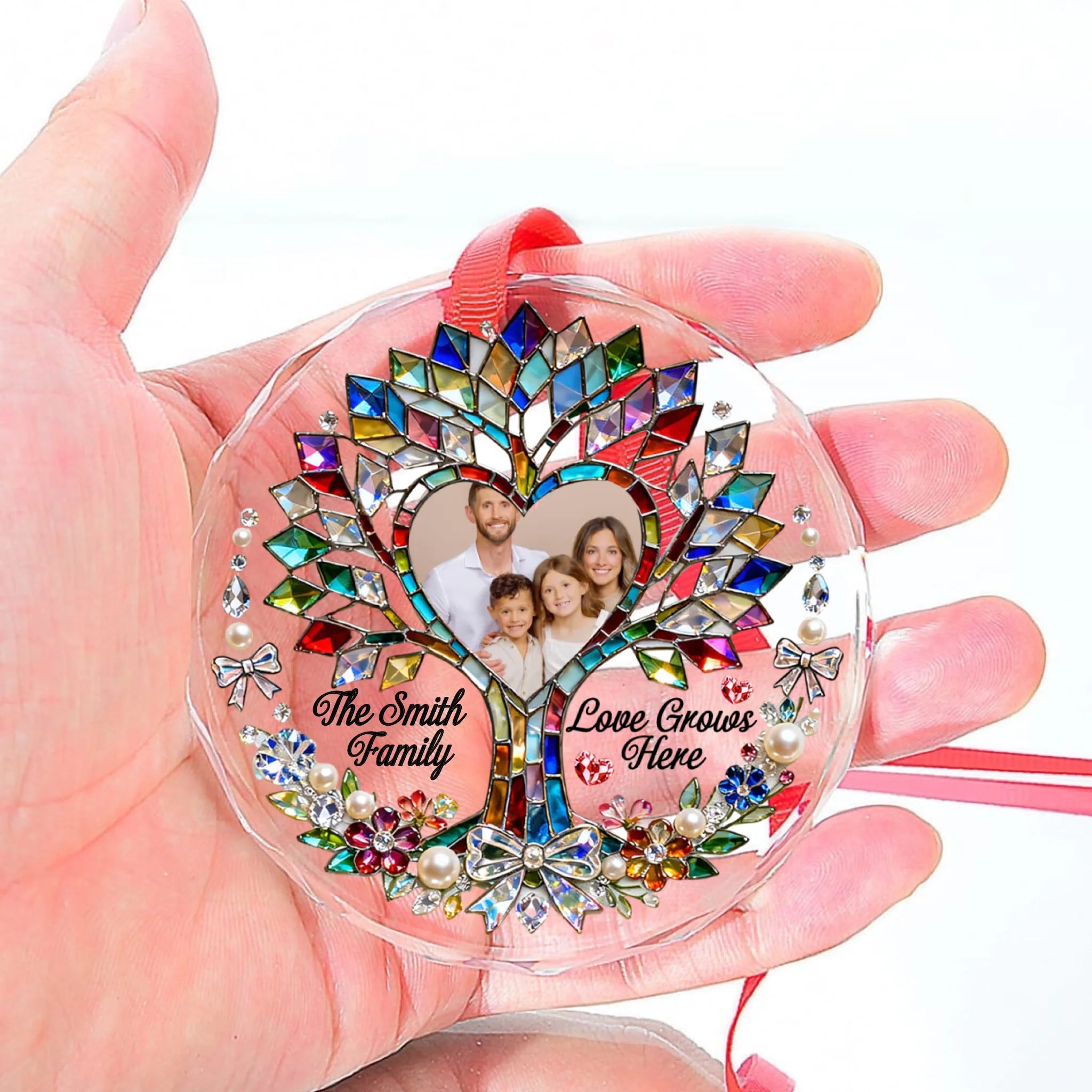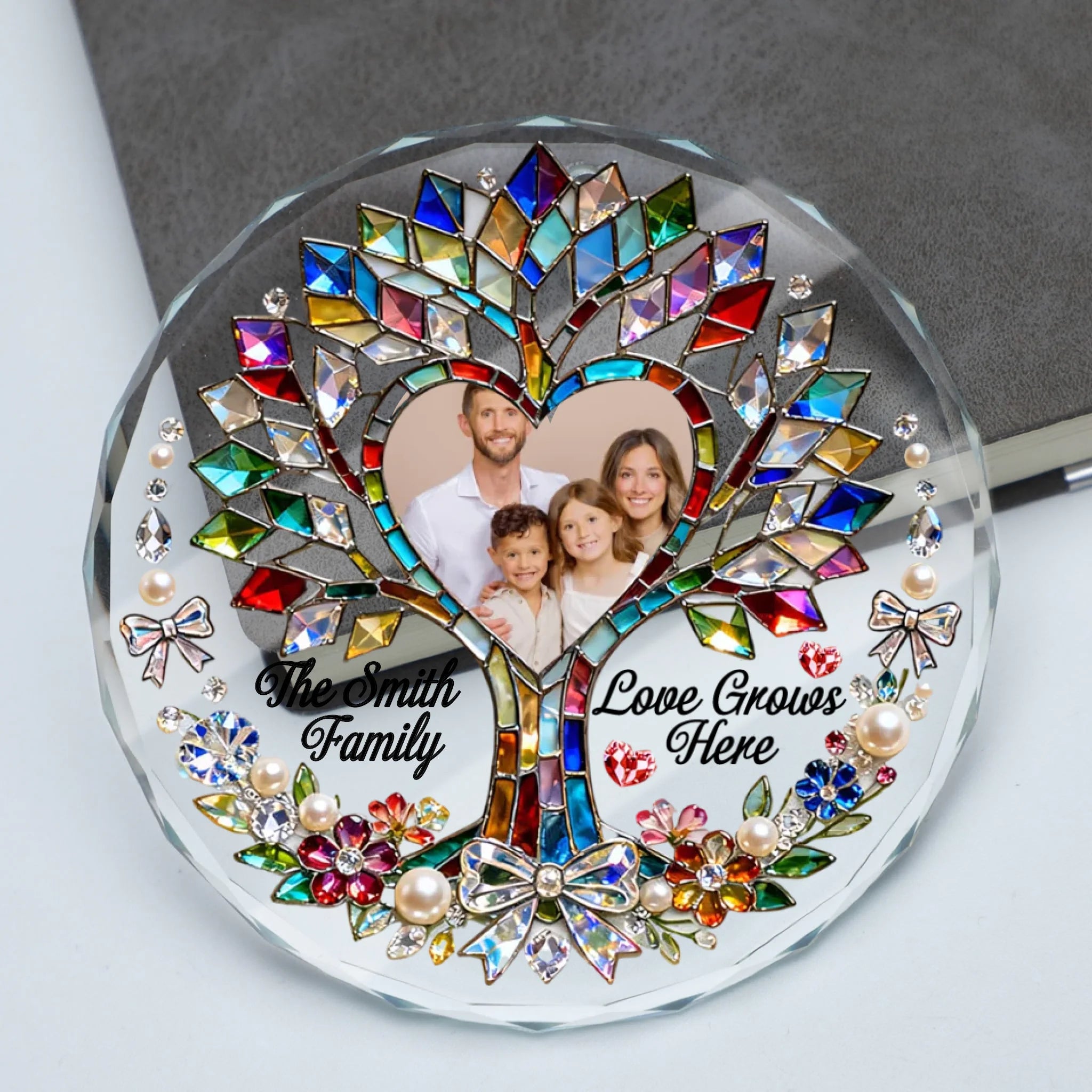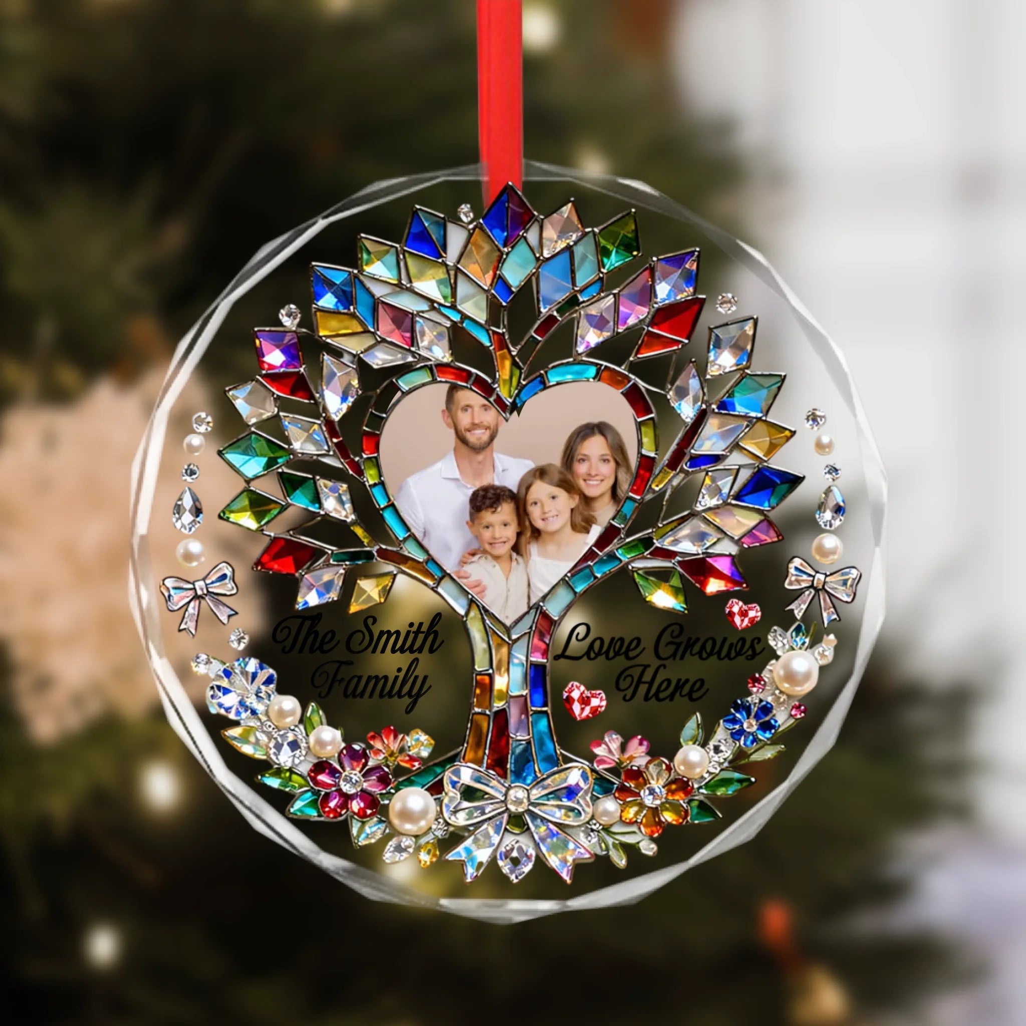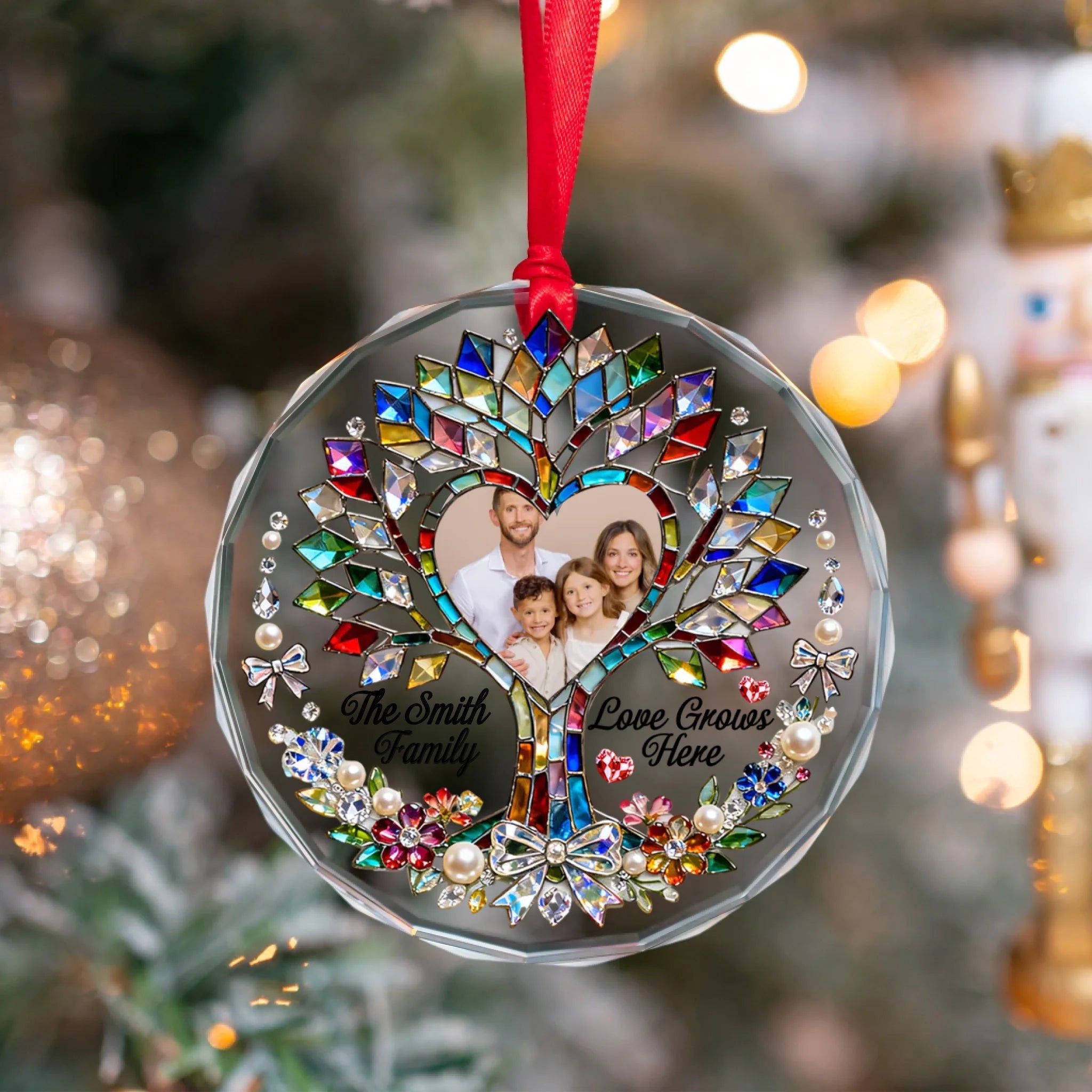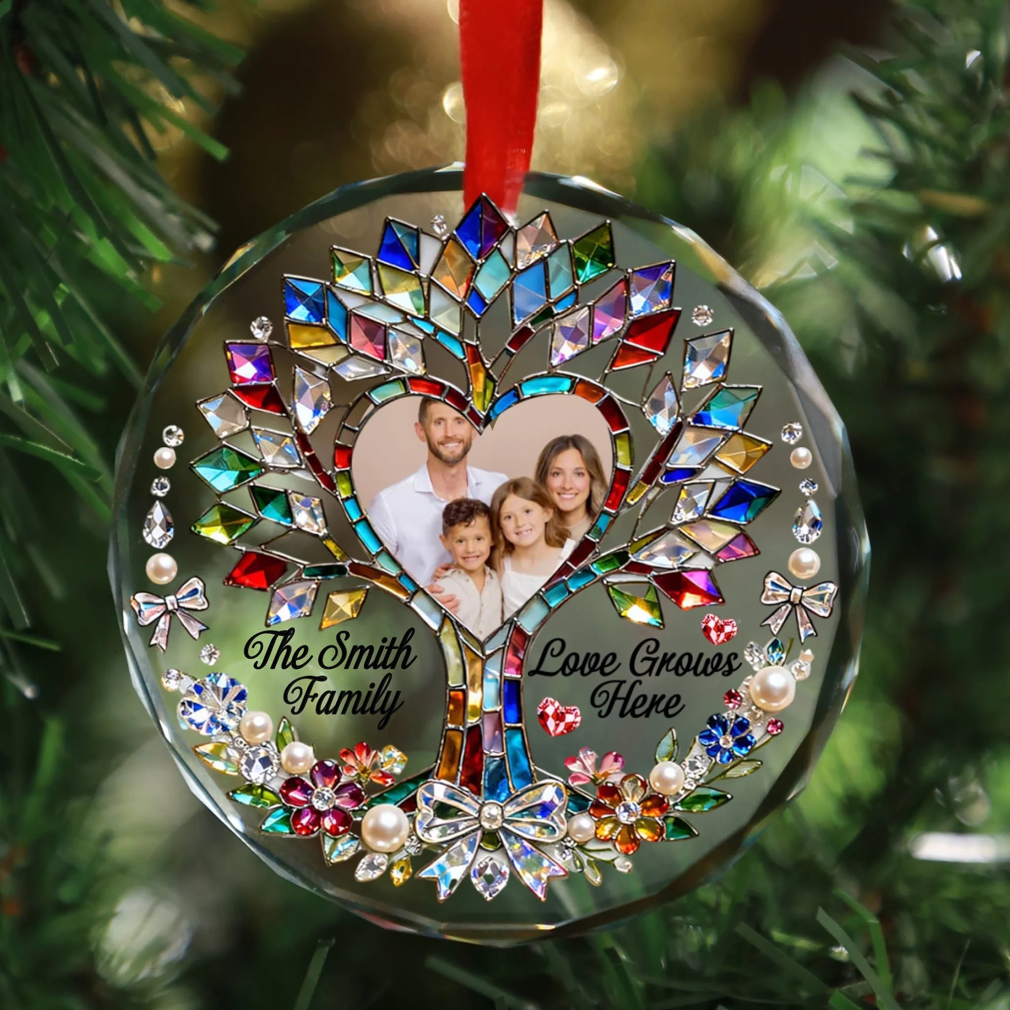 Personalized Family Tree Round Glass Ornament – Custom Photo “Love Grows Here” Crystal Christmas Keepsake Gift